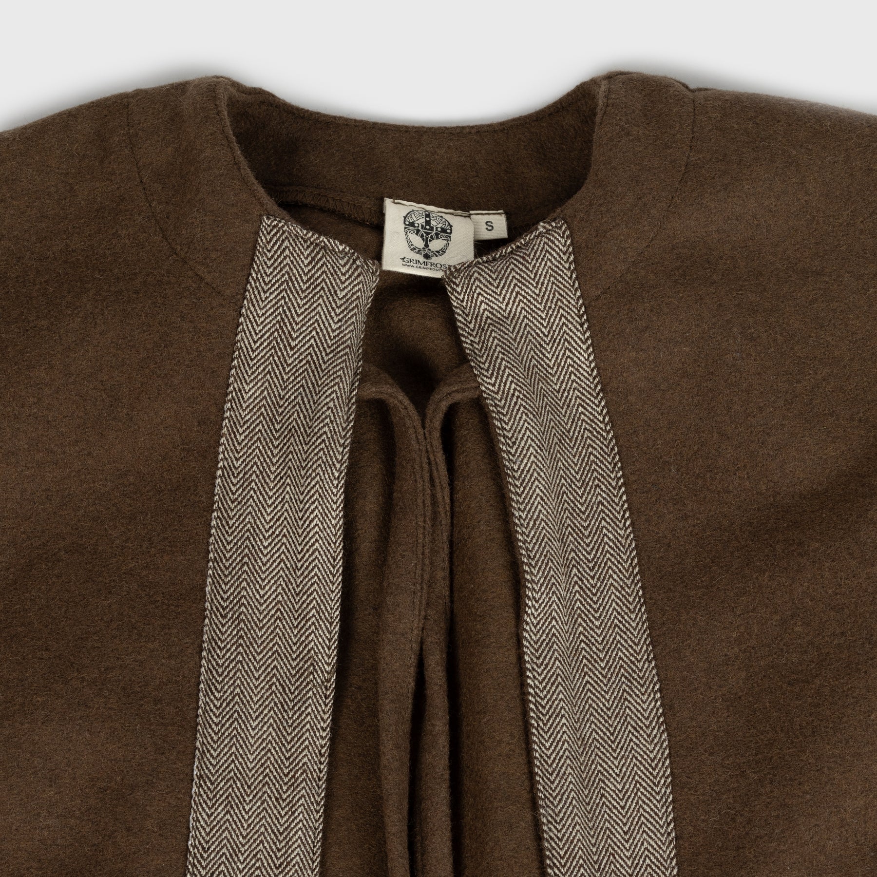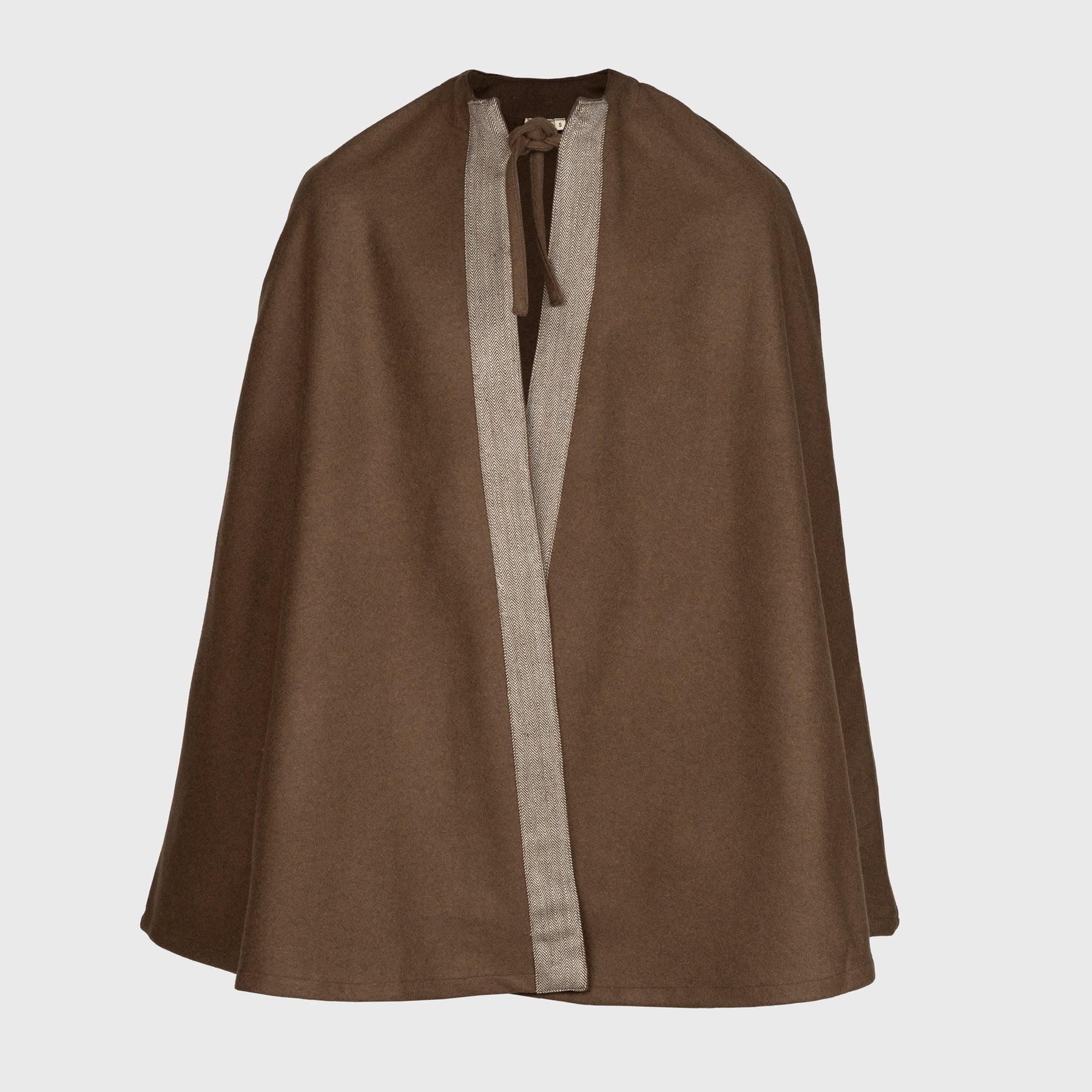 Ein Grabfund in Horning, Dänemark, weist auf die Verwendung von Halbkreismänteln in der Wikingerzeit hin. Diese Umhänge sind auch auf Bildern zu sehen, zum Beispiel auf dem Teppich von Bayeux. Wie der Name schon sagt, hat er die Form eines Halbkreises, der über die Schultern drapiert und mit Schnüren oder einer Fibel befestigt wird. Der Fischgrätenstoff sorgt für ein schönes Aussehen.