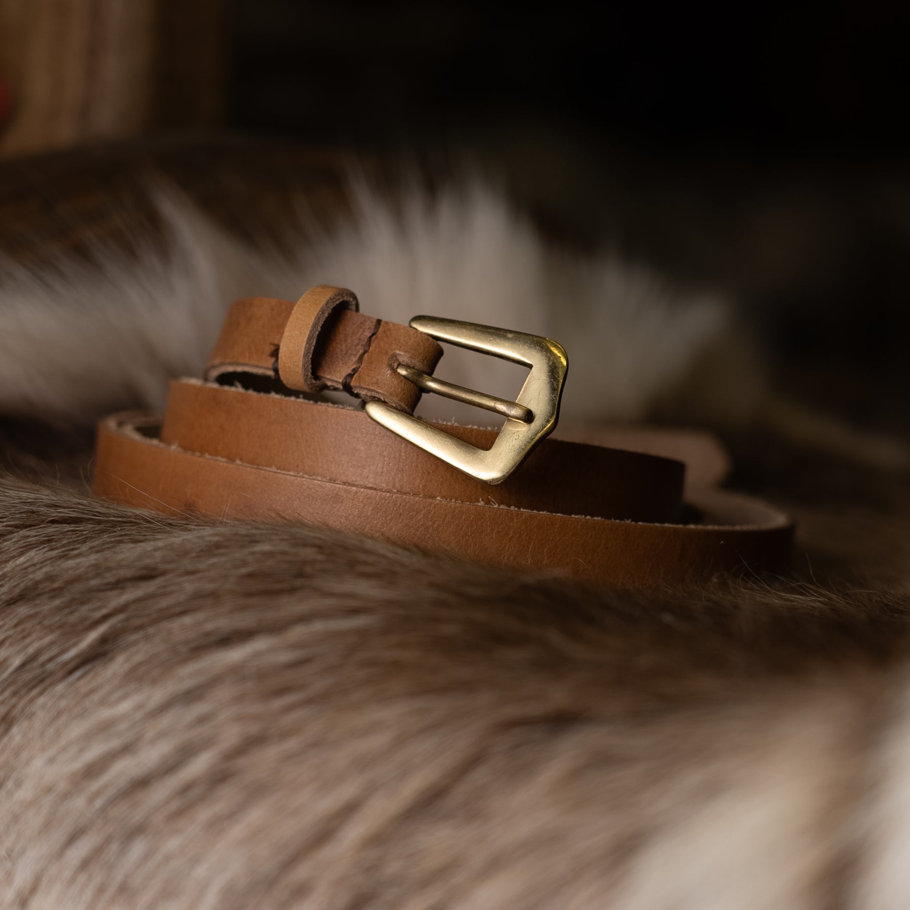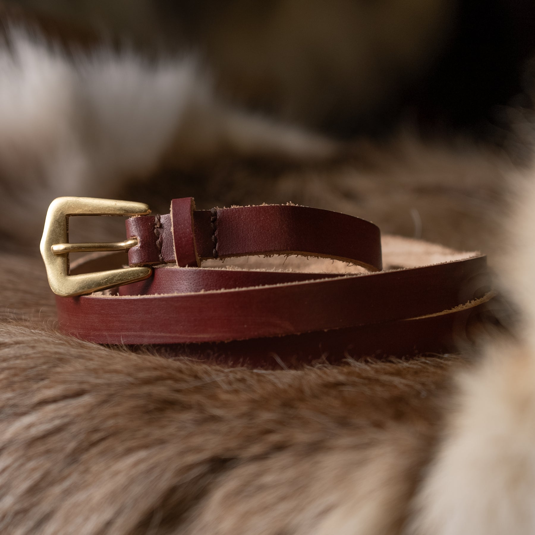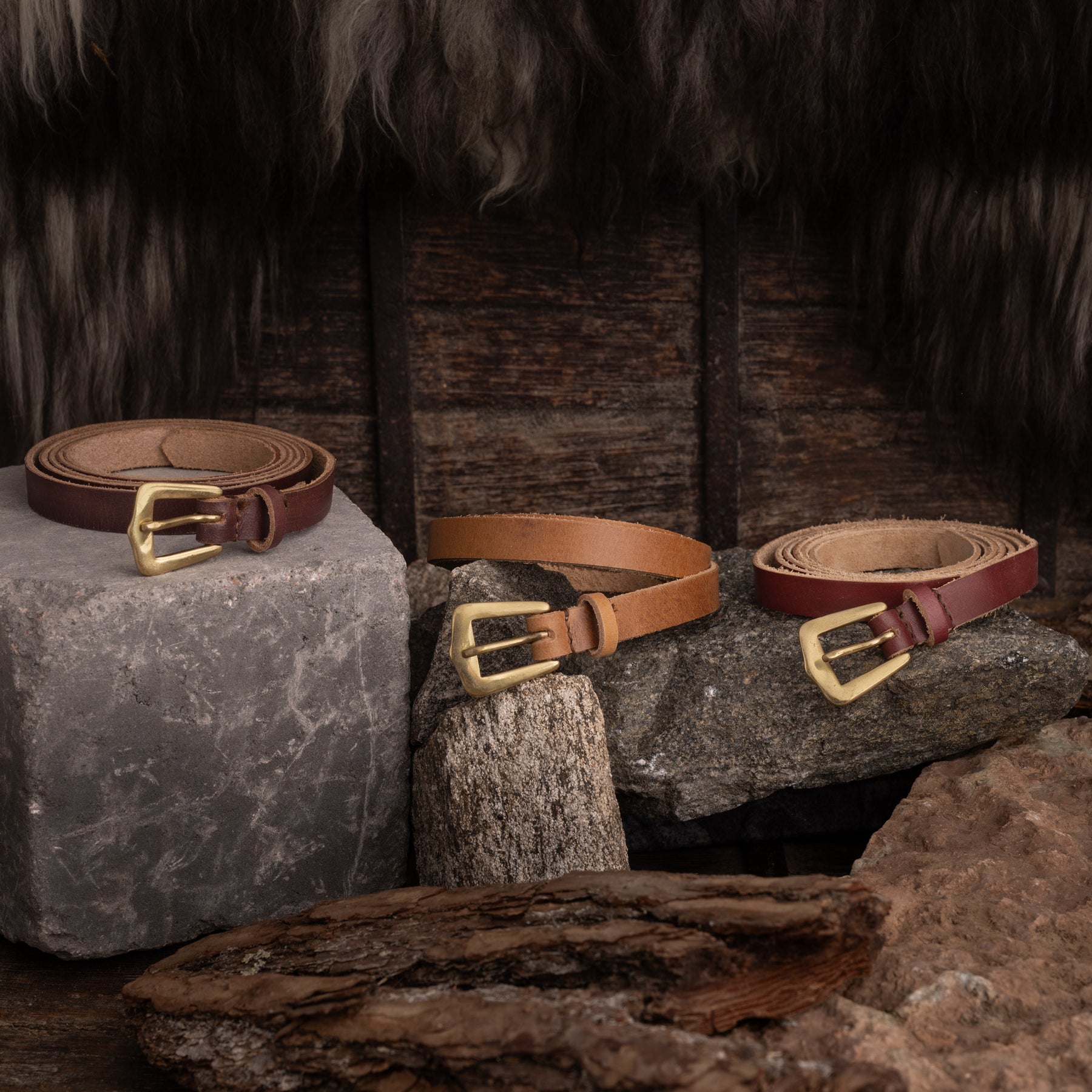 Ein Gürtel gehört zusammen mit Tunika, Hose und Schuhen zur Grundausstattung einer wikingerzeitlichen Kleidung. Die Breite der Gürtel reichte von 12 mm bis 40 mm, wie Funde aus der Wikingerzeit zeigen. Reich verzierte Gürtel wurden nicht von allen benutzt. Alles, was als Gürtel diente, konnte natürlich verwendet werden - wie ein Stück Seil, Stoff oder ein einfaches Lederband. Es ist bemerkenswert, dass diese einfacheren Varianten nicht in Gräbern oder anderen Ausgrabungen gefunden wurden. Das könnte daran liegen, dass die ausgegrabenen Gräber in der Regel bedeutenden Personen gehörten, die sich aufwändigere Gürtel leisten konnten. Außerdem überlebt organisches Material nicht. Wenn Sie sich also für ein Outfit entscheiden, das ausschließlich auf tatsächlichen Funden beruht, sollten Sie einen der Gürtel mit Metallschnallen und Riemenenden in Betracht ziehen.
