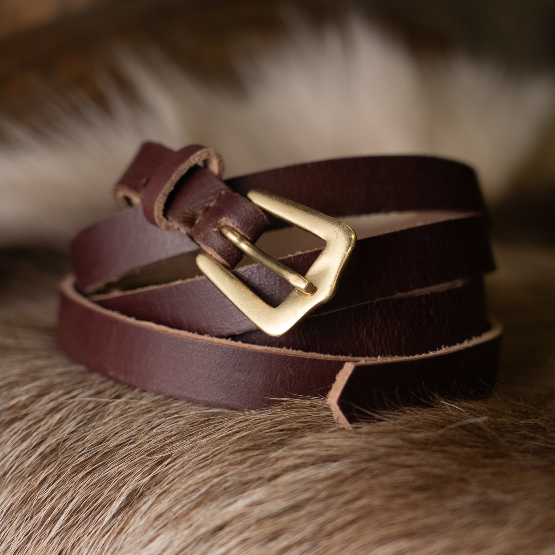 Wikingerzeitlicher Gürtel nach einem Fund aus Gotland in Schweden. Der Gürtel ist aus strapazierfähigem Ochsenleder handgefertigt und wird mit einer historisch korrekten Messingschnalle geliefert. Dies ist der perfekte Gürtel für den durchschnittlichen Wikinger ohne zu viel „Bling“.