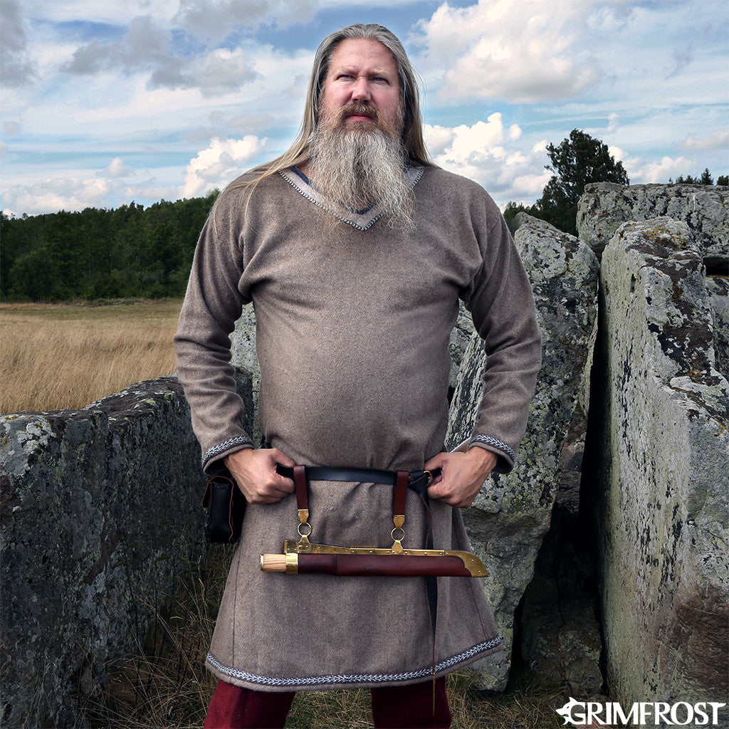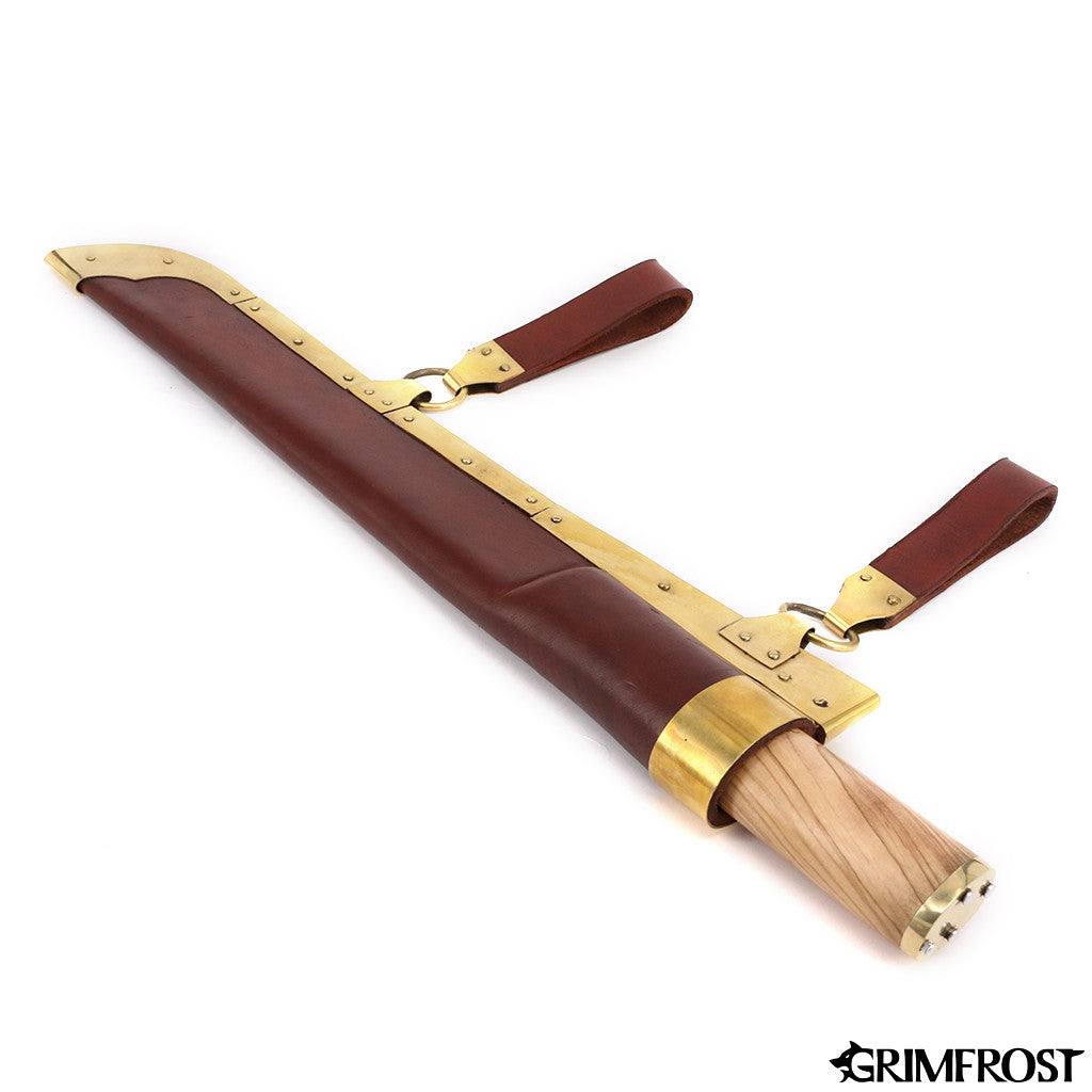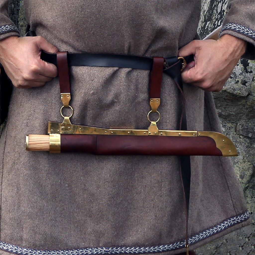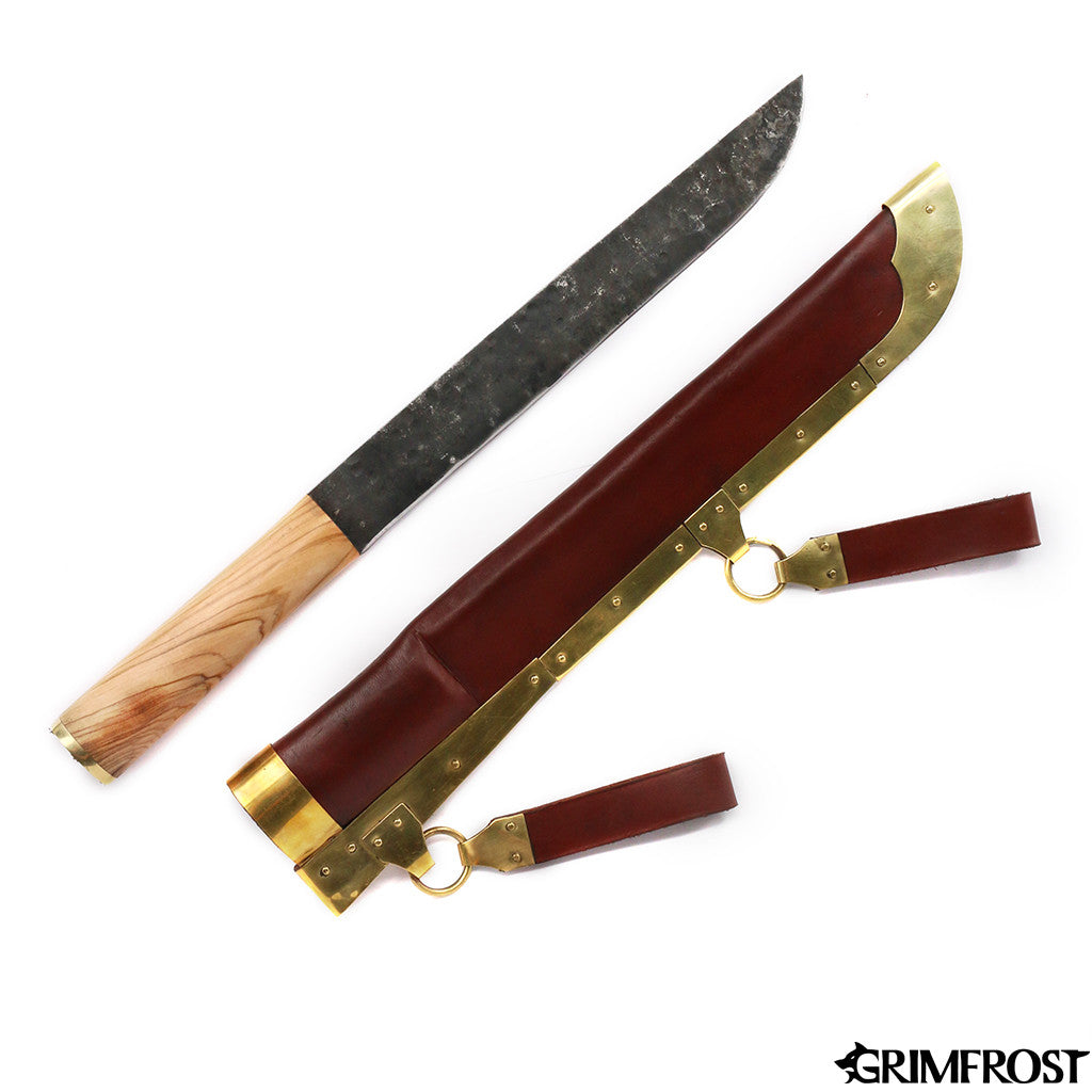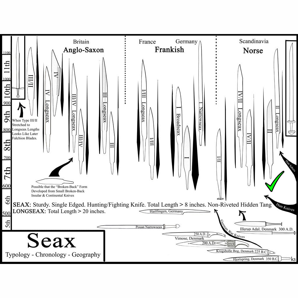 Diese handgeschmiedete Seax ist von dem Design, das bei den Wikingern üblich war (nordischer Typ II). Der Sax (Englisch: Seax) ist ein langes Messer, das durch eine große, einschneidige Klinge gekennzeichnet ist, die in einer waagerecht am Gürtel befestigten Scheide getragen wird, wobei die Schneide der Klinge nach oben zeigt. Historisch gesehen war es bei den germanischen Völkern anzutreffen und gab u. a. den Sachsen ihren Namen. Diese besondere Form und Ausführung war im wikingerzeitlichen Skandinavien üblich, wo die gekrümmte Seite der Klinge geschliffen wurde und nicht die gerade Seite.