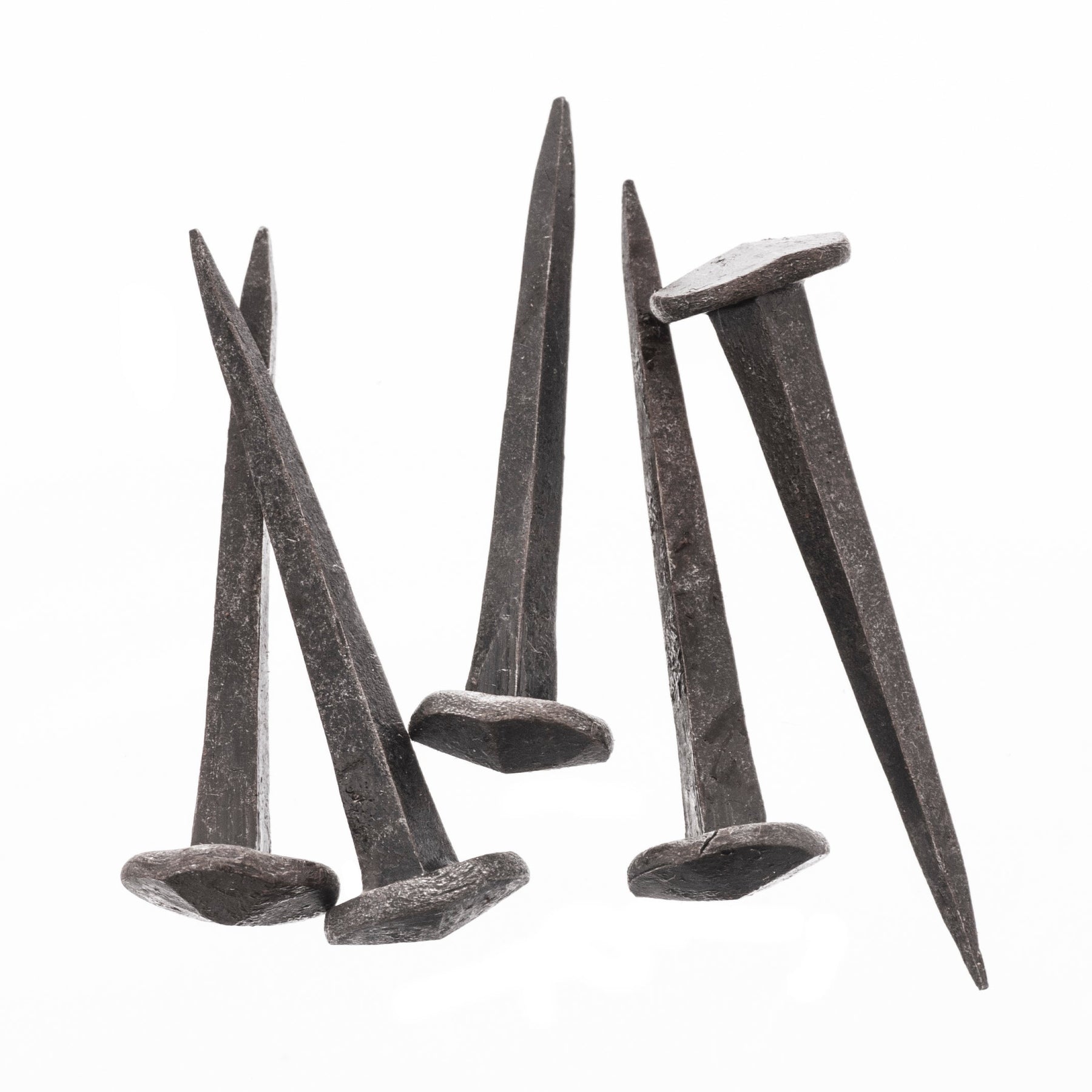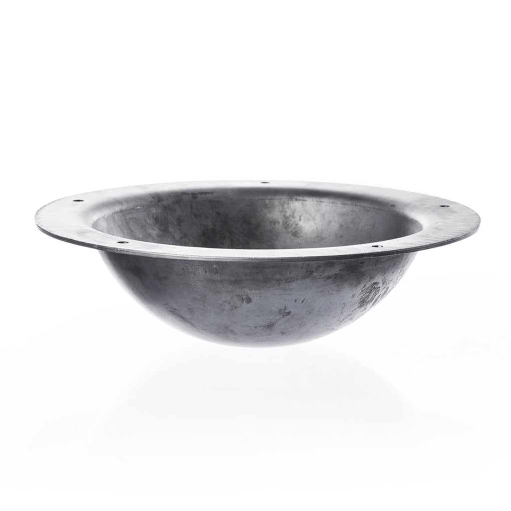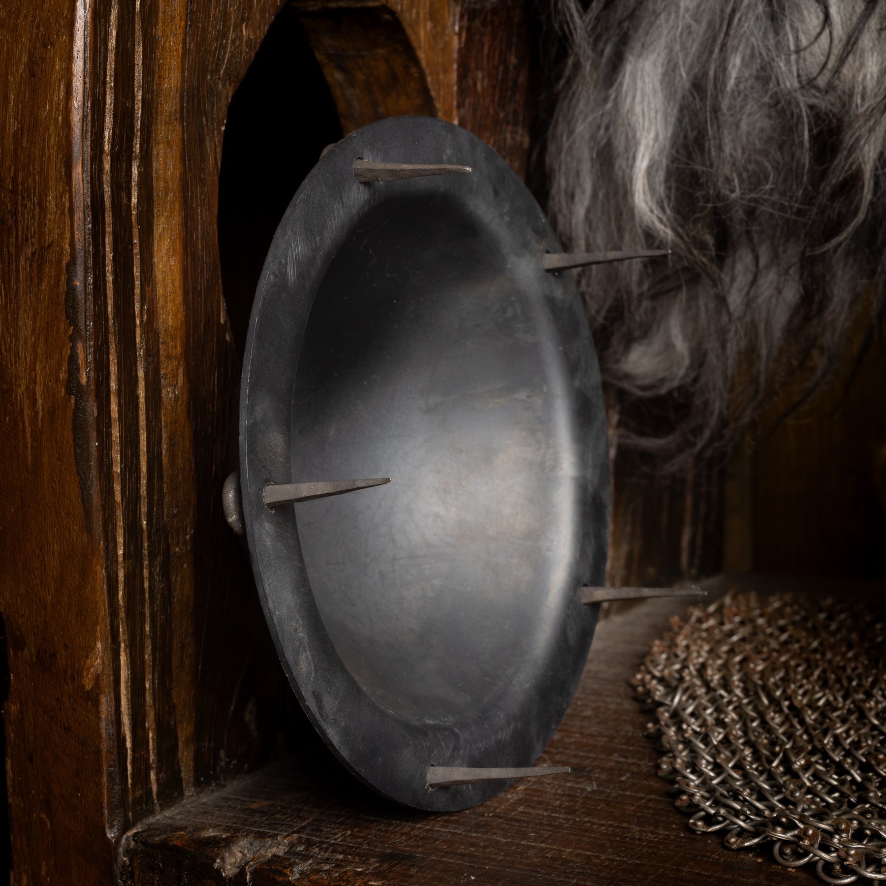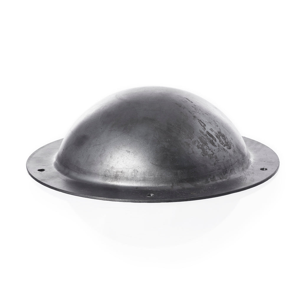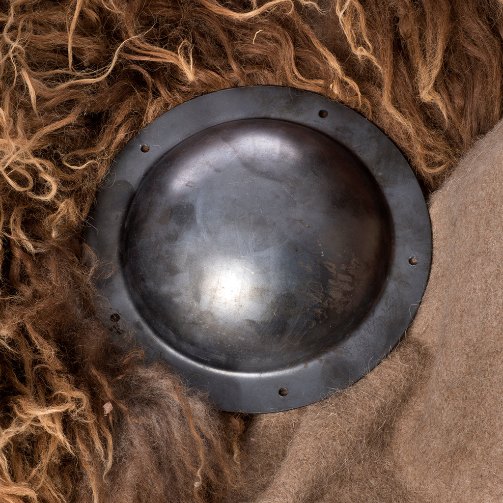 Kampfbereiter Wikinger-Schildbuckel aus starkem 12-wer Stahl mit 5 vorgebohrten Löchern. Er wird mit 5 handgeschmiedeten Eisennägeln geliefert, mit denen er befestigt wird. Die Nägel werden durch den Holzschild gehämmert und auf der Innenseite seitlich eingeschlagen, um den Schildbuckel zu befestigen.