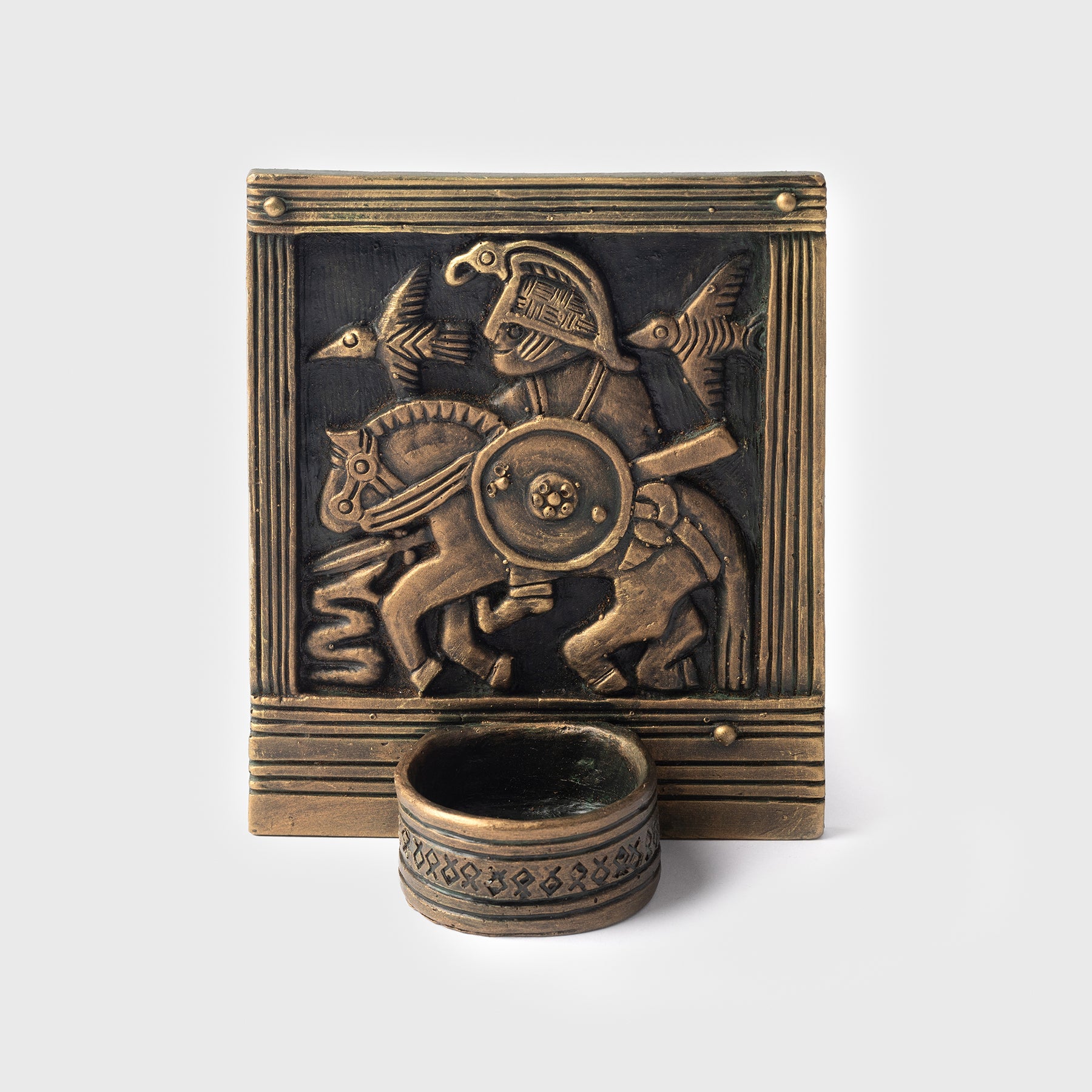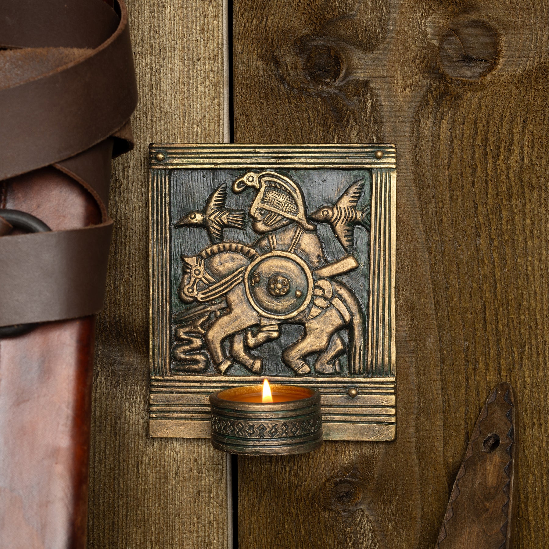 Handgefertigter Teelichthalter für die Wand mit einer Abbildung von Odin mit seinen Raben, die von einem Helm aus der Vendelzeit stammt.