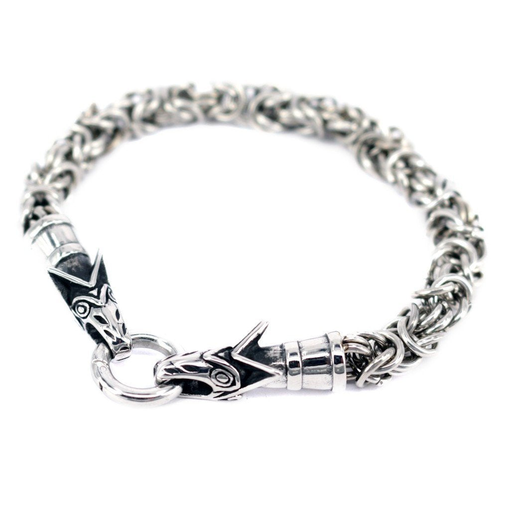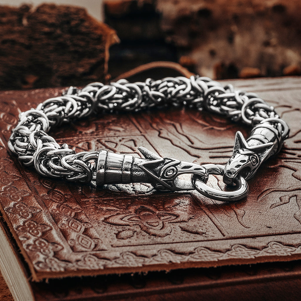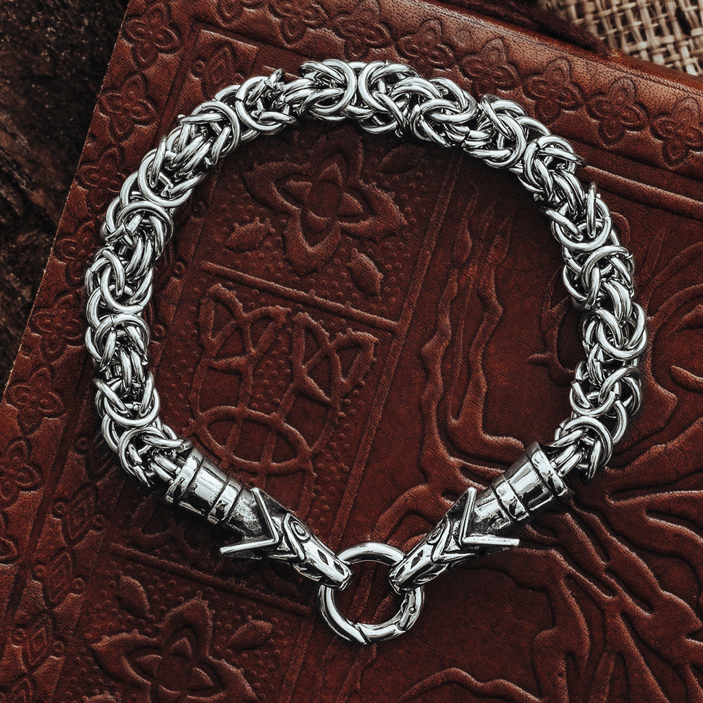 Die Wikinger benutzten Halsketten mit Tieren oder Bestien, die sich in einen Ring verbeißen, an dem die Anhänger aufgehängt sind.  Diese Version besteht aus einem King Chain Armband und endet in den Köpfen von Freki und Geri, die Wölfe von Odin.