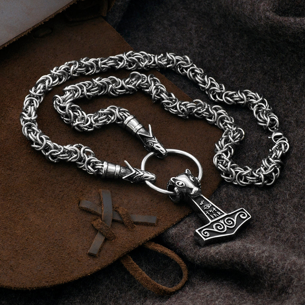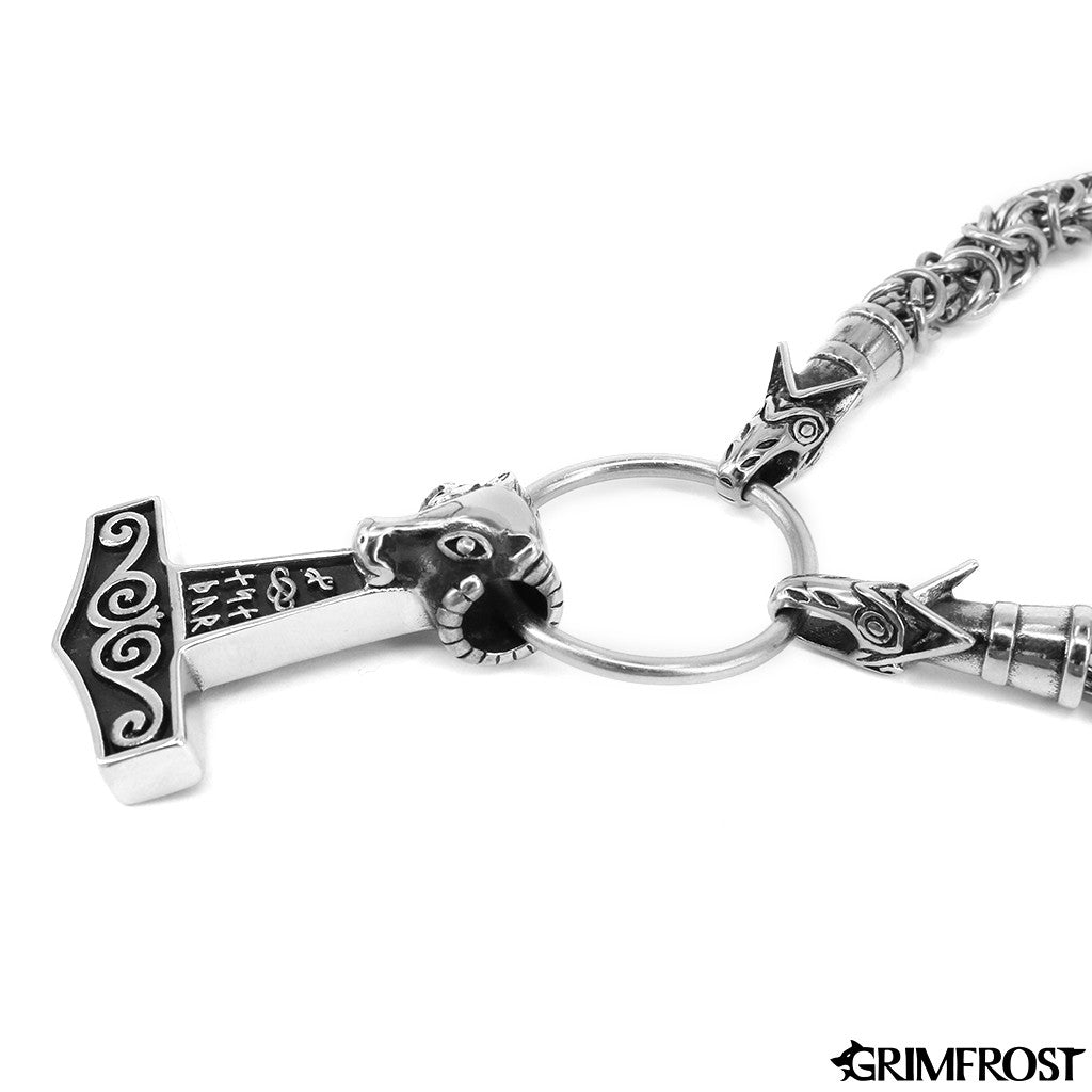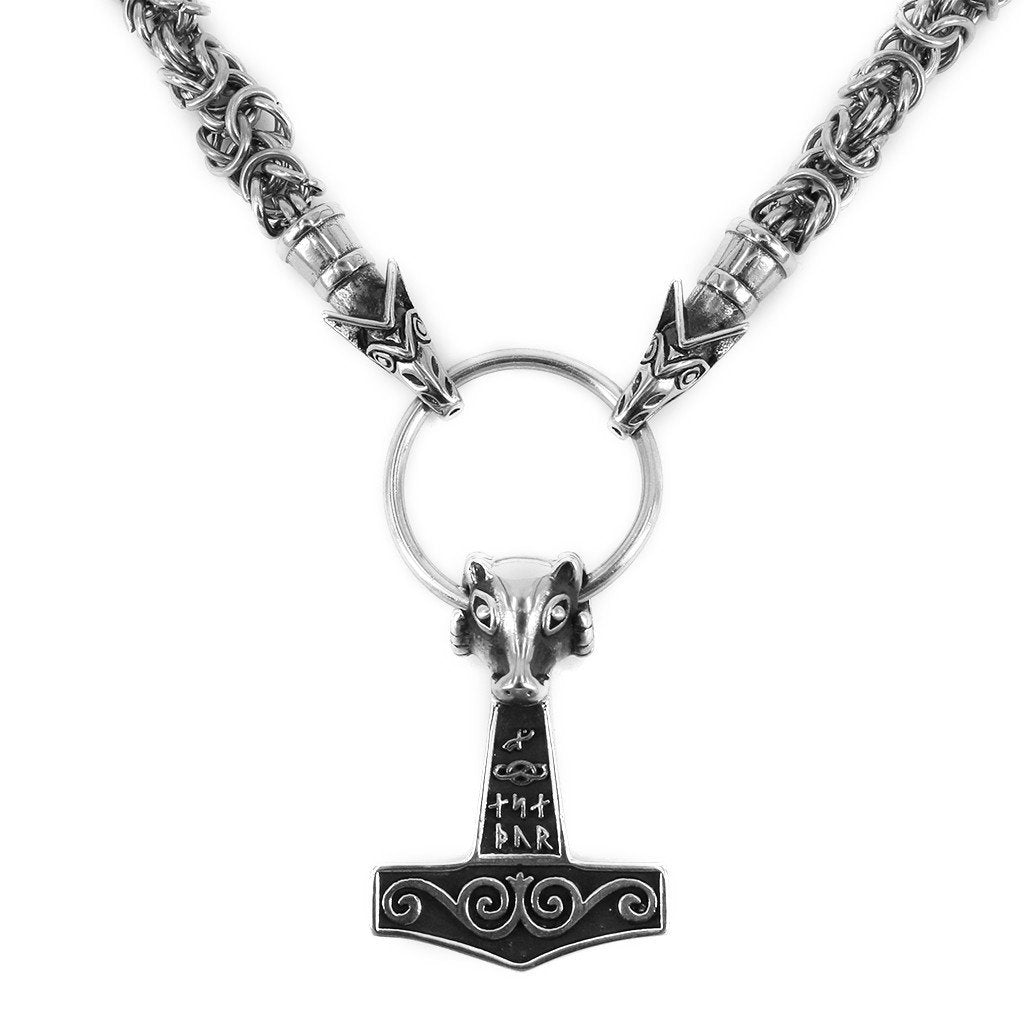 Wikinger verwendeten Halsketten mit Tieren oder Bestien, die auf einen Ring beißen, an dem Anhänger hängen. Diese Variante besteht aus einer King Chain, die in den Köpfen von Geri und Freki, den Wölfen Odins, endet, die auf einen Ring mit einem großen Mjölnir-Anhänger beißen. Wie der Name schon sagt, ist dies der König aller Ketten und galt bei den Wikingern als Zeichen von Erfolg und Macht.