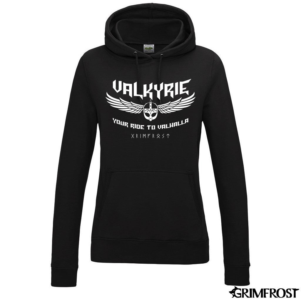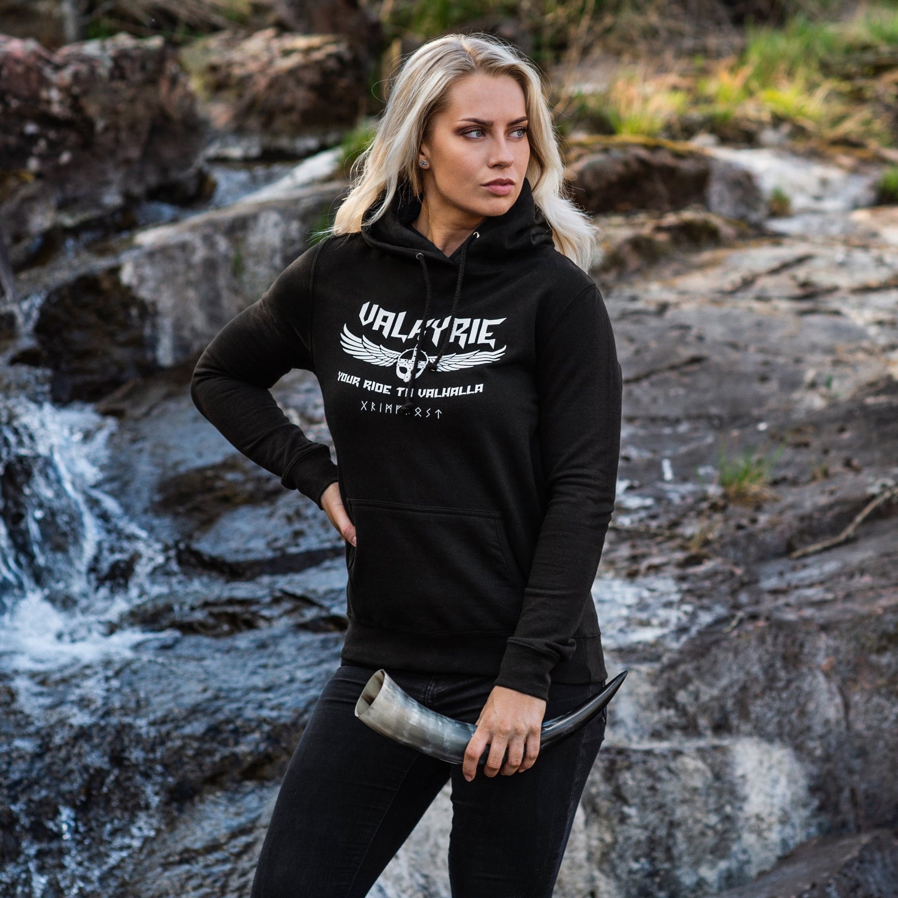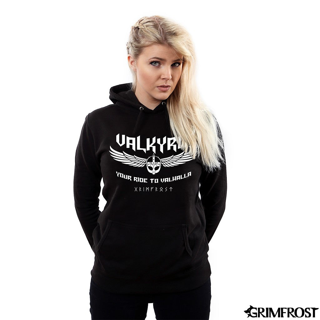 Bedruckt mit "Valkyrie - Your Ride to Valhalla" und einem Walkürenhelm mit einem Paar Flügeln, die ihre Fähigkeit zu fliegen symbolisieren.