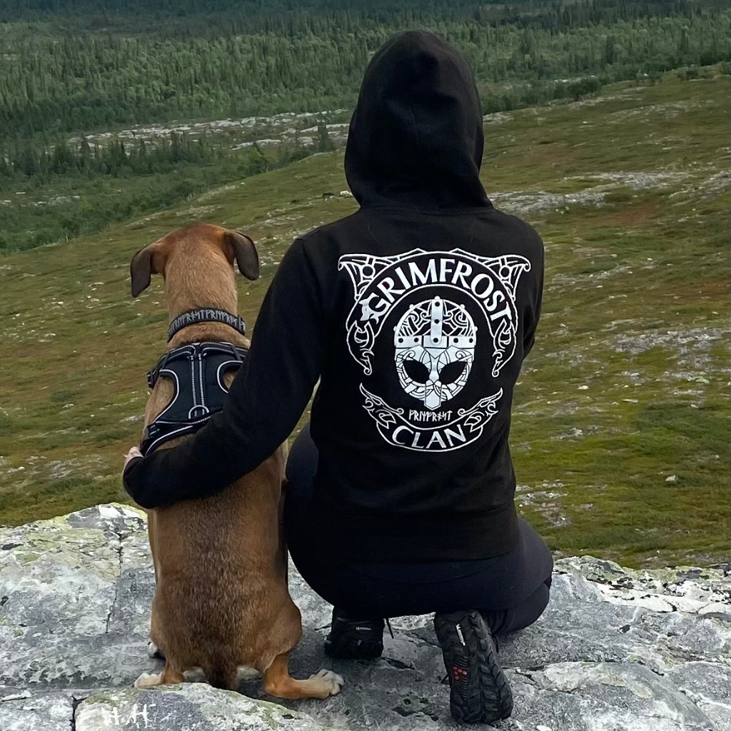 Die Rückseite ist mit "Grimfrost Clan" und einem Wikingerhelm bedruckt. Die Vorderseite hat einen Helm-Druck Grimfrost in Runen geschrieben.