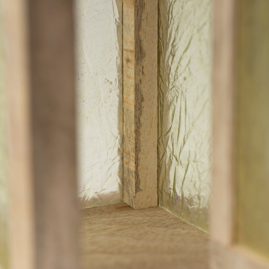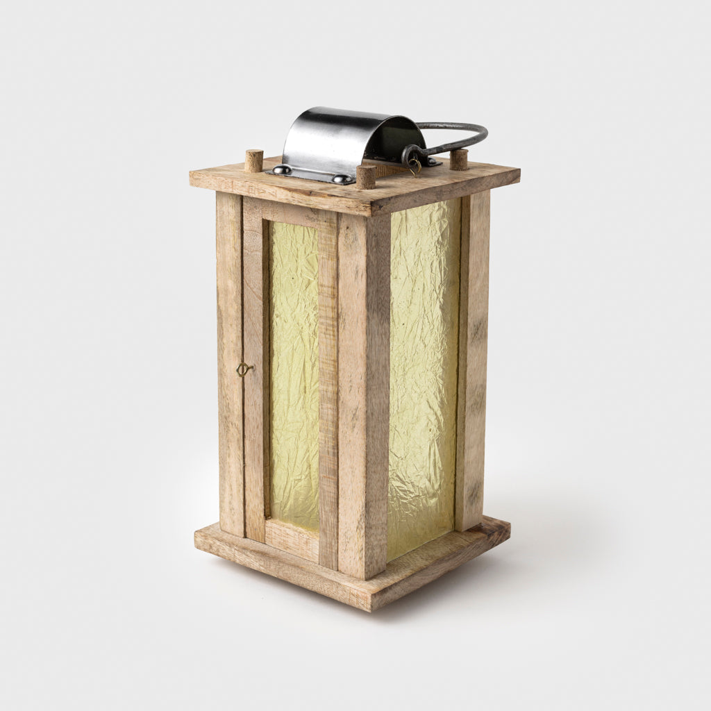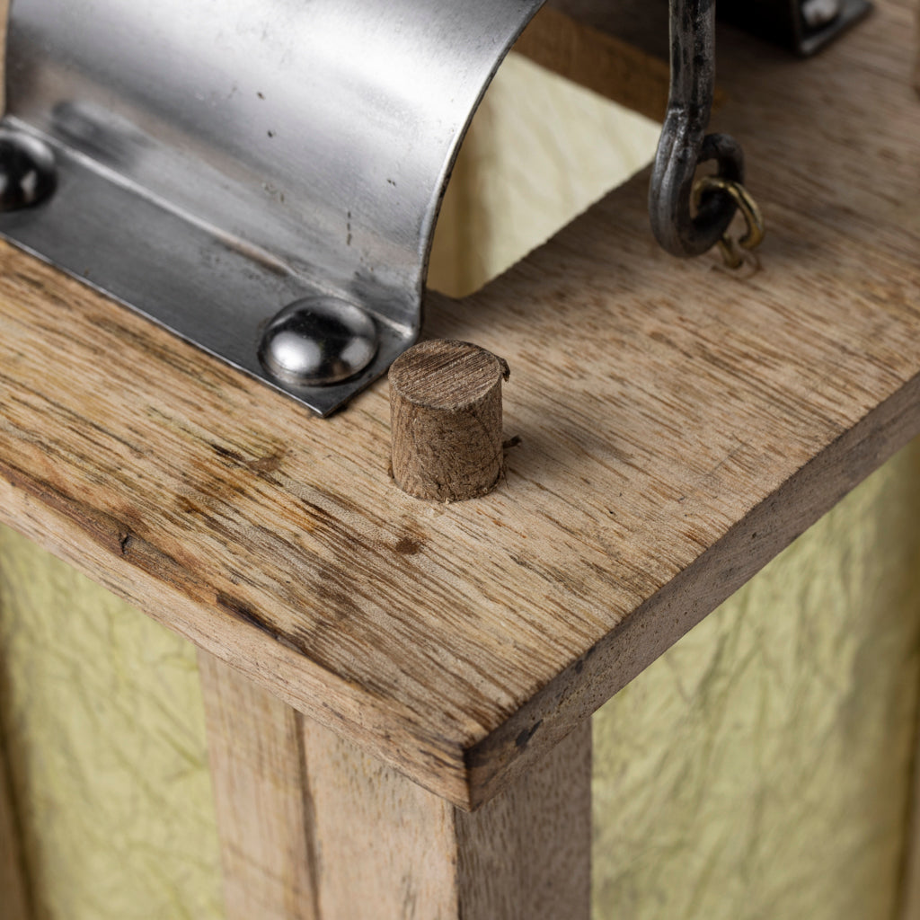 Handgefertigte Laterne mit einem Holzrahmen und Kunststofffenstern, die Glas imitieren. Dadurch wird verhindert, dass die Fenster zerbrechen, wenn die Laterne herunterfällt. Die Aufhängung und die Abdeckung für den Lüftungsschlitz sind aus Eisen gefertigt. Sie strahlt ein wirklich schönes, warmes Licht aus, das sowohl historische als auch moderne Räume beleuchten kann. Eine normale Kerze oder ein Teelicht kann darin verwendet werden.