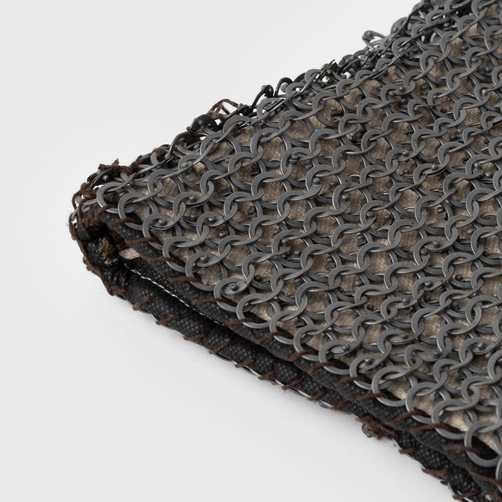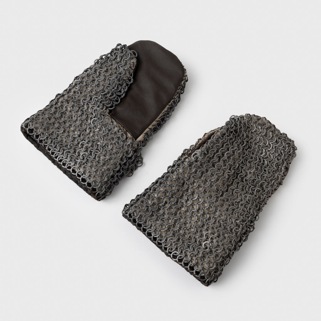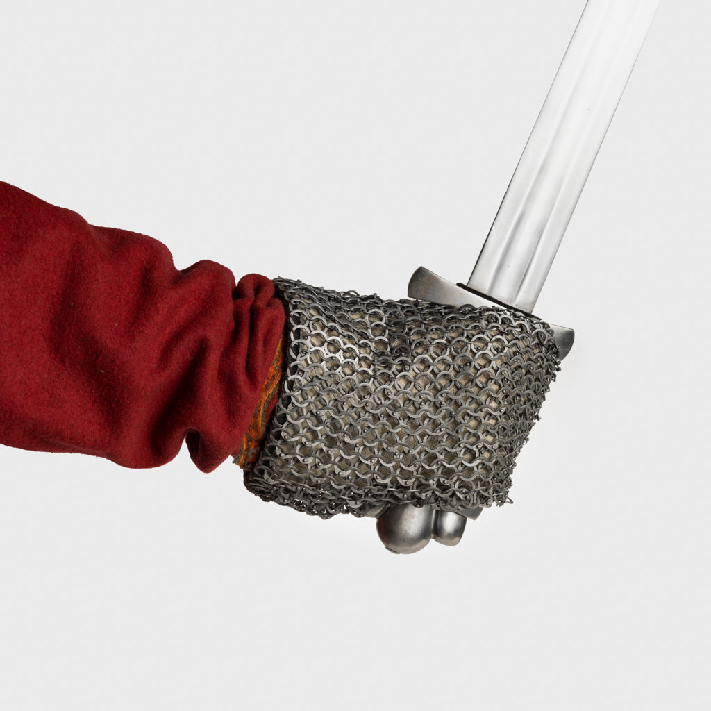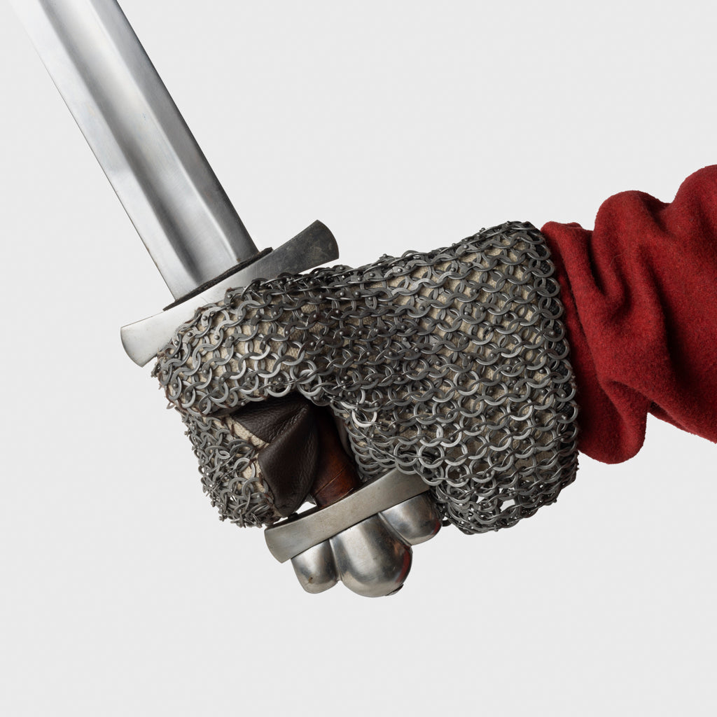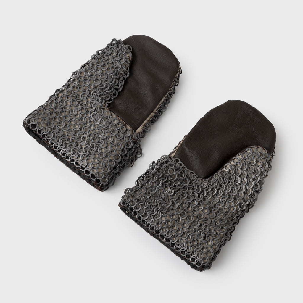 Battle gloves for steel weapon sparring and fighting that give proper protection from strikes to the hand. The inner layer consists of a padded glove, whilst riveted rings cover the outside. Leather covers the "gripping part". To get extra protection, it is possible to wear modern, protective gloves under them.