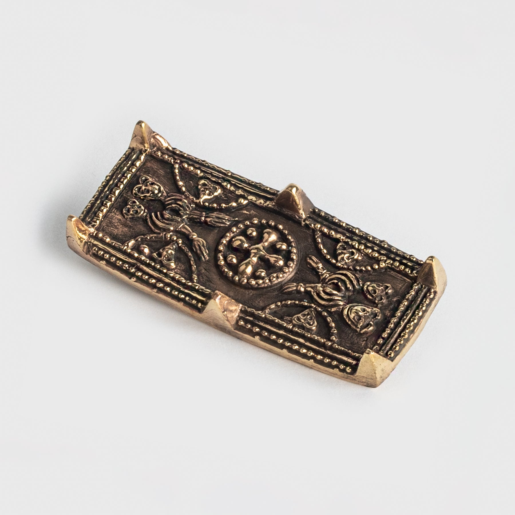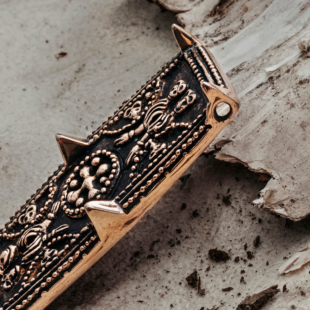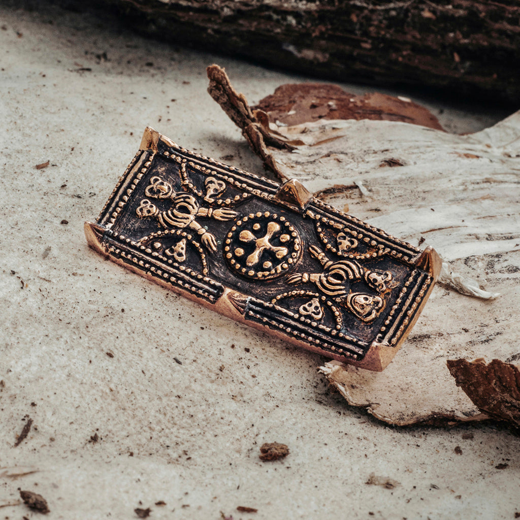 A detailed, high-quality Viking brooch crafted in solid bronze. It is a reproduction of the 9th Century silver brooch found in grave Bj 539 in Birka, Sweden. The back has a needle with a lock mechanism and the side has a hole from where it is possible to hang something.