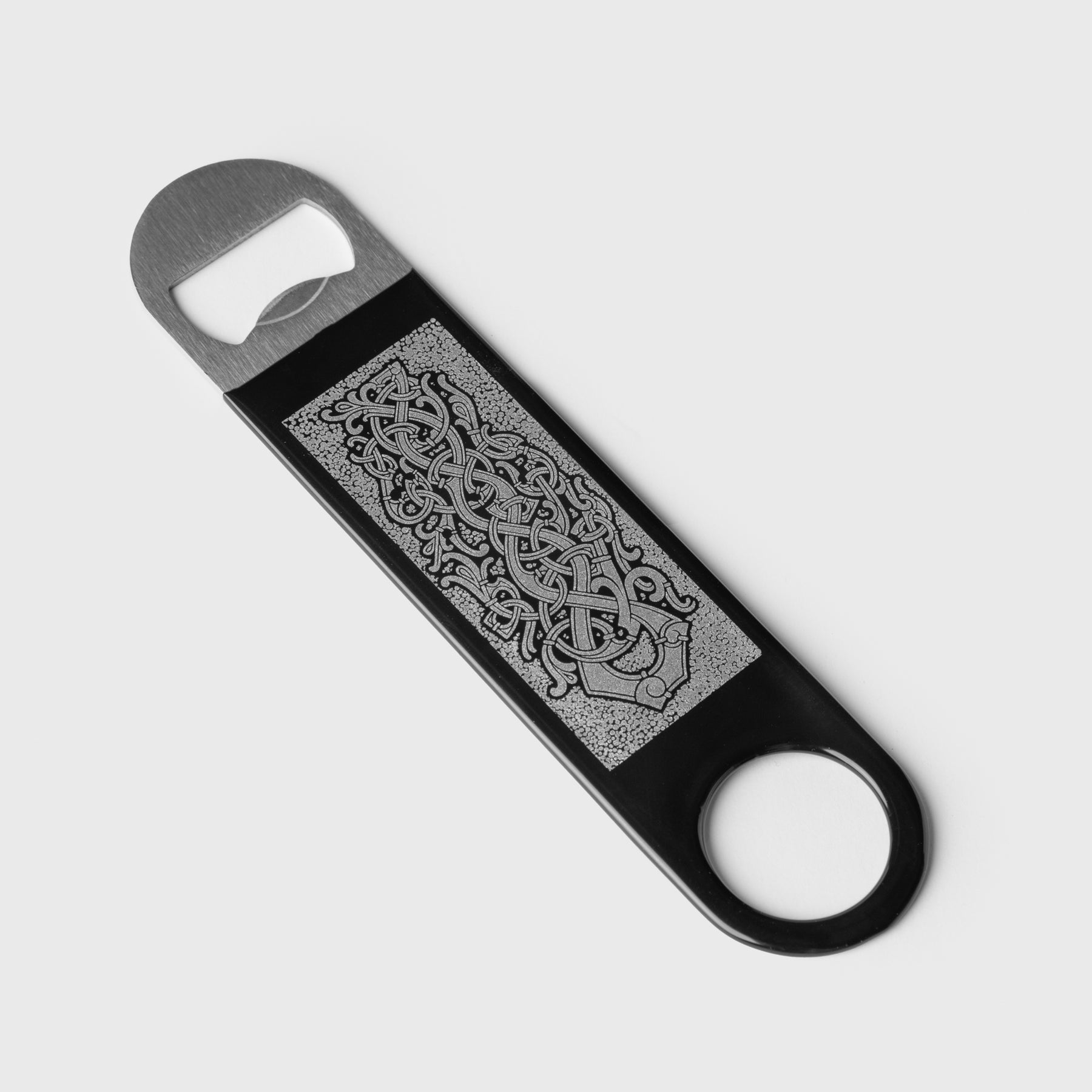 Heavy duty bottle opener in Stainless Steel that is covered with a beautiful lindworm design based on Viking age art.