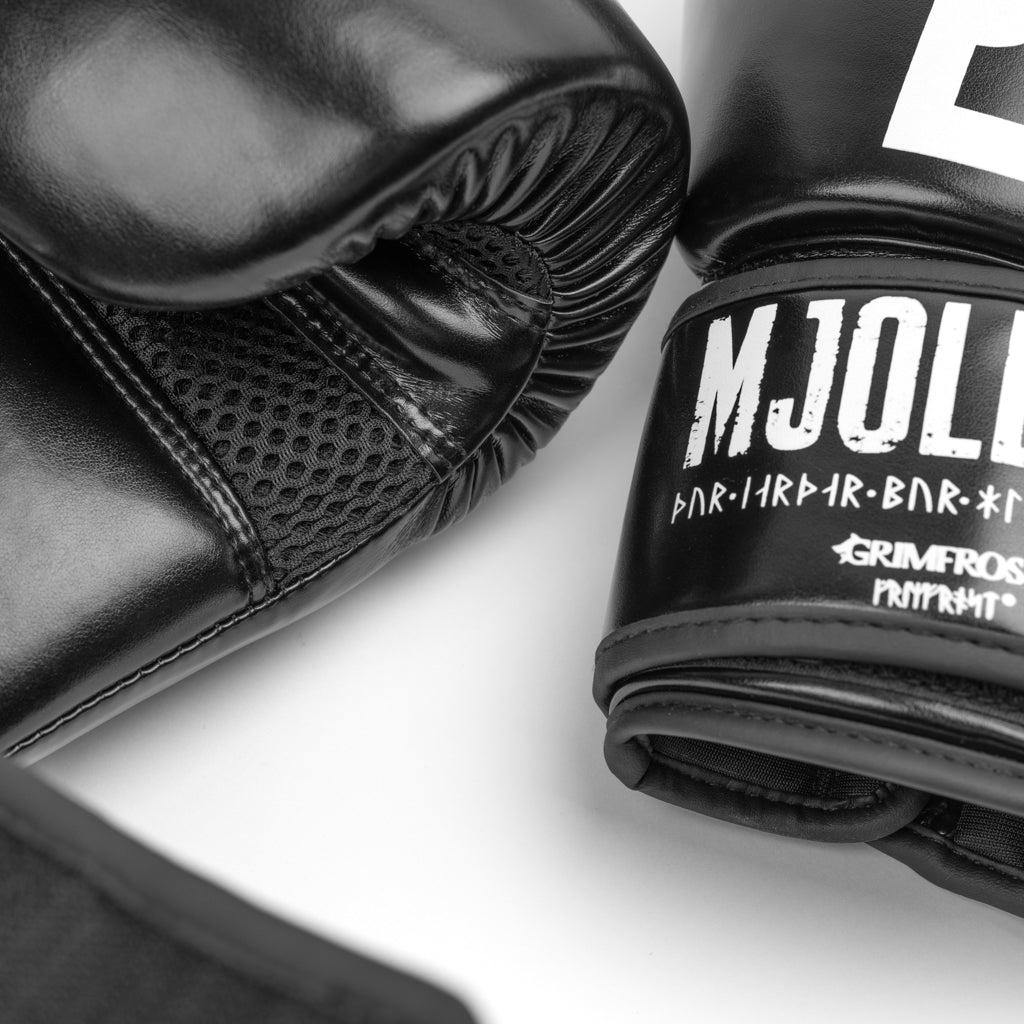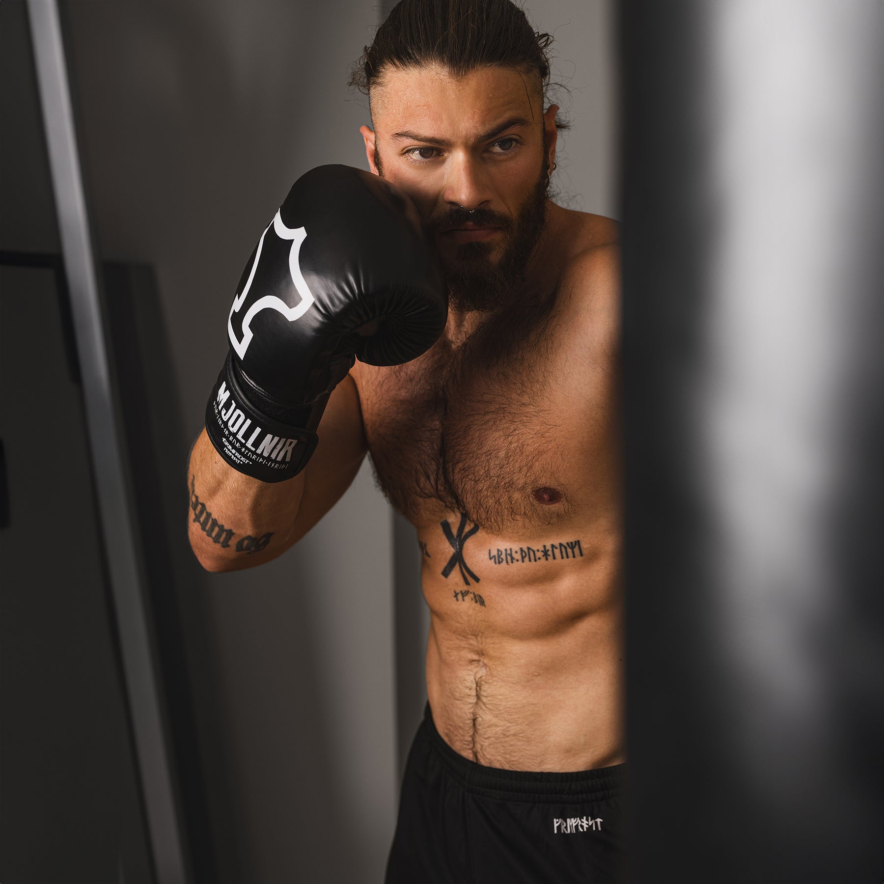 Durable finely crafted, big size boxing gloves that do their job, at the same time offering good wrist support and hand protection. Mjölnir, the hammer of Thor, is positioned on the gloves. The wrist wrap has a Mjollnir logo and runes in Old Norse reading: "Thor, Earth's son, the Thundering Storm, He who travels alone" They are all different names, kennings, used for Thor.