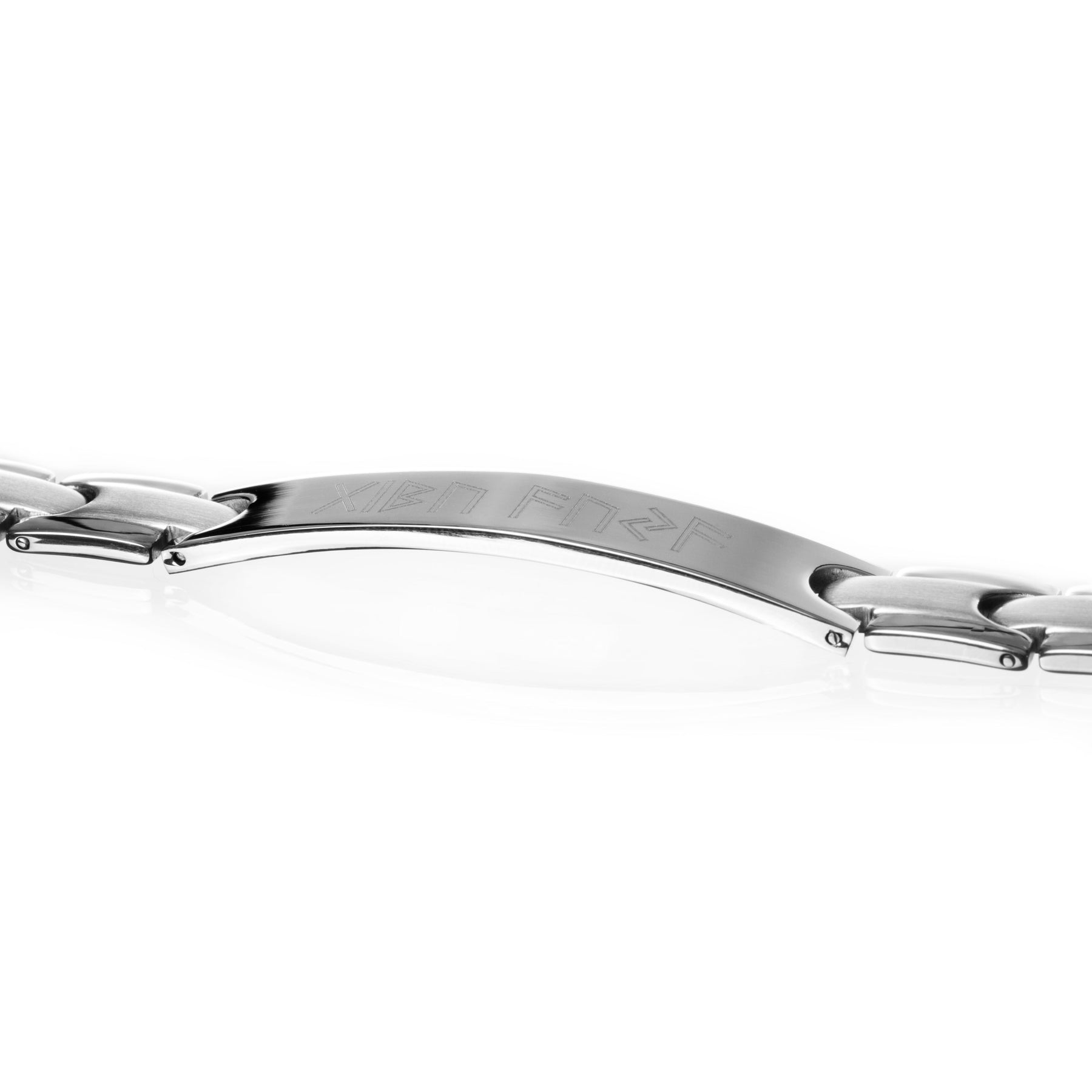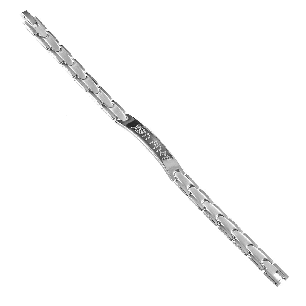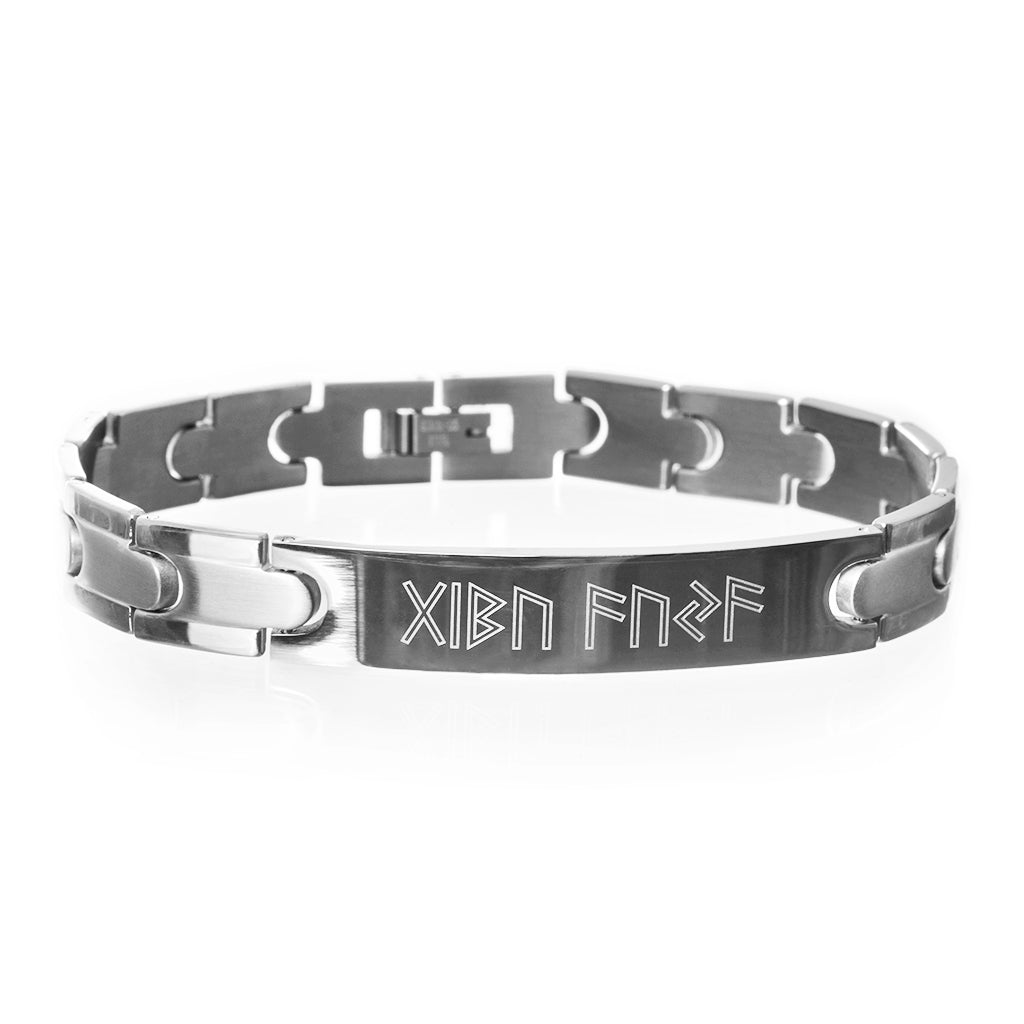 Men's bracelet with "Gibu Auja" written with the Elder Futhark runes. It is an old inscription found in archaeological finds from 6th Century Scandinavia that translates to "I Give Luck". Made from hypoallergenic stainless steel.