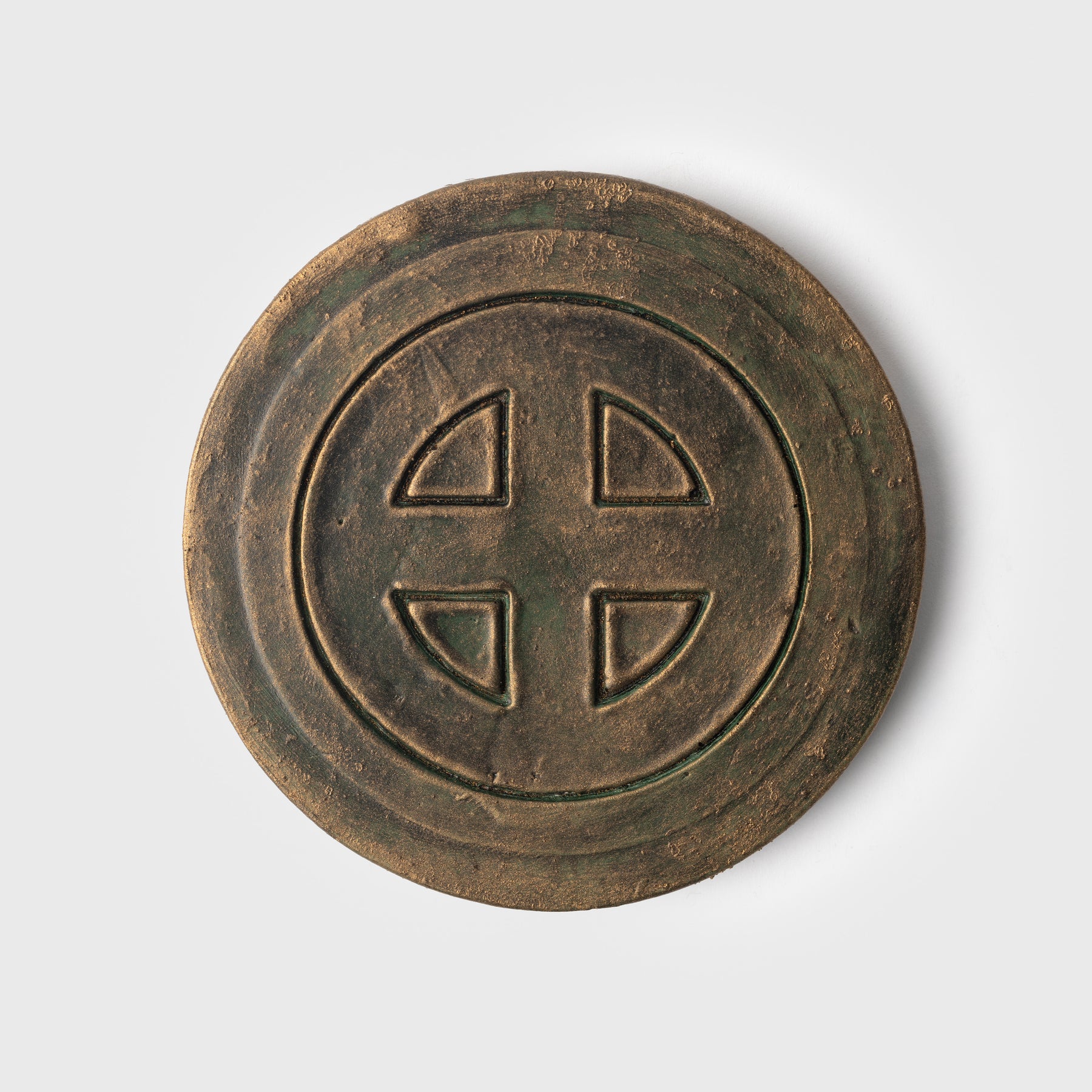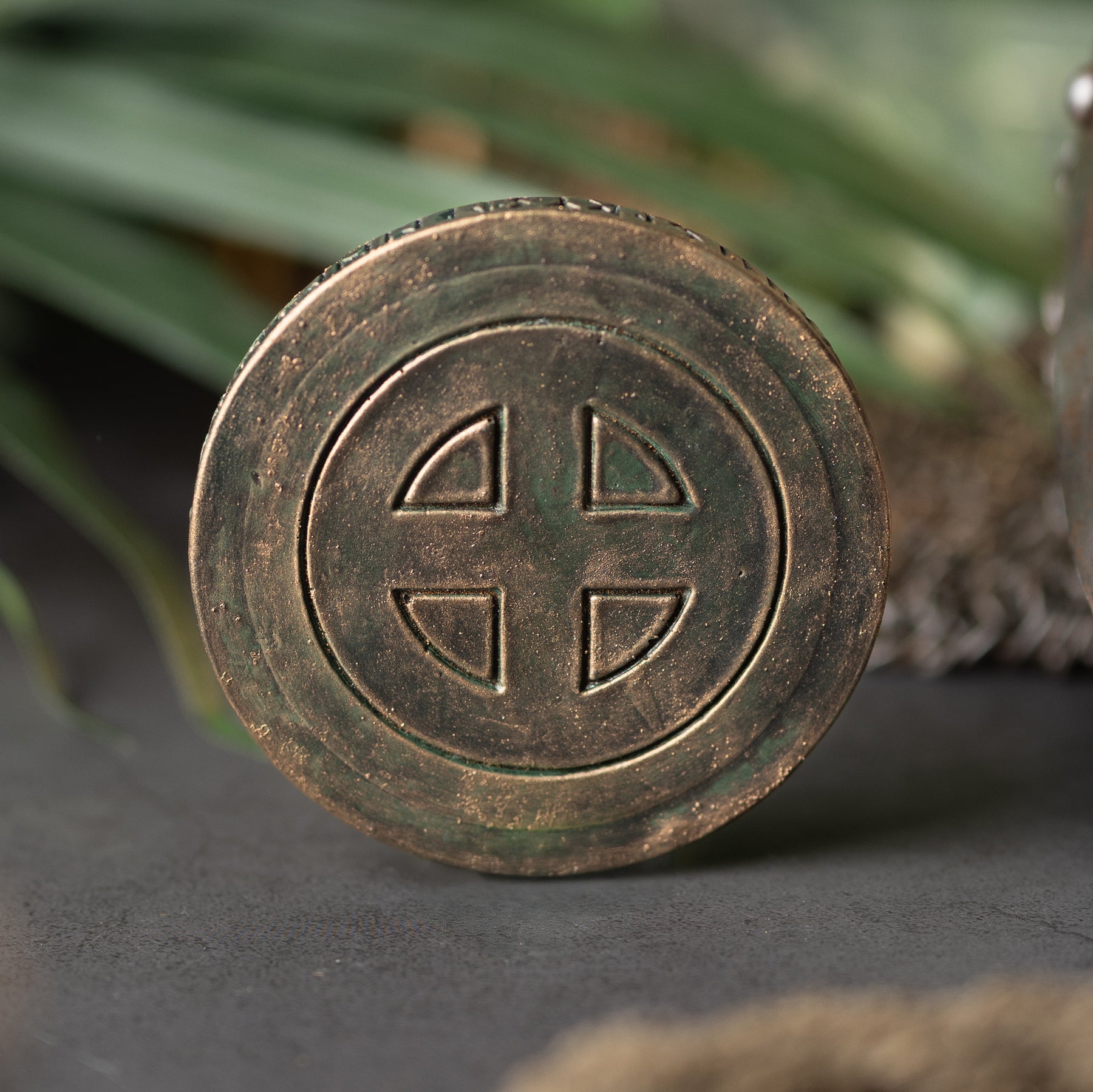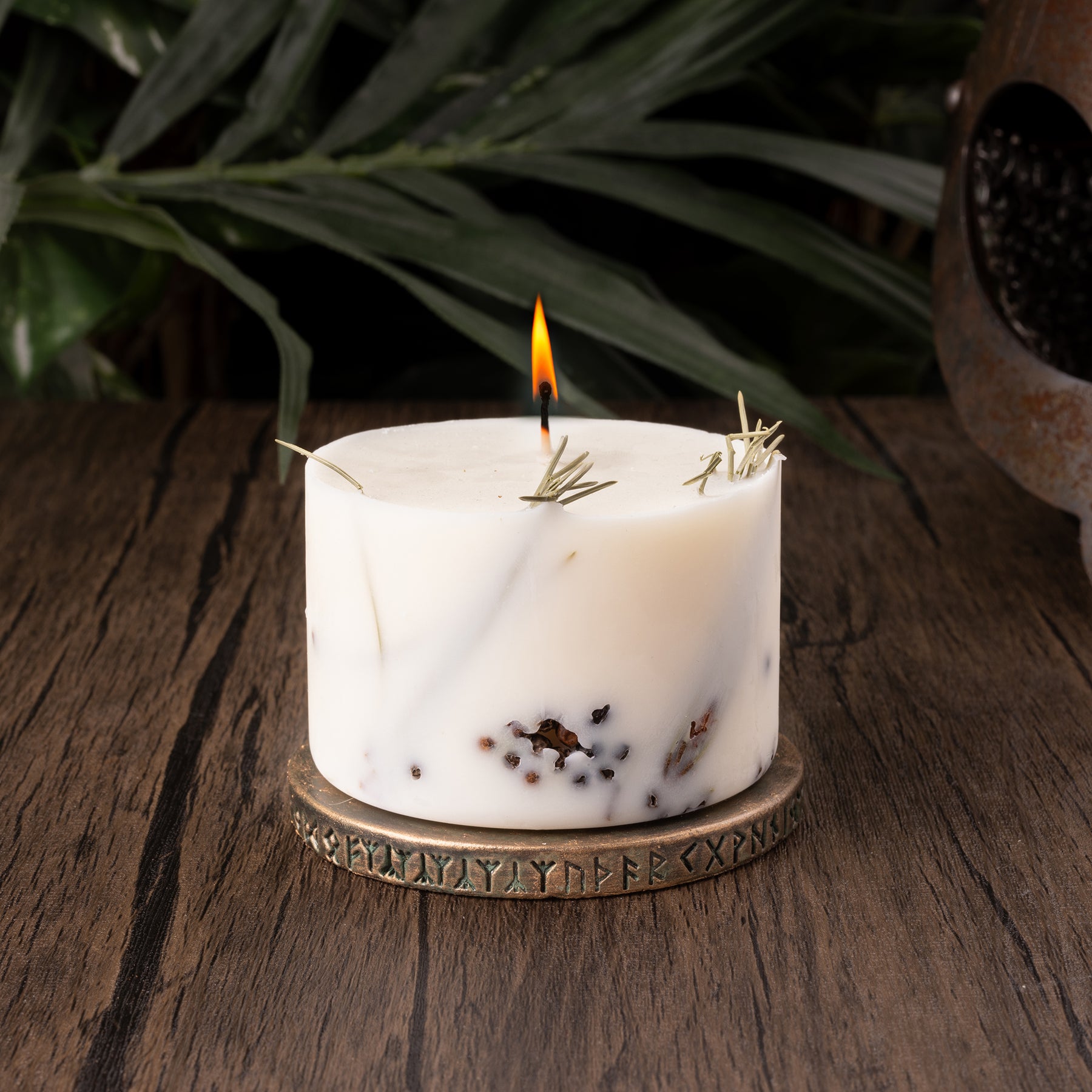 Handmade candle holder with the ancient sun wheel symbol and the Elder Futhark runic circle.