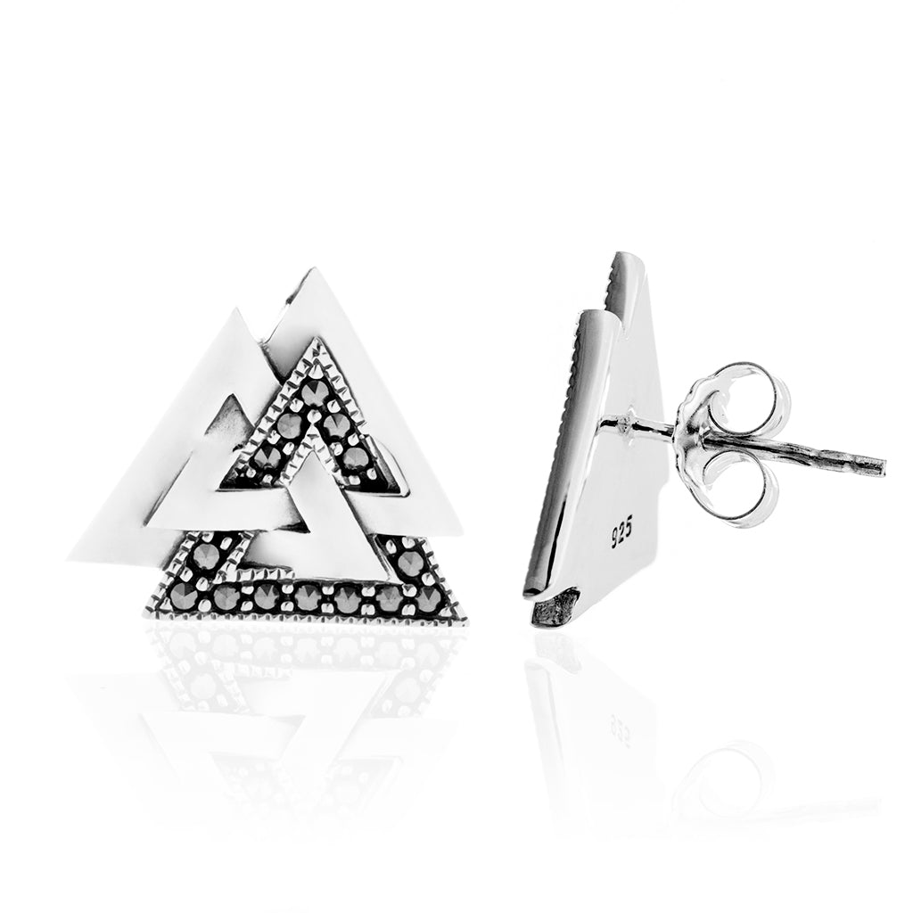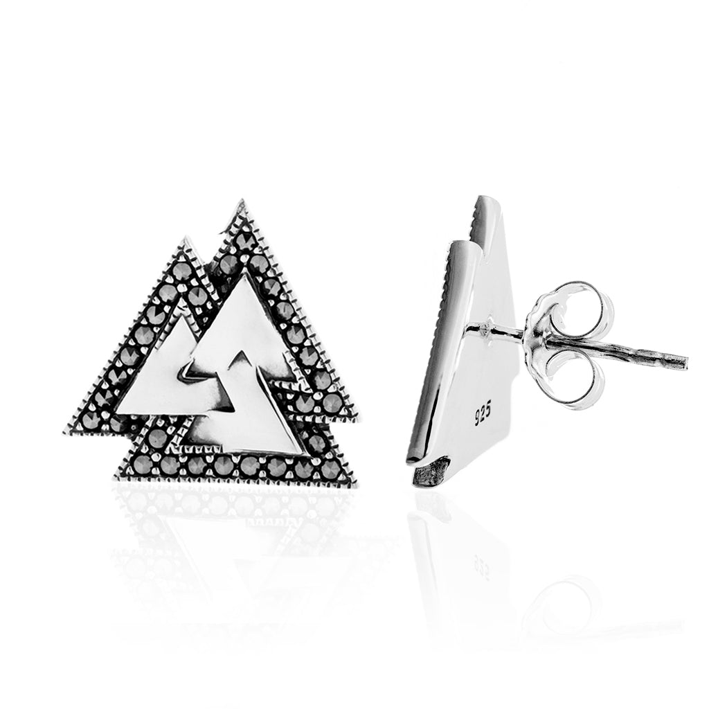 Beautiful earrings expertly handmade of solid sterling silver 925 with marcasite stones. They are based on the Valknut symbol associated with Odin, the chieftain of Viking gods. He resides in Valhall, where the chosen ones travel in their afterlife.