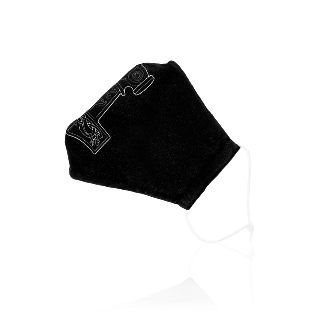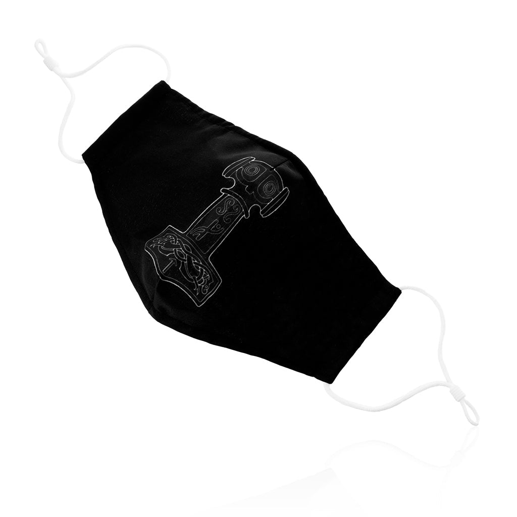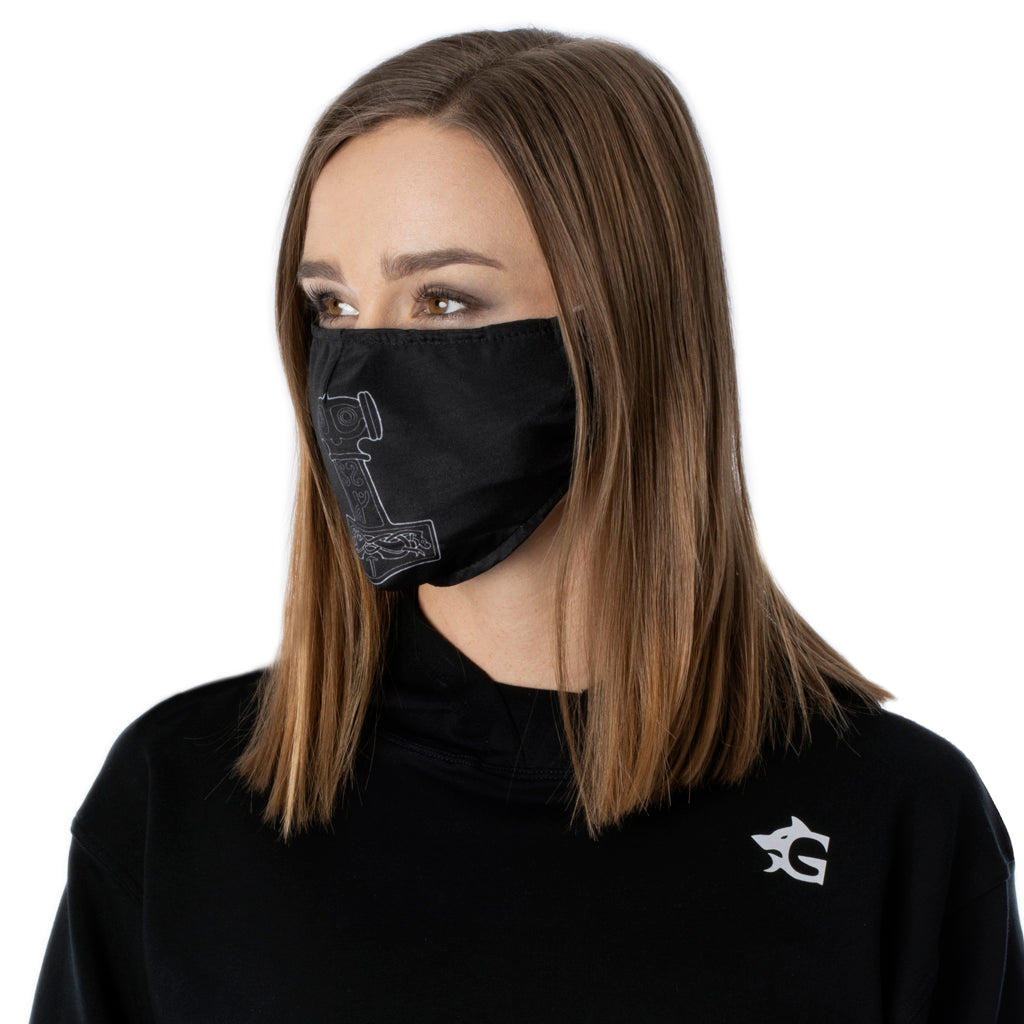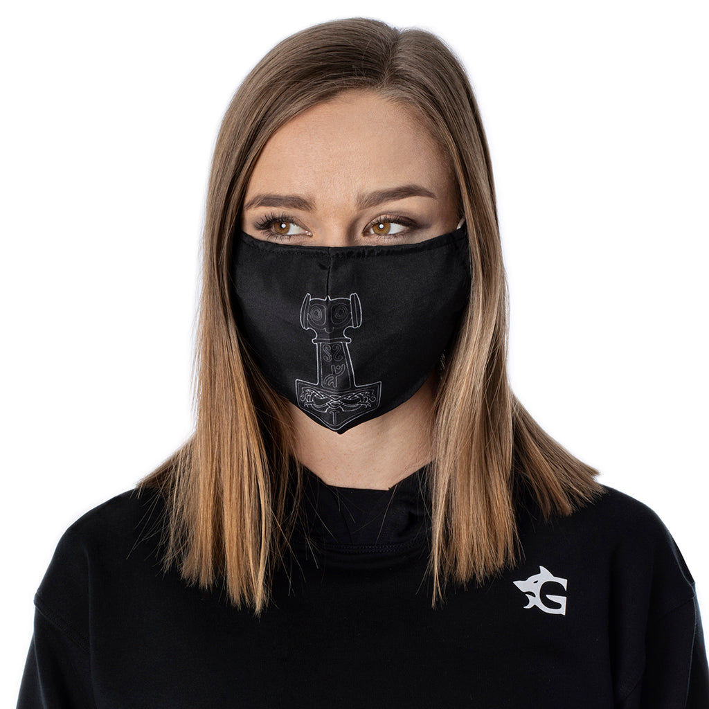 Washable mask with adjustable strings. The mask comes with Grimfrost's Mjolnir print.
