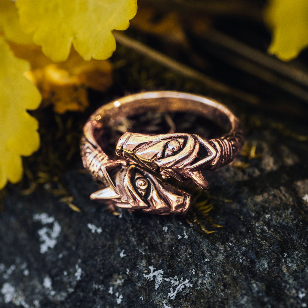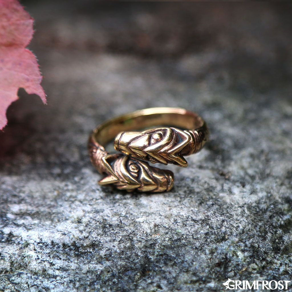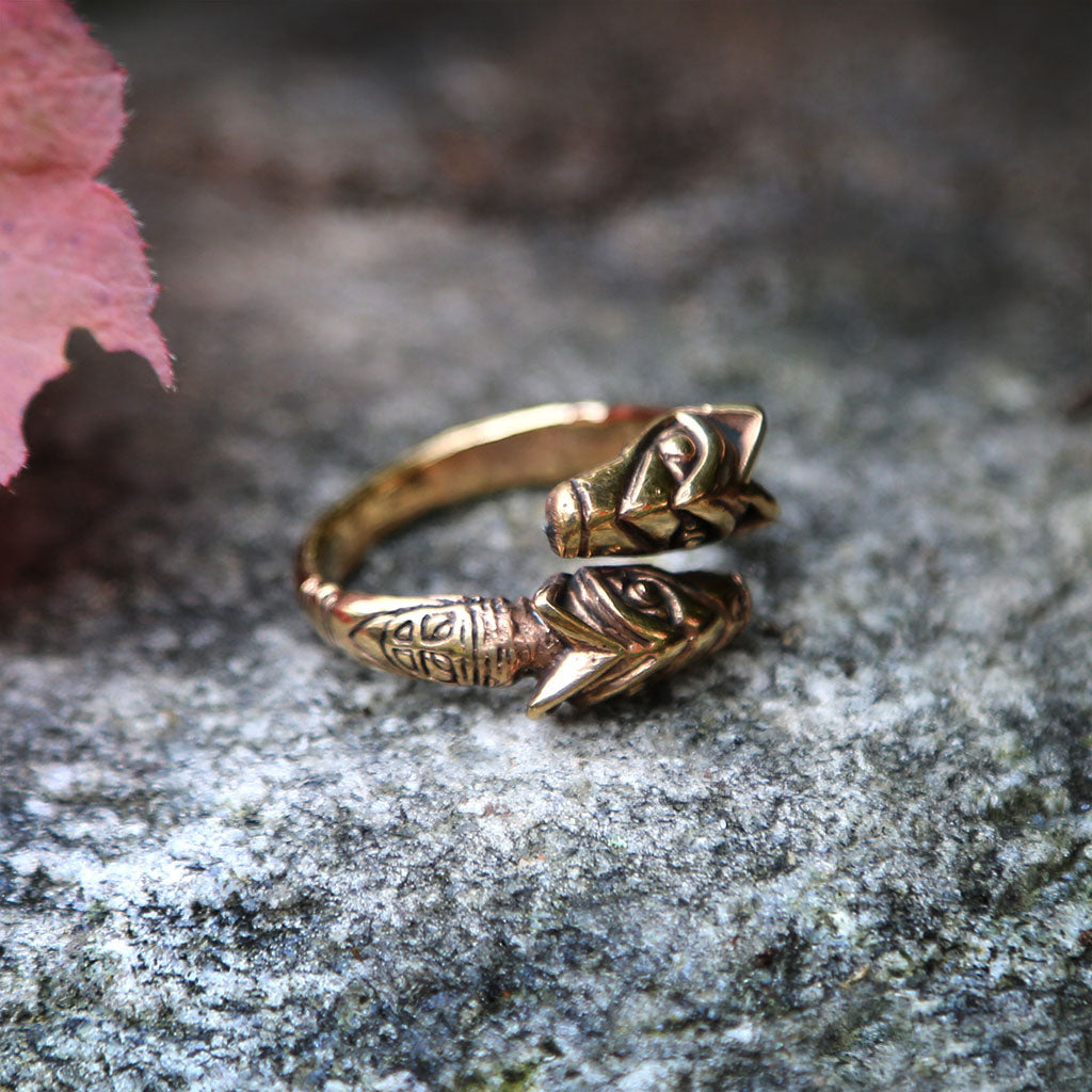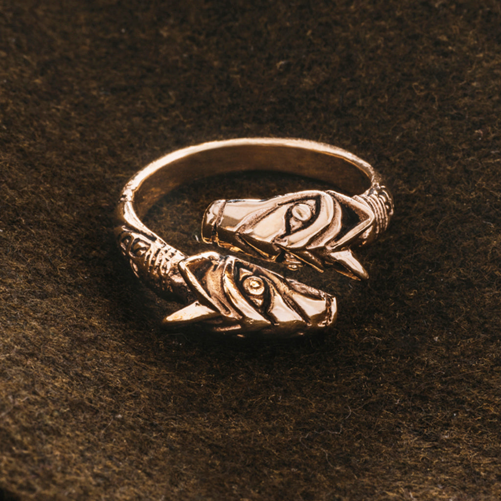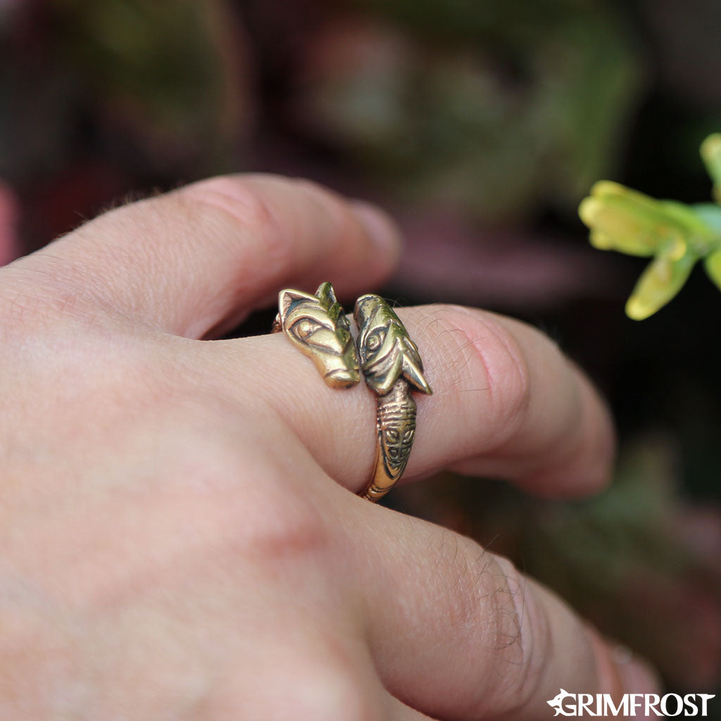 Ring in solid bronze ending in the heads of Geri and Freki (Old Norse both meaning "the ravenous" or "greedy one") - the two wolves which accompanied the Norse god Odin. The ring is adjustable in size and can fit most fingers.