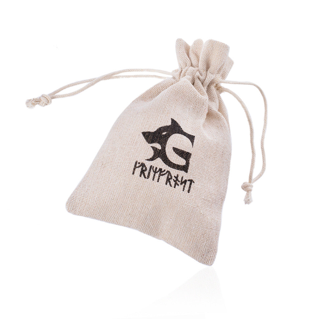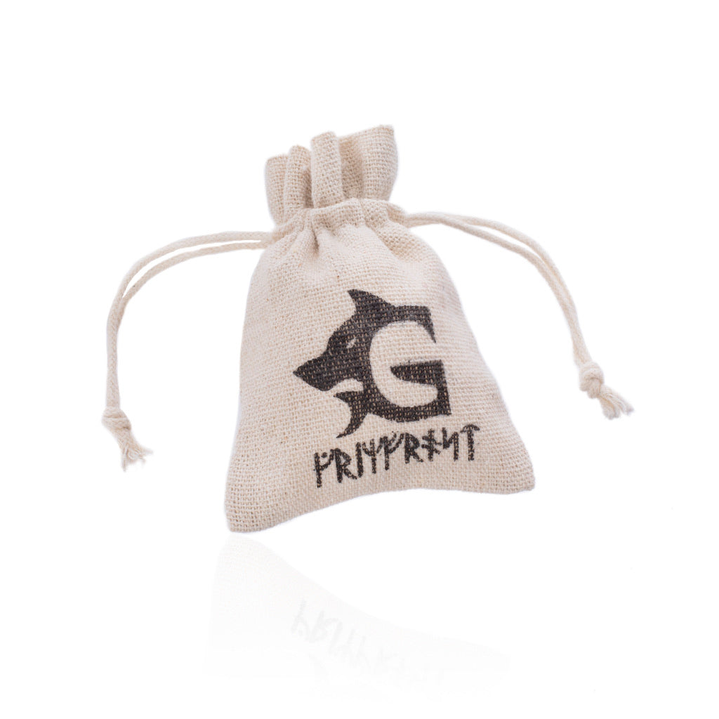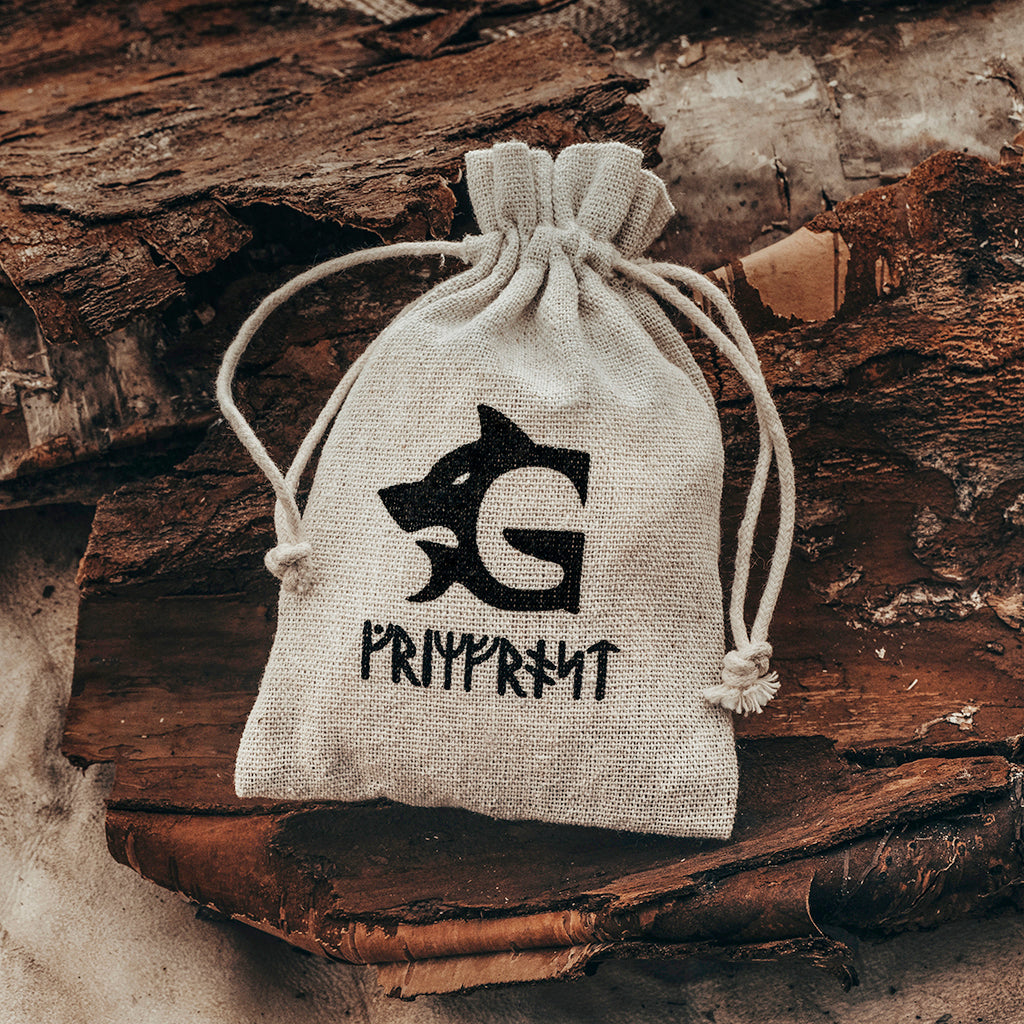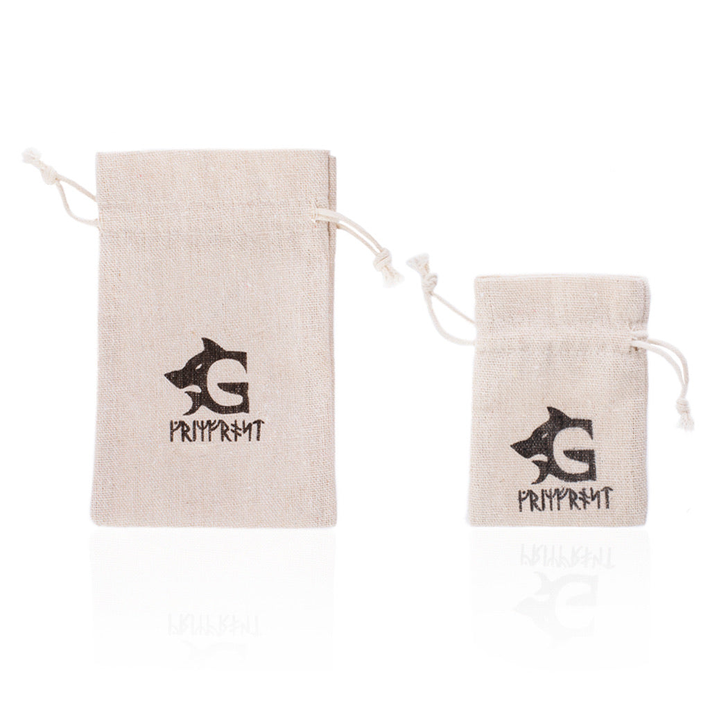 The perfect drawstring bag to hold your gift. It is made in linen and has the Grimfrost logo printed on it. The bag comes in two sizes: The smaller one is perfect for pendants, rings, earrings and such, whilst the medium fits heavy necklaces, beard oil bottles and more.