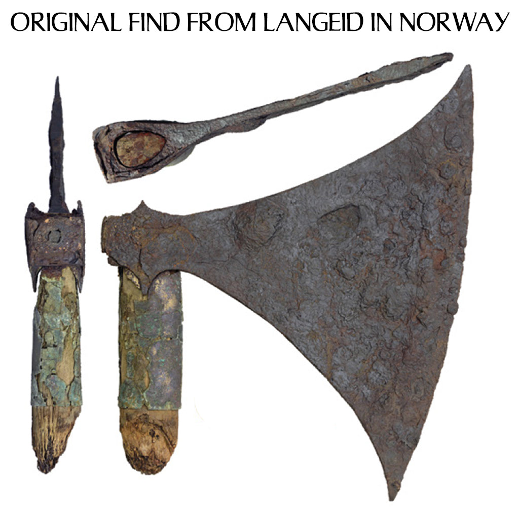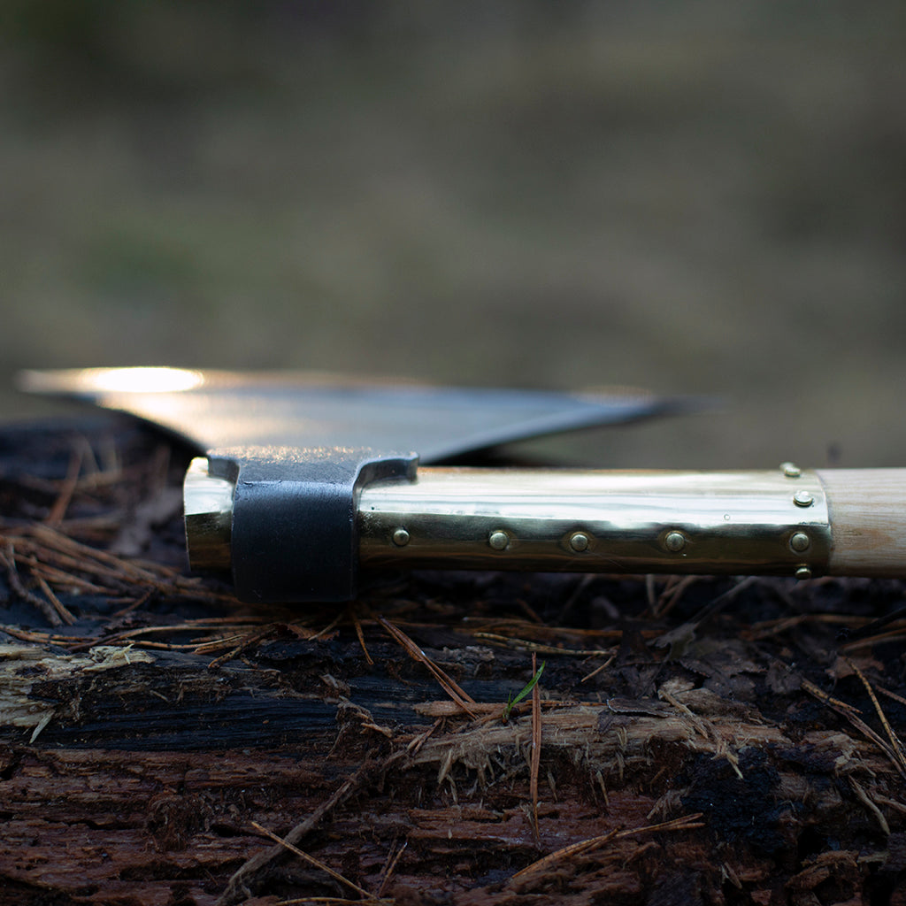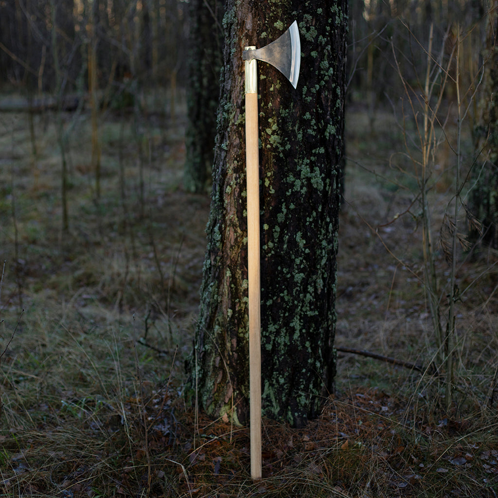 A massive two-handed Viking Broad Axe based on a find from Langeid in Norway. Just as the original, it has a brass cylinder on the shaft that runs through the axe head. Grimfrost in runes is stamped onto the blade as a "makers mark". The shaft is untreated, polished ash that can be treated with linseed oil or anything of your choice. A handstitched leather protector is included. The original axe is today located at the Kulturhistorisk Museum in Norway (Item no: C58882/4).
