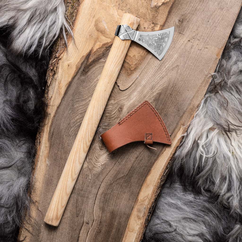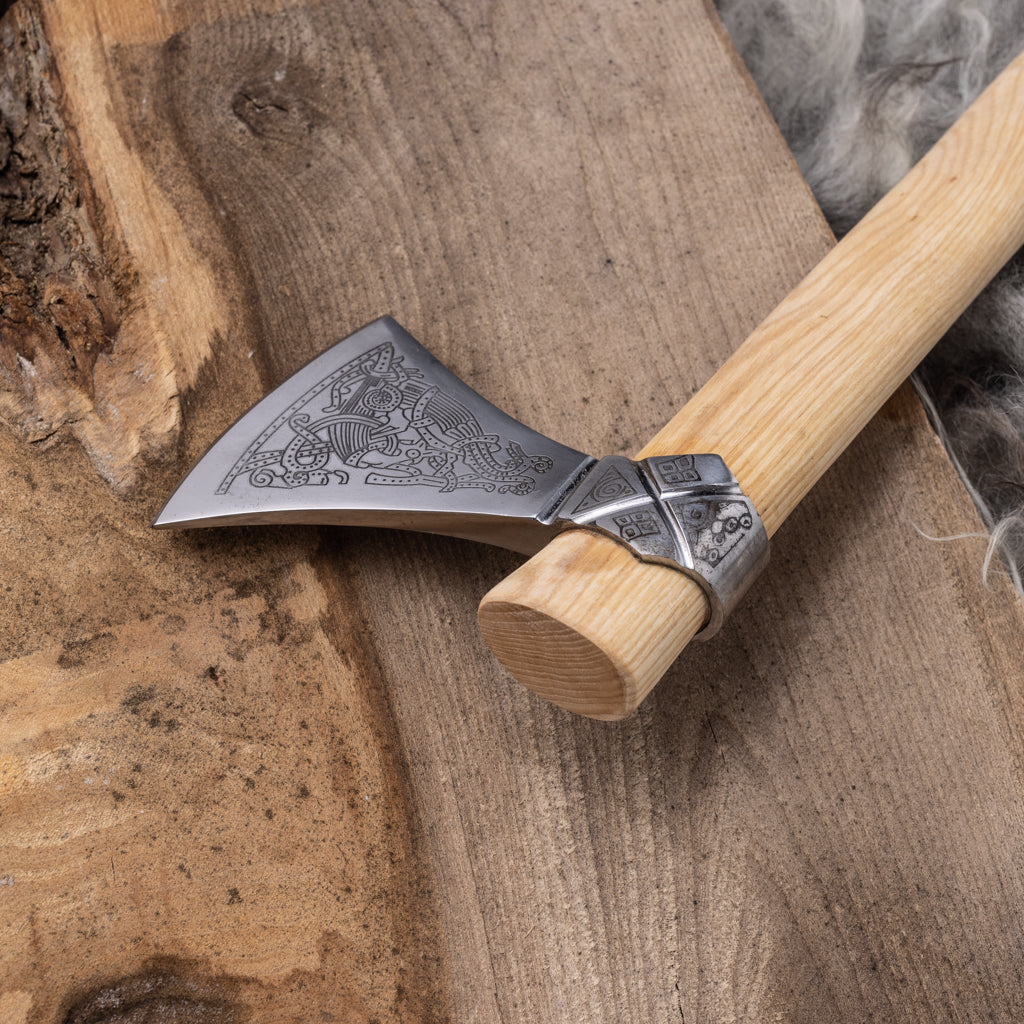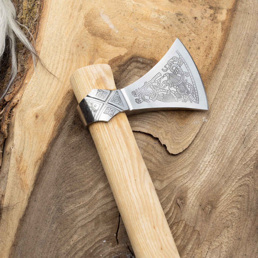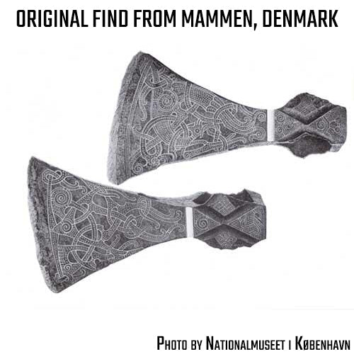 Grimfrost's Mammen Axe is inspired by the richly decorated axe that was recovered from a wealthy burial mound in Jutland, Denmark. The shaft is untreated, polished ash that can be treated with linseed oil or anything of your choice. A hand-sewn leather protector is included.