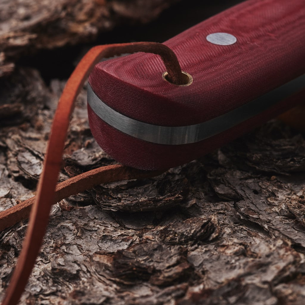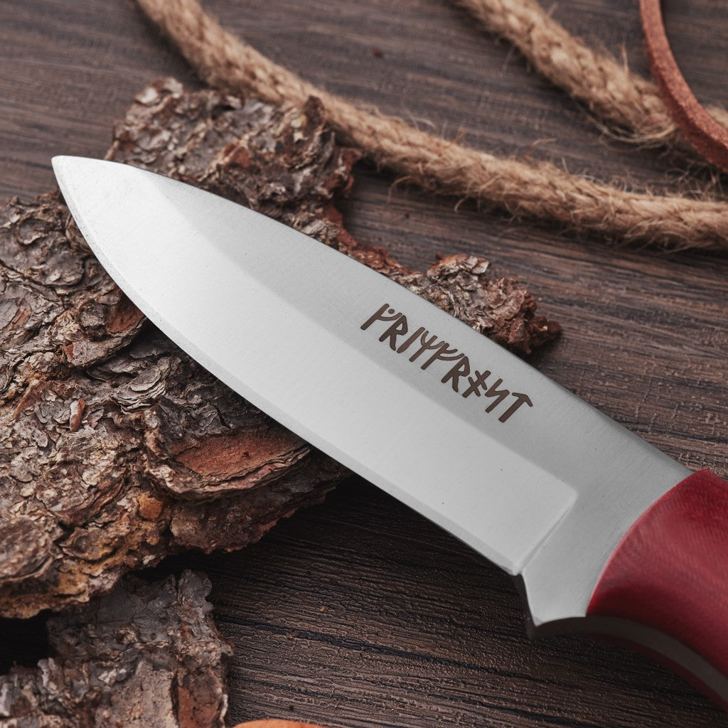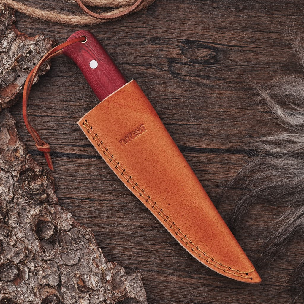 Premium Line hunting knife made for the modern Viking, huntsman or bushcrafter. The sharpened blade shapes into a full tang that runs through the wooden grip that sits comfortably in the hand. The sheath is made from sturdy leather that keeps the knife secured in place. A belt loop is positioned on the backside of the sheath.