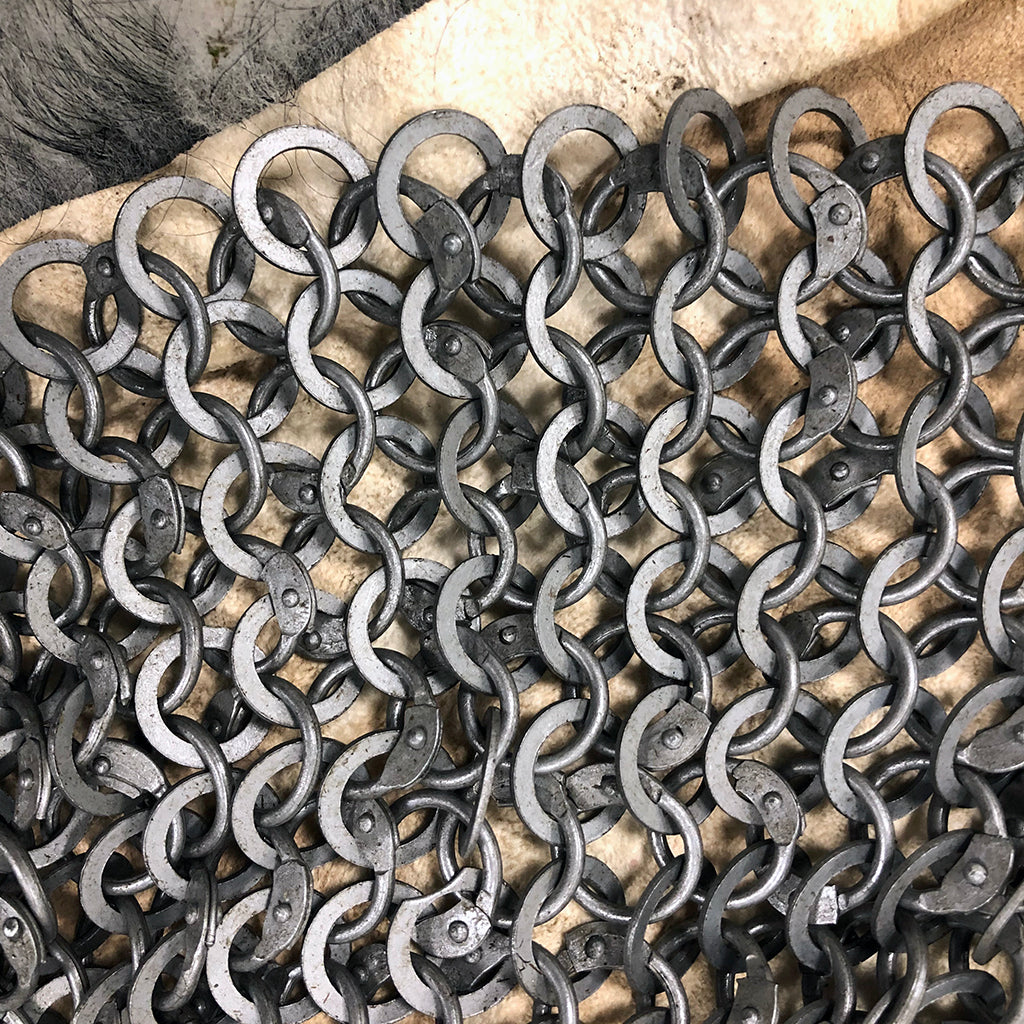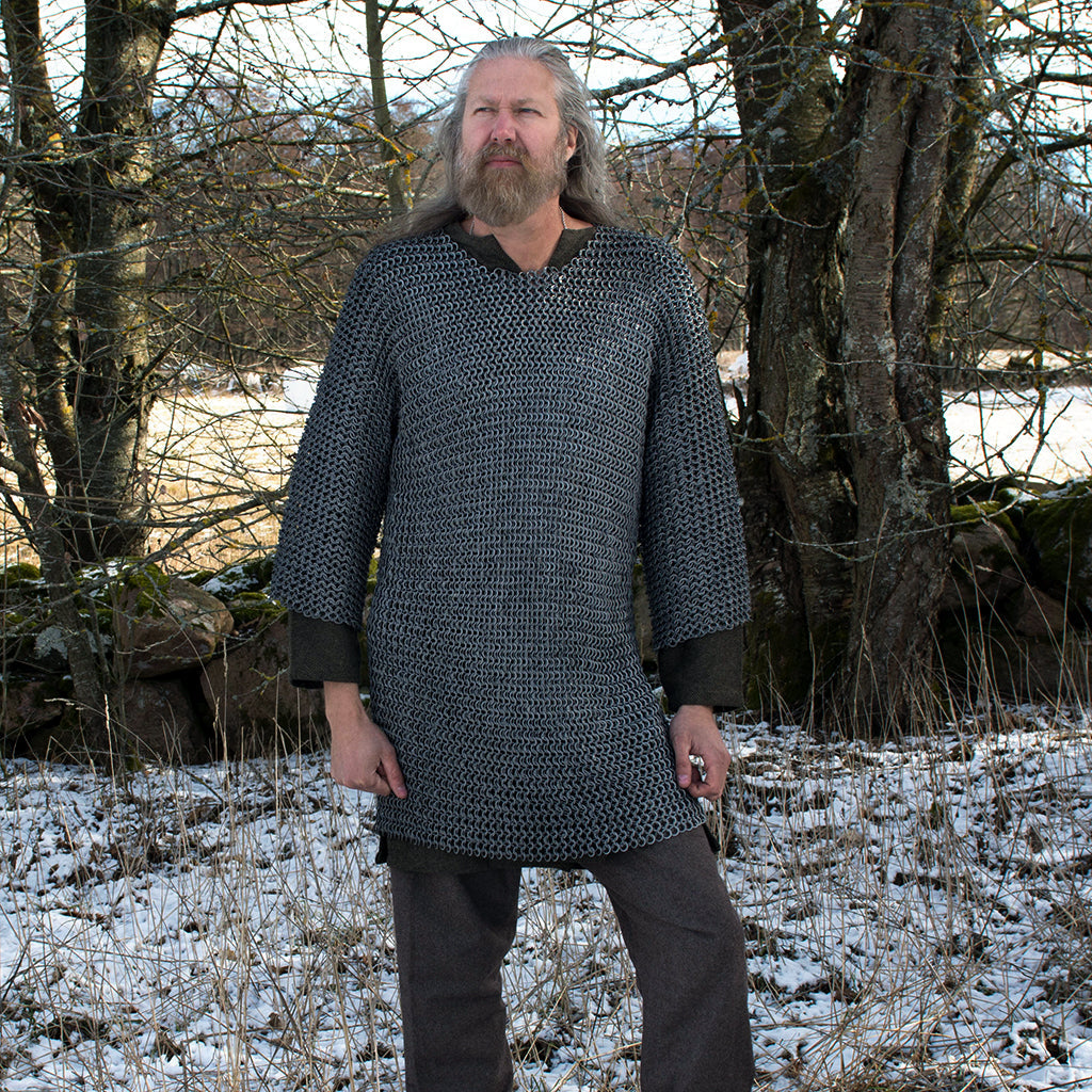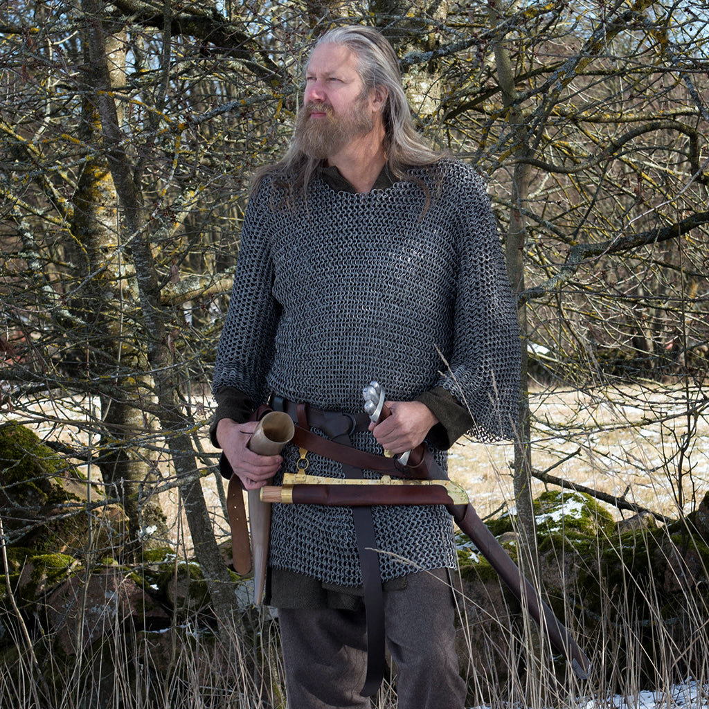 Mail armor was called "Brynja" by Vikings, and it was worn in the form of a mail shirt by those who could afford it. Our mail shirt is made from uncoated 14 gauge riveted round steel rings with 14 gauge solid flat steel washers. The outer diameter of the rings is 11 mm, which gives good protection and a historical appearance. The mail shirt has half sleeves and comes in three sizes.