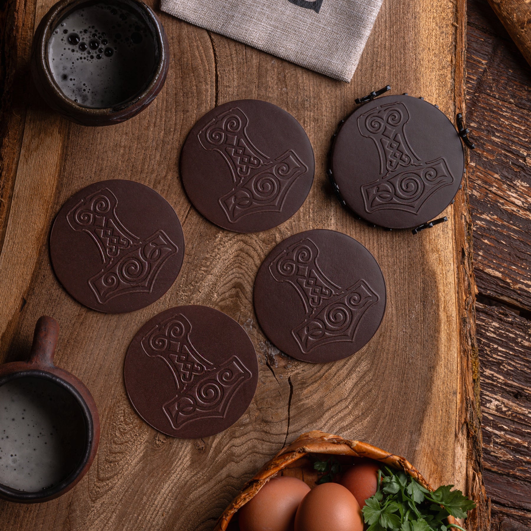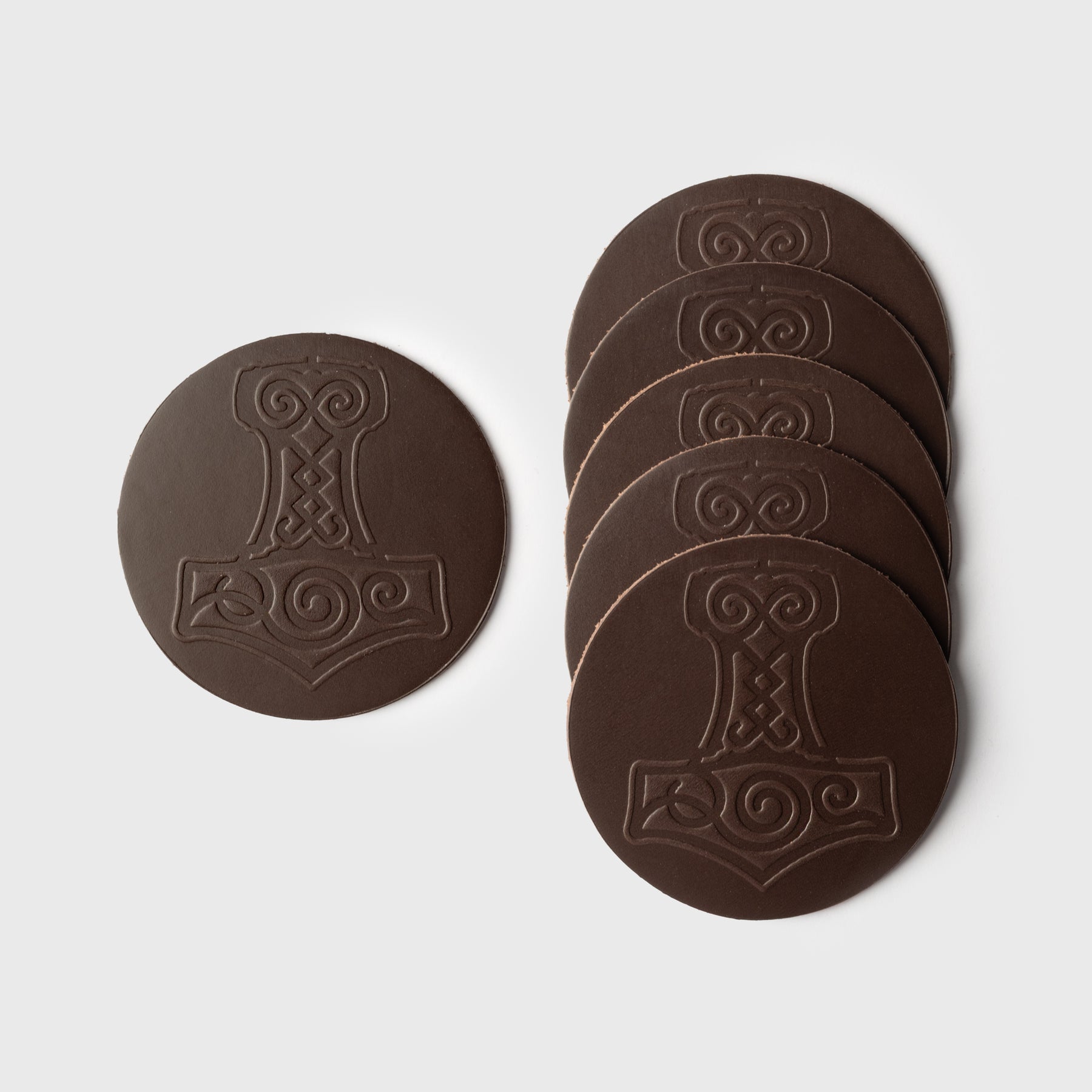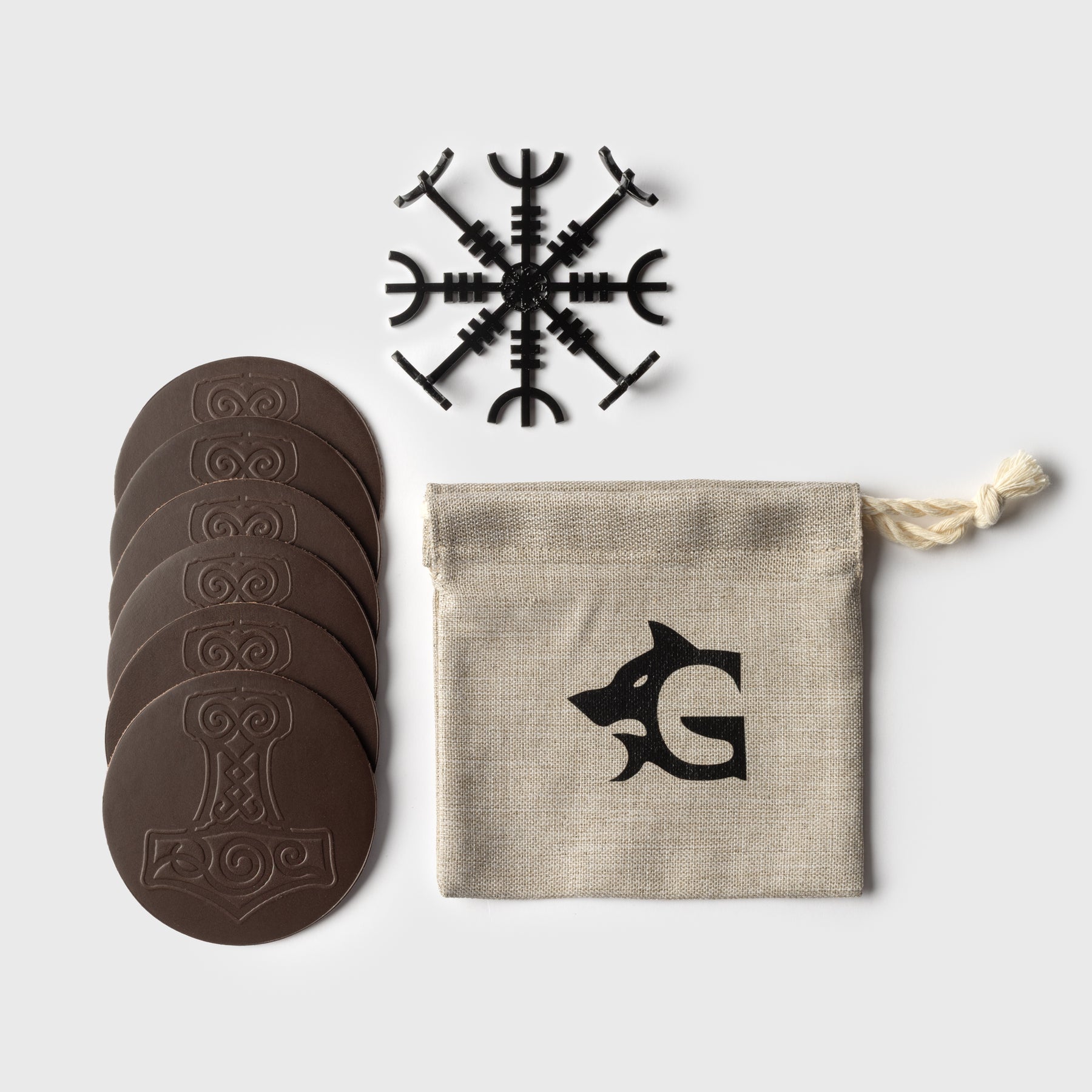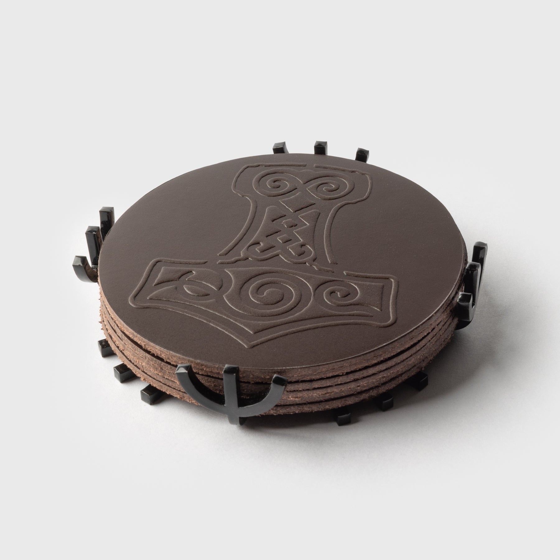 Practical and stylish coasters made of durable, high-quality leather. They come with an iconic Mjolnir design and a forged holder in the shape of the Aegishjalmur symbol.