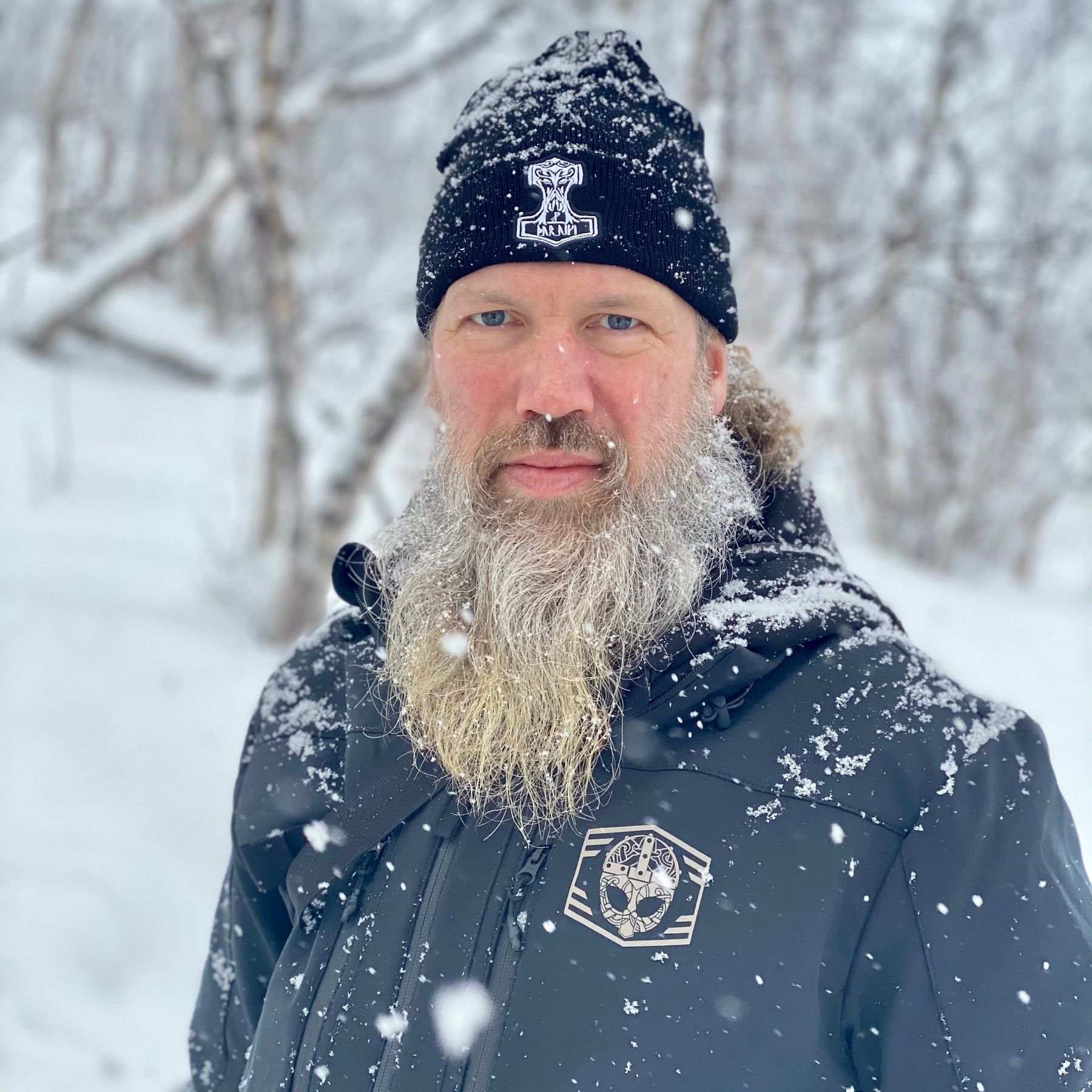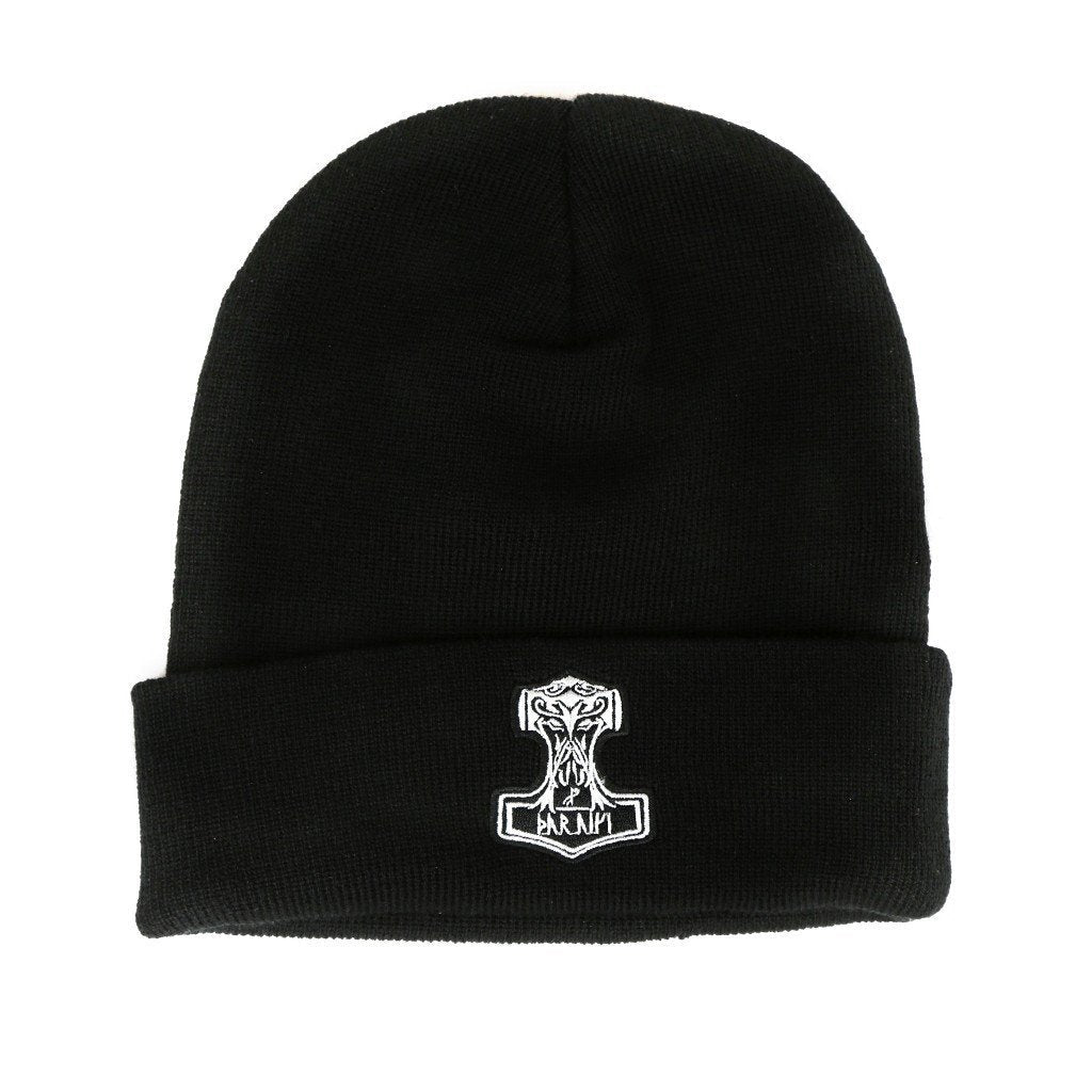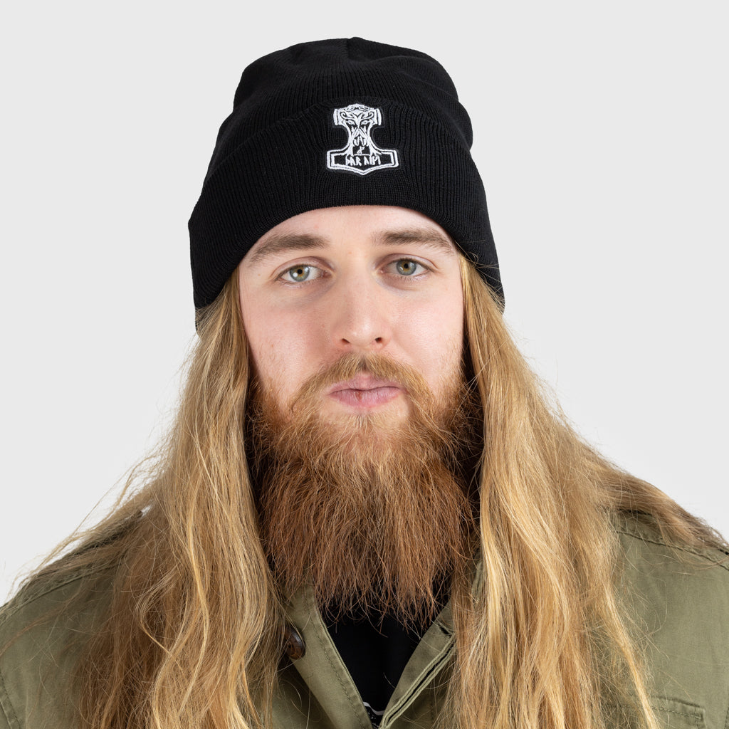 Knit Caps have been used in Scandinavia since the Viking Age - and we're not seeing any reason to stop the habit. This is a super comfortable watch hat in luxurious double layer acrylic. It comes with Grimfrost's Mjölnir embroidery on which "Thor Viki" is written with runes. It is a protective formula used during the Viking Age that translates to "Thor Protect".