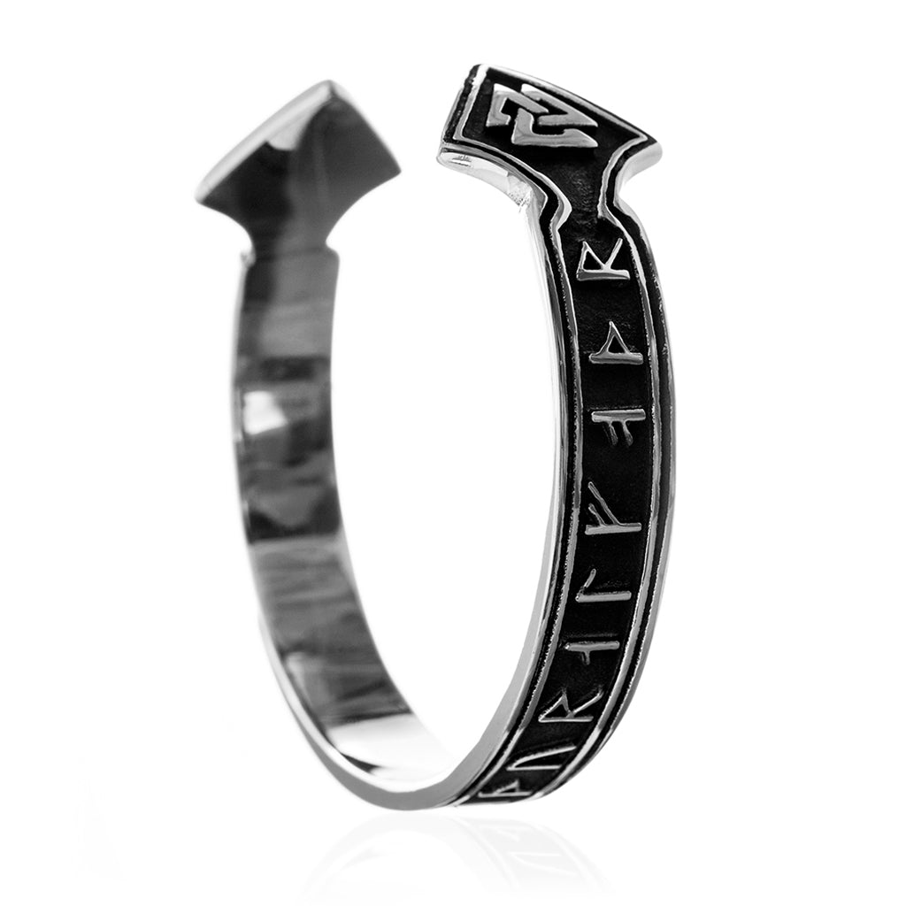 Cuff cast in solid hypoallergenic Stainless Steel ending in the shapes of Gungnir, the spear of Odin, with Valknut symbols in the spear head. Written on it with the Younger Futhark is: "Oðin atriði sviðurr alföðr", which translates to: "Odin the Attacking rider, Wise One and Father of all". They are all different names used for Odin.