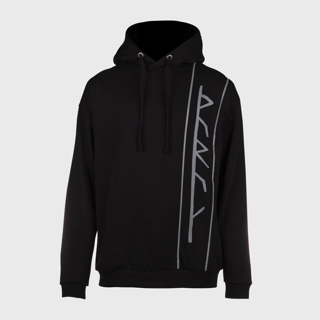 Meet your new favorite hoodie. This premium pullover hoodie is custom-made for Grimfrost in soft, luxurious organic cotton. Even the dyeing and printing processes are fully organic, which is good for both You and Mother Earth. To top things off, we have given the drawstring eyelets a Younger Futhark runic circle.