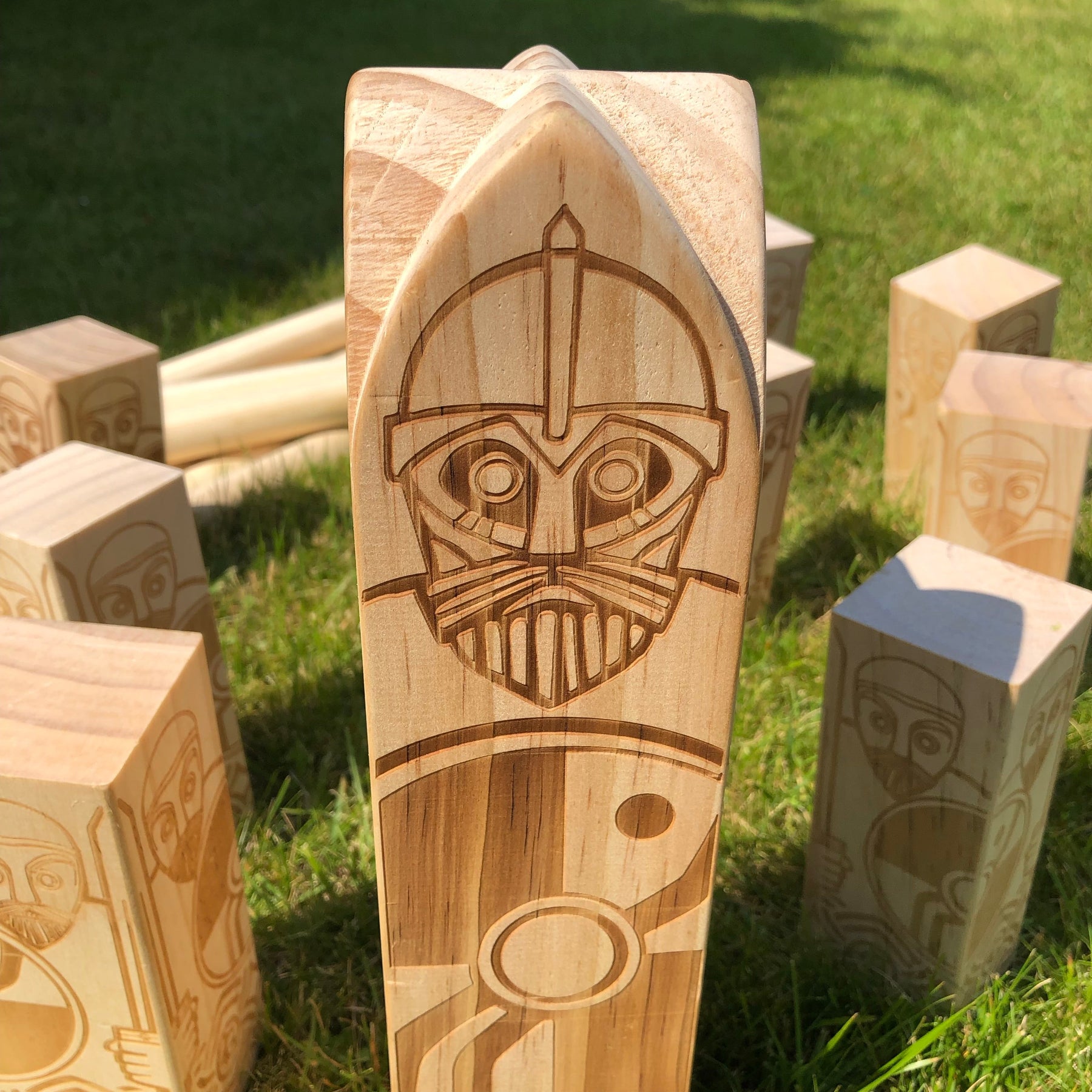 Premium Kubb game with burned and carved artwork depicting the King and the Warriors that make up the set. The artwork is inspired by historical Viking Age designs.