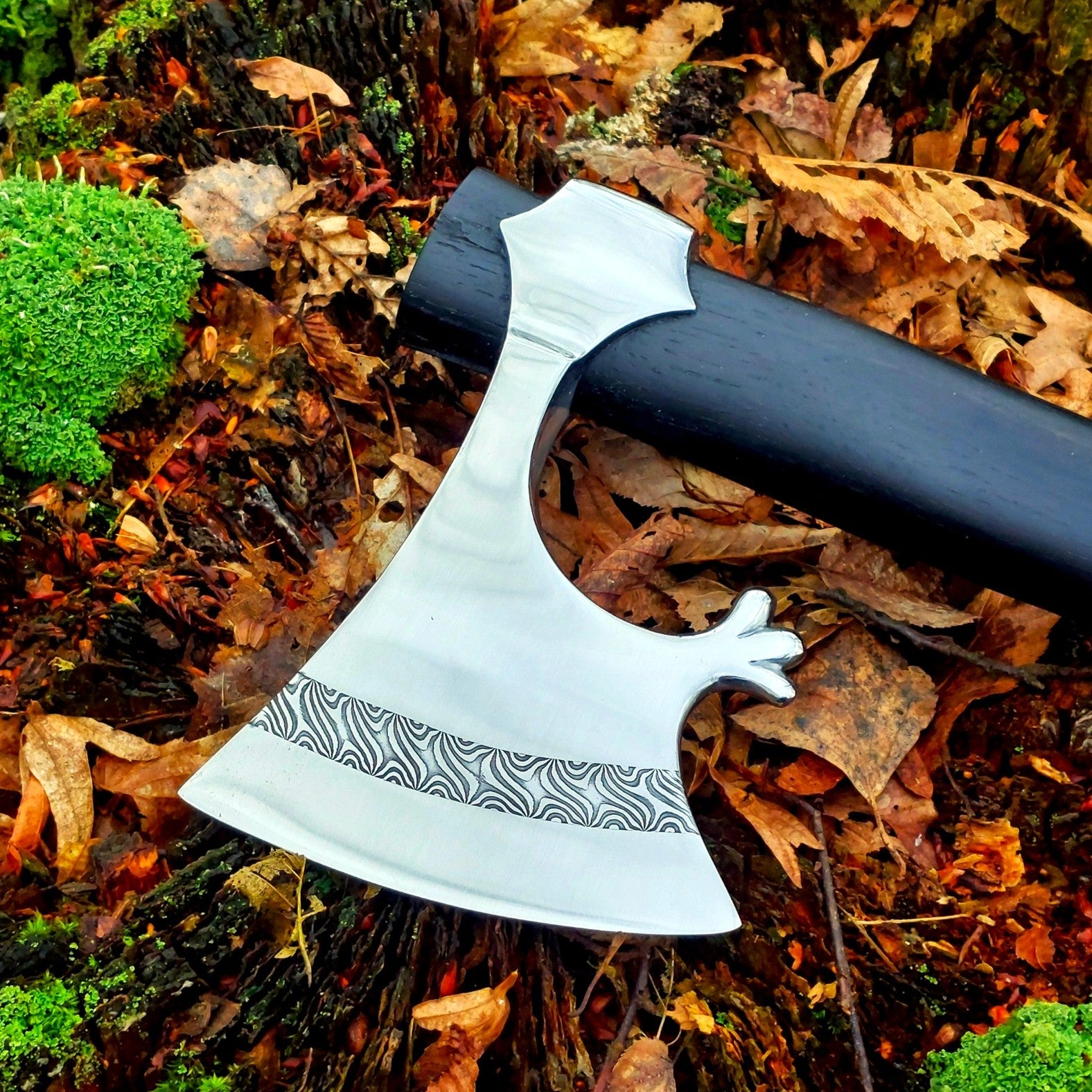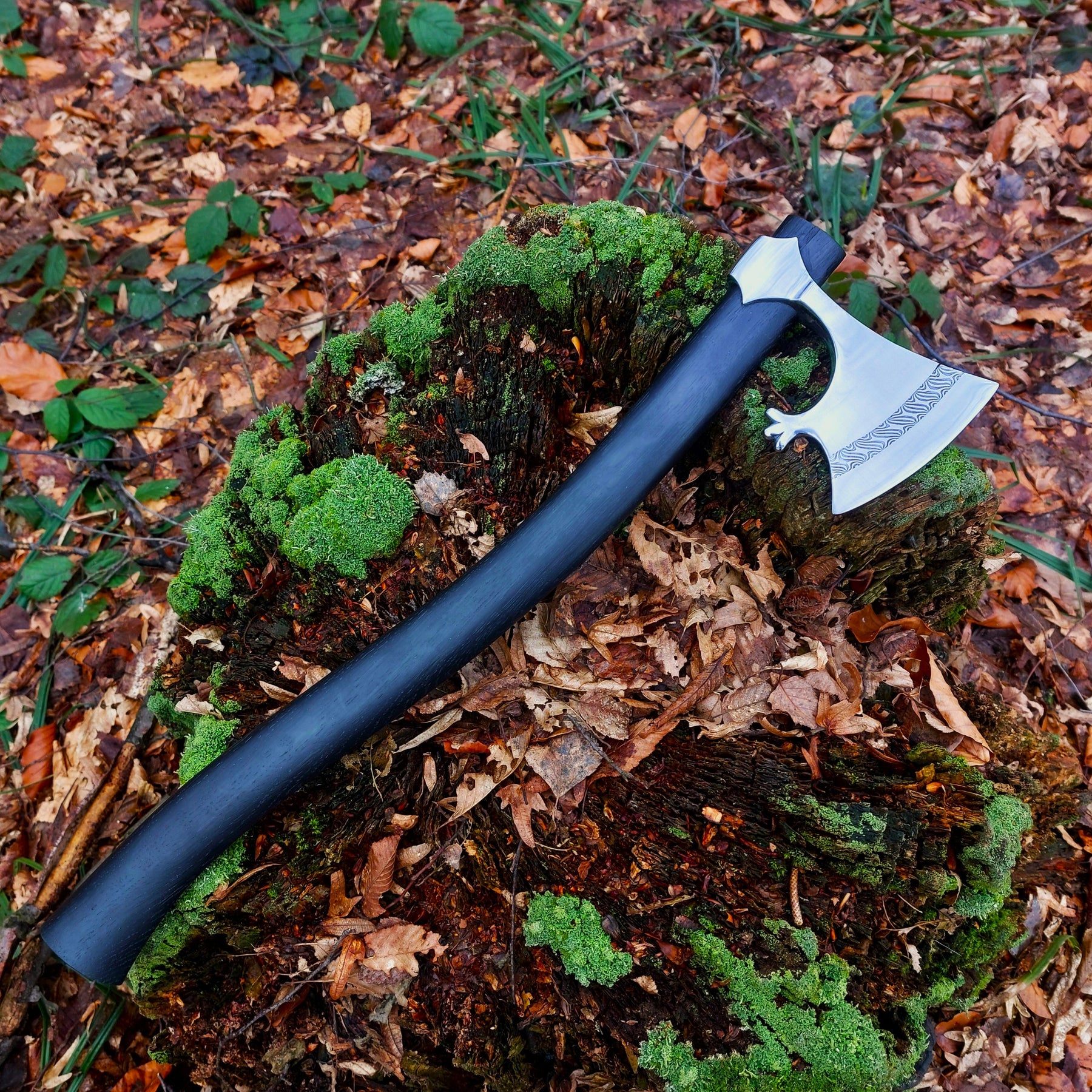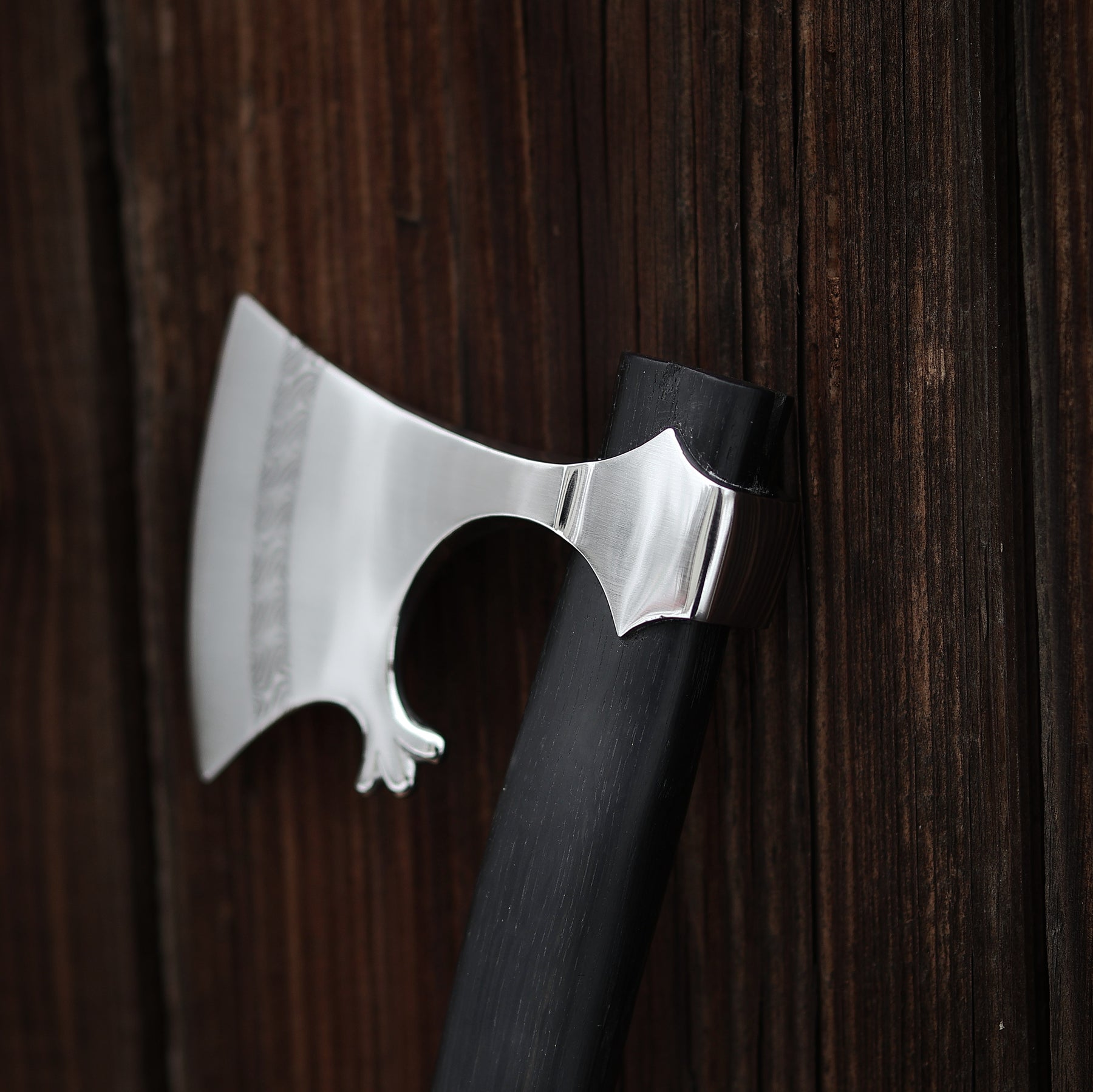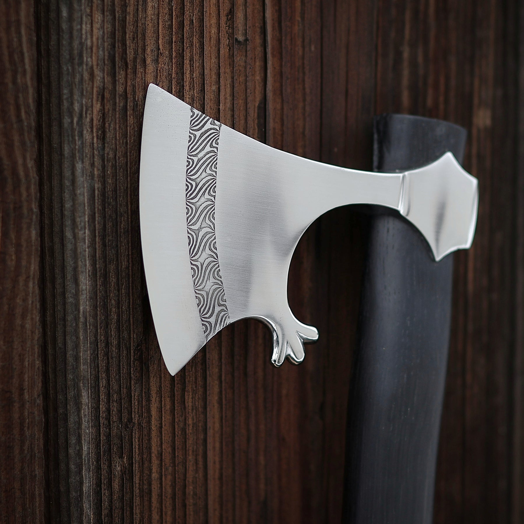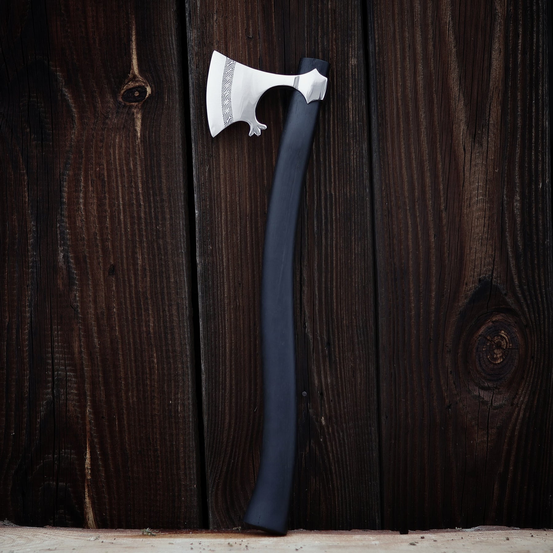 This piece is individually handcrafted with meticulous attention to historical detail and traditional forging techniques, giving it a character that feels truly alive. The combination of the beautiful welded pattern, the deep tone of black oak, and the authentic design makes this axe a masterpiece — both a weapon of the past and a work of art for today.