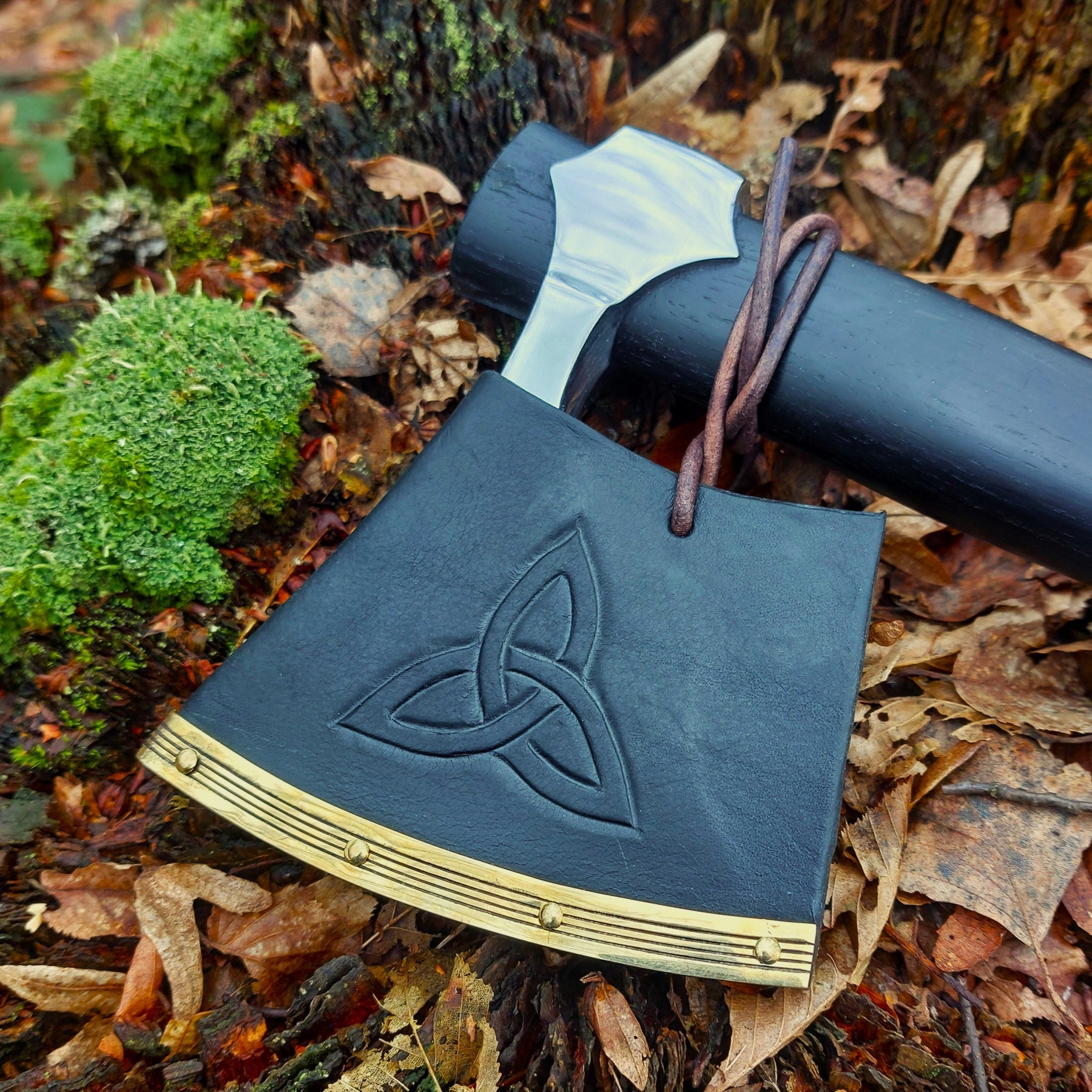Premium Viking axe with a pattern-welded blade and a handle crafted from aged black oak. The axe comes with a hand-stitched leather sheath featuring an embossed motif and solid brass fittings. It is based on an original find from Runhällen, Uppland in Sweden.