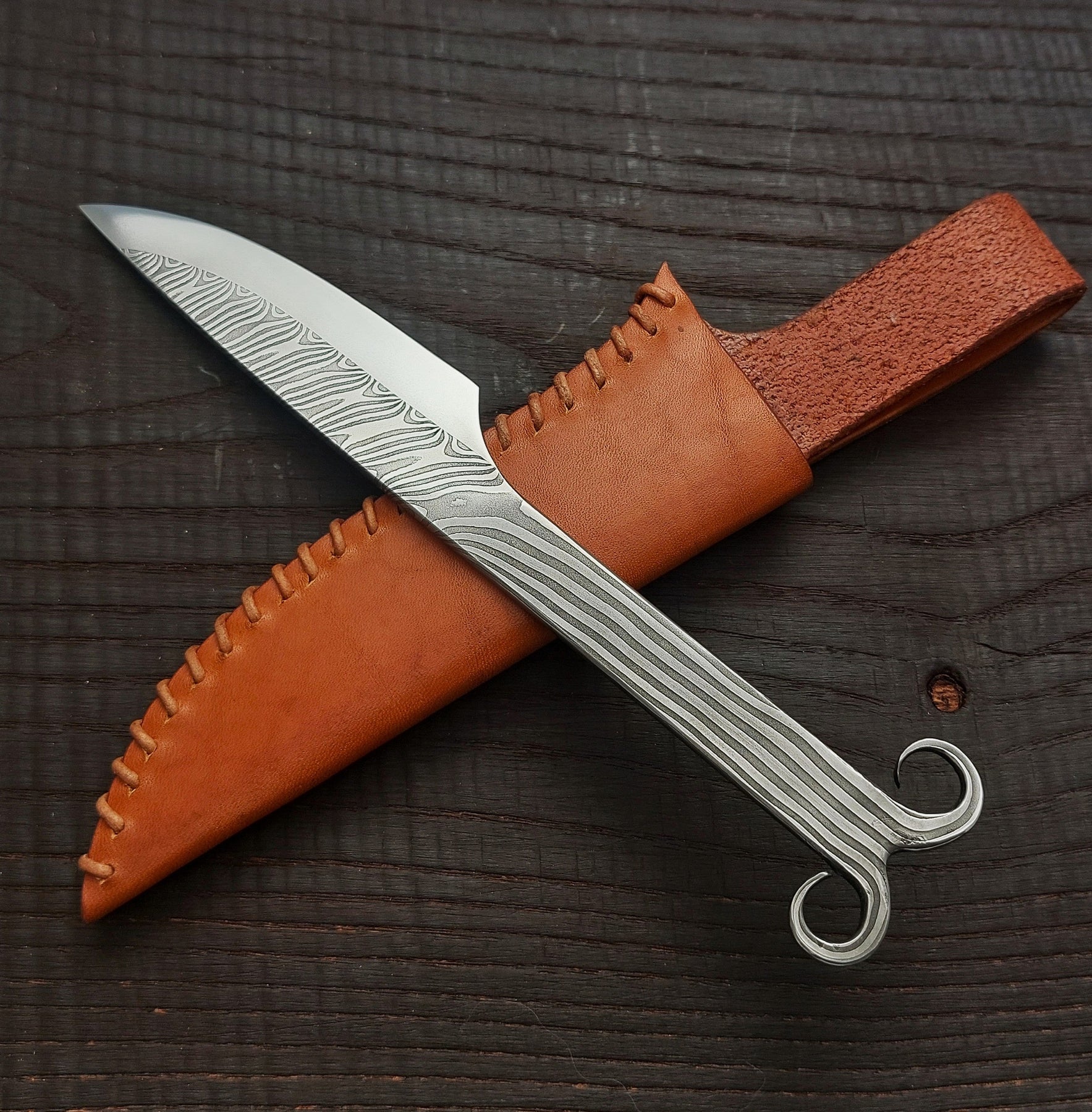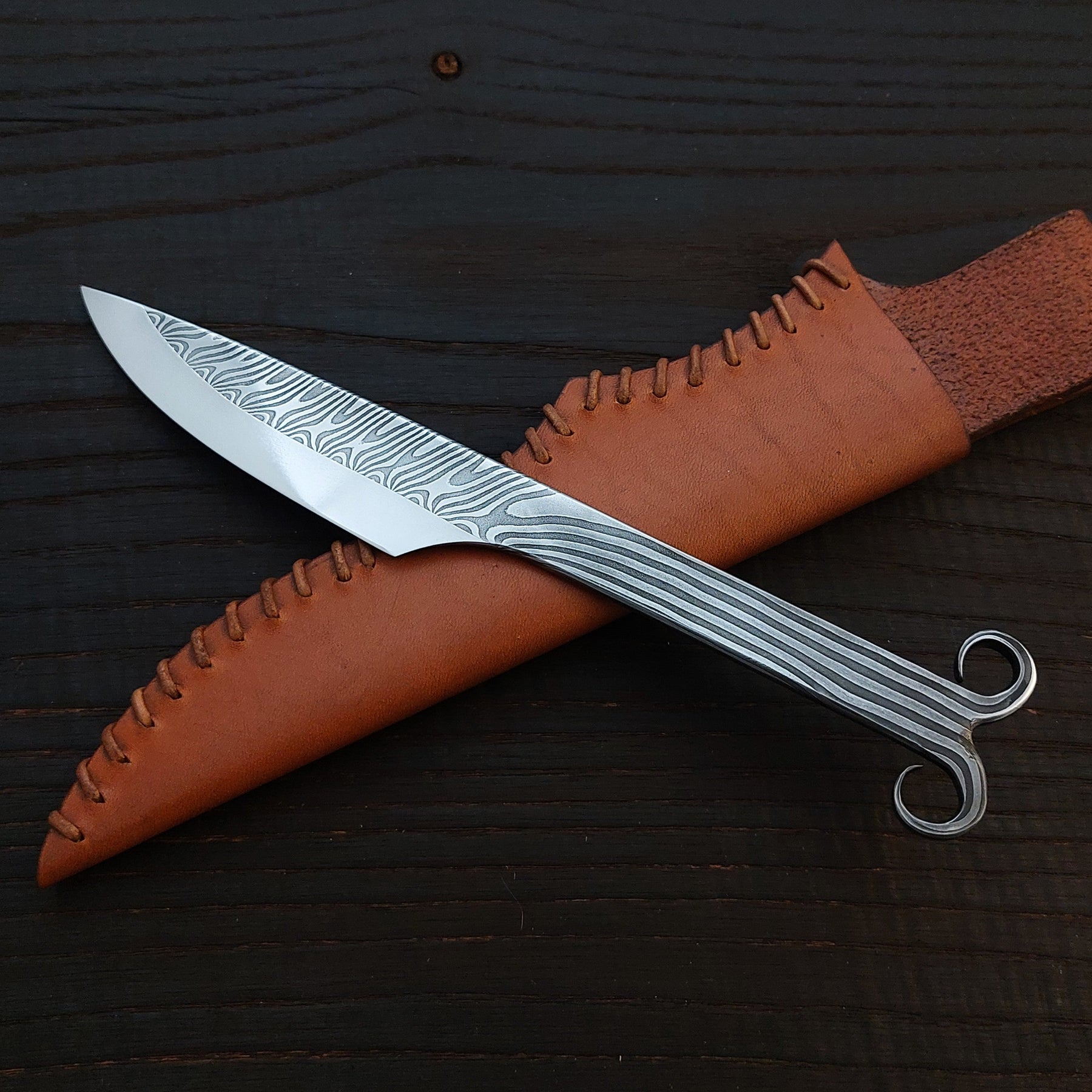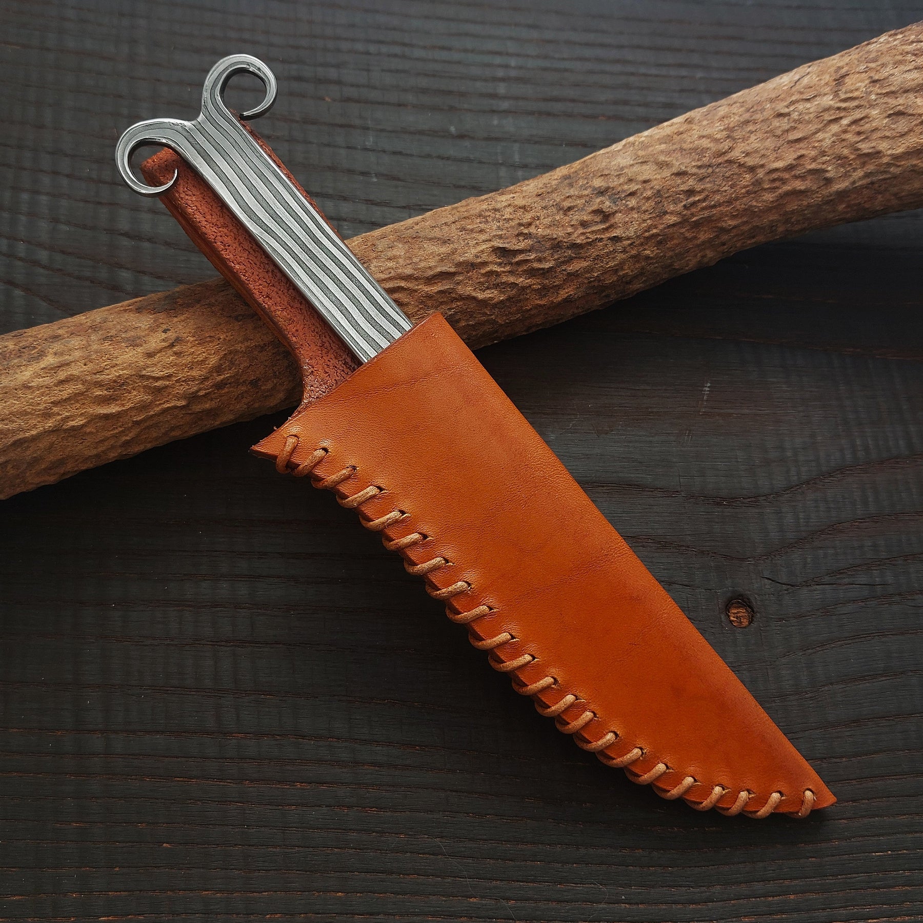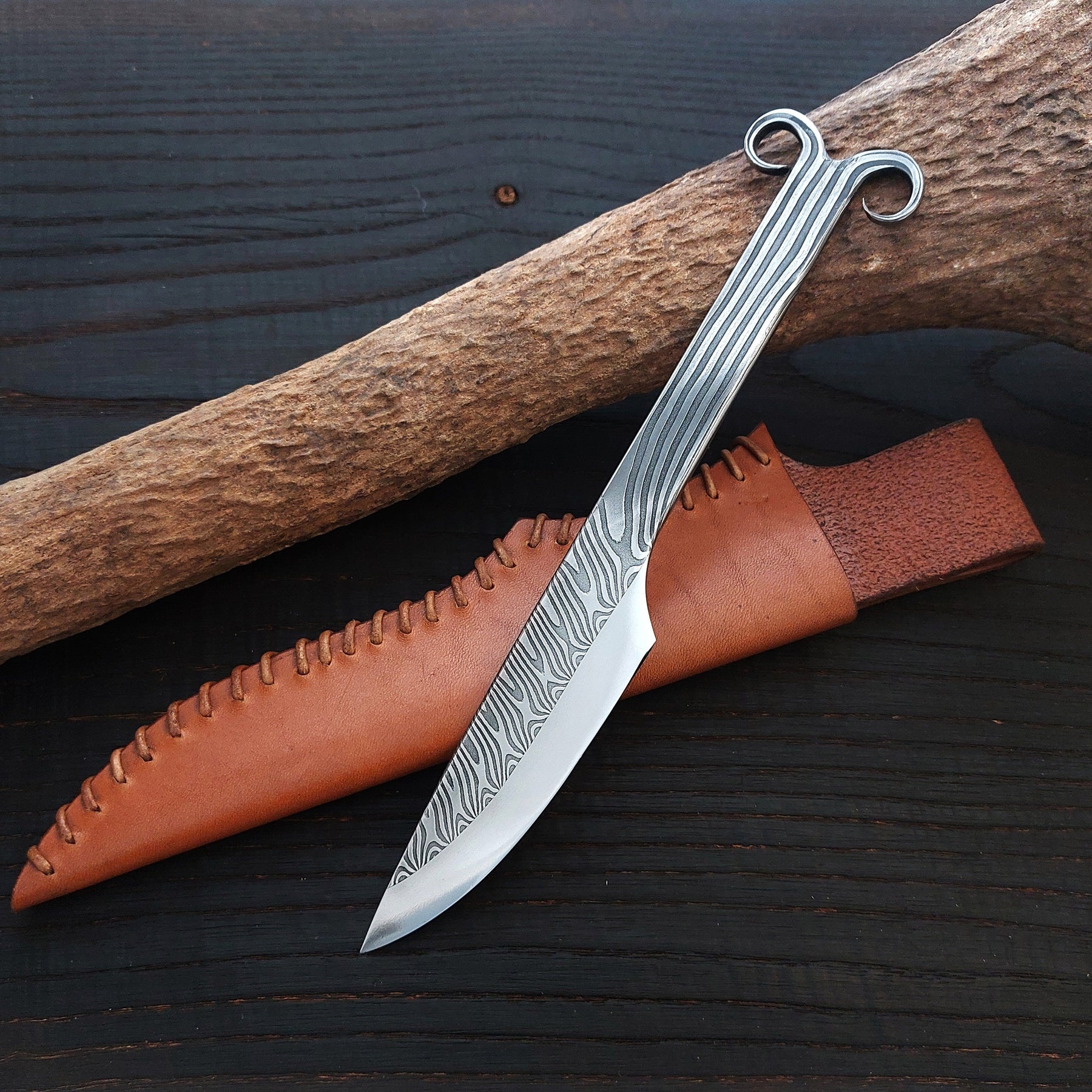 Premium Pattern-Welded Ram's Horns Knife, Chestnut Brown Sheath