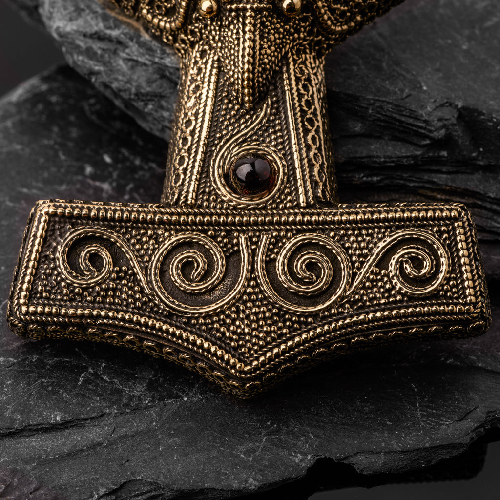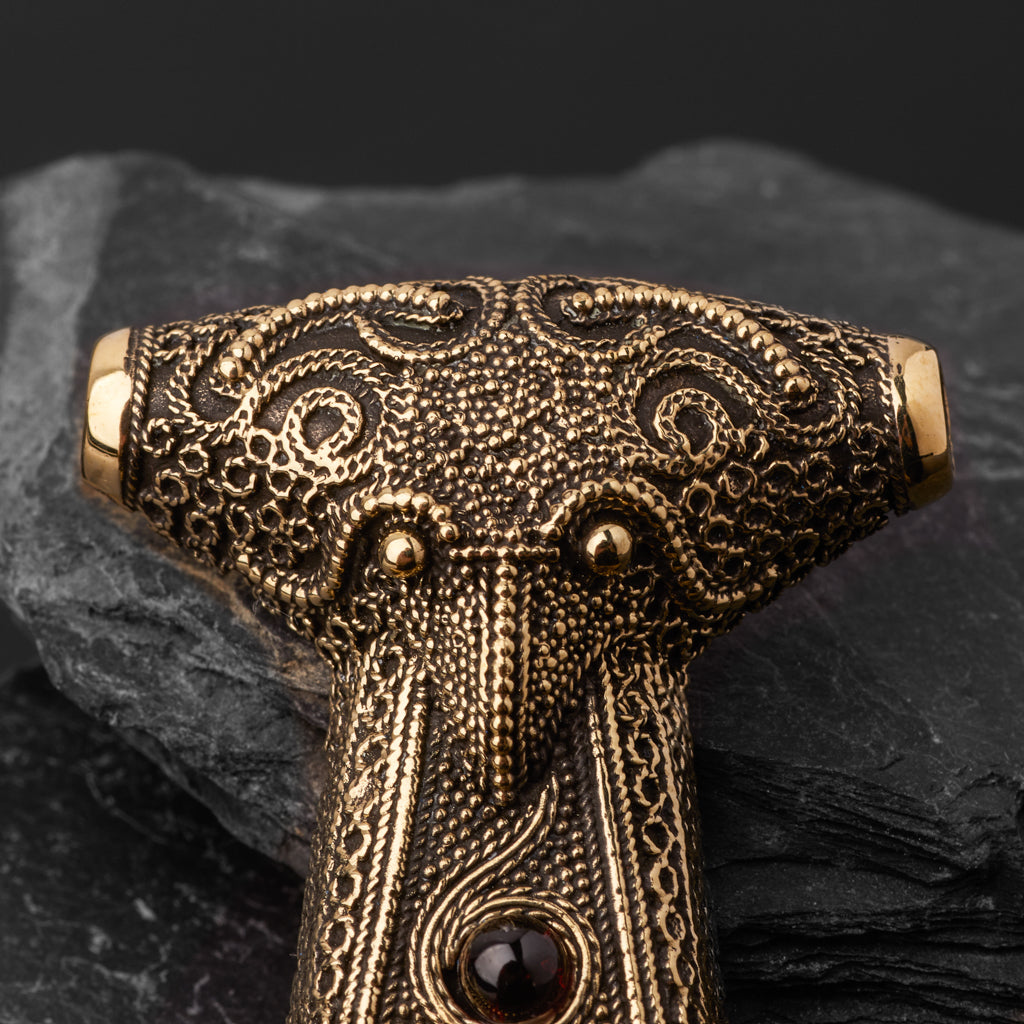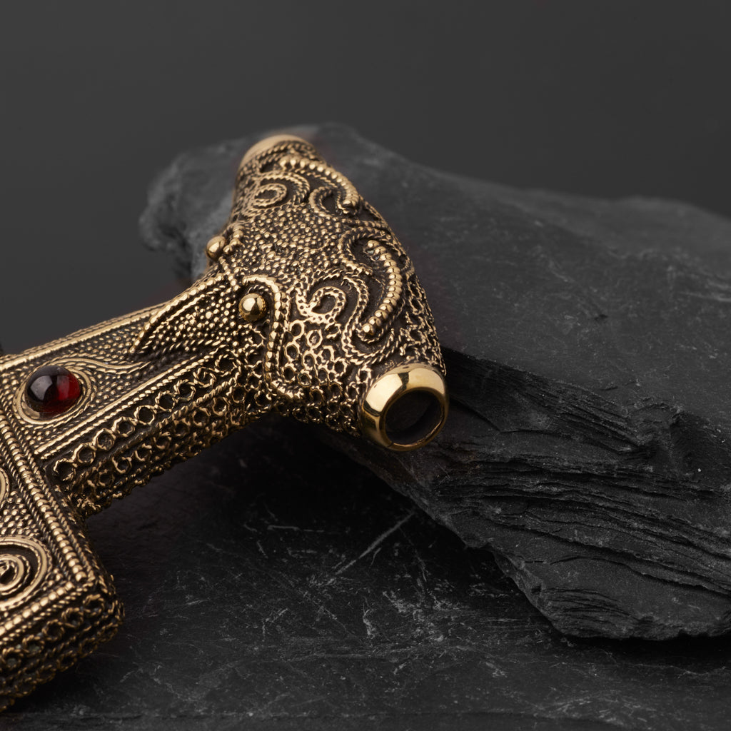 A faithful and carefully handmade replica of the Thor’s hammer found from Kabbarp in Skåne, Sweden. It is solid, amazingly detailed and comes with a garnet gemstone in the center (the original find only has a hole remaining in the center).
