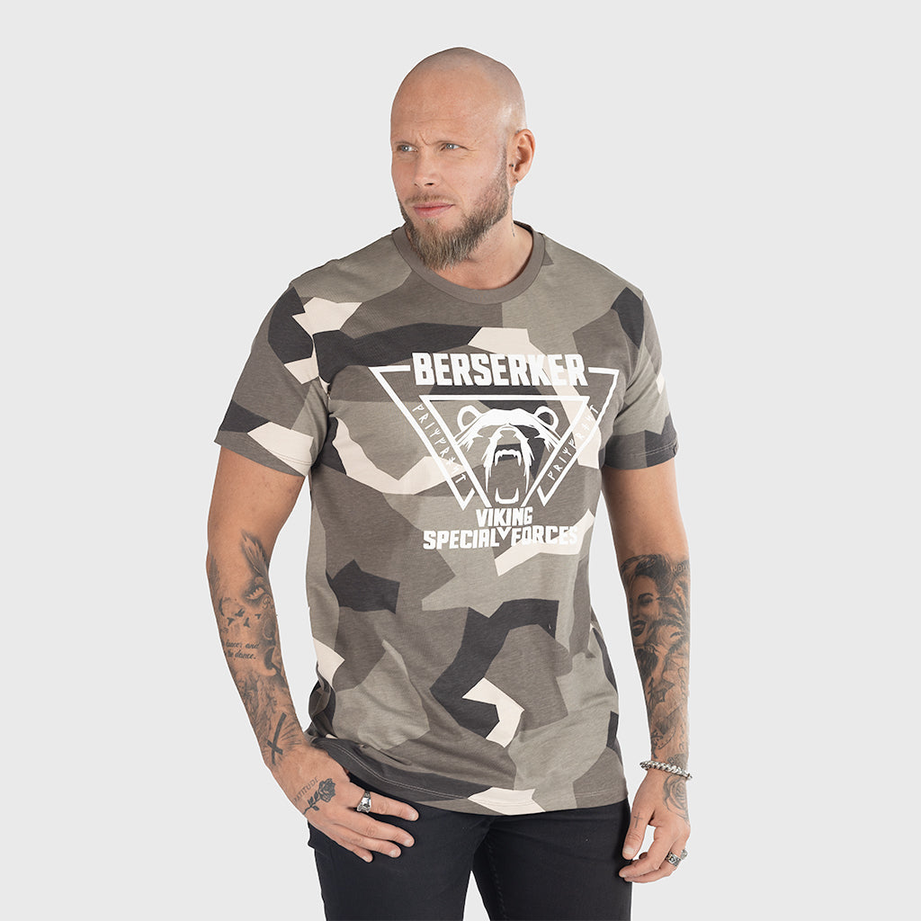 It is printed with "Berserker, Viking Special Forces", a Valknut triple-triangle and a roaring bear. The Valknut is a symbol of Odin, the god of the Berserker. The bear represents the state of mind of the raging Berserker.