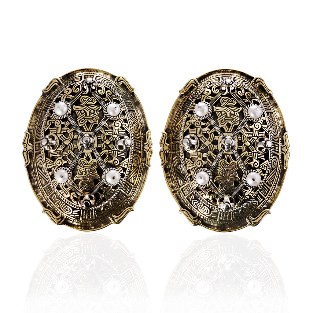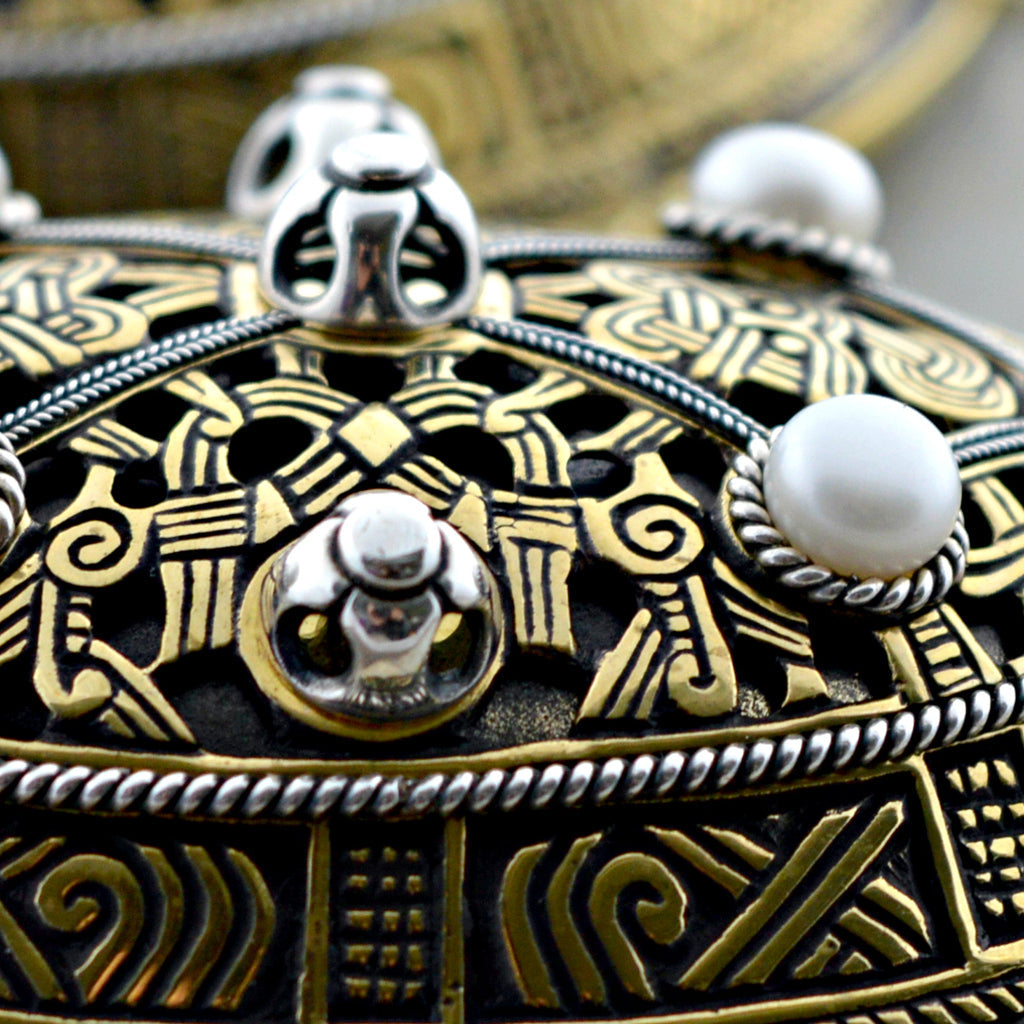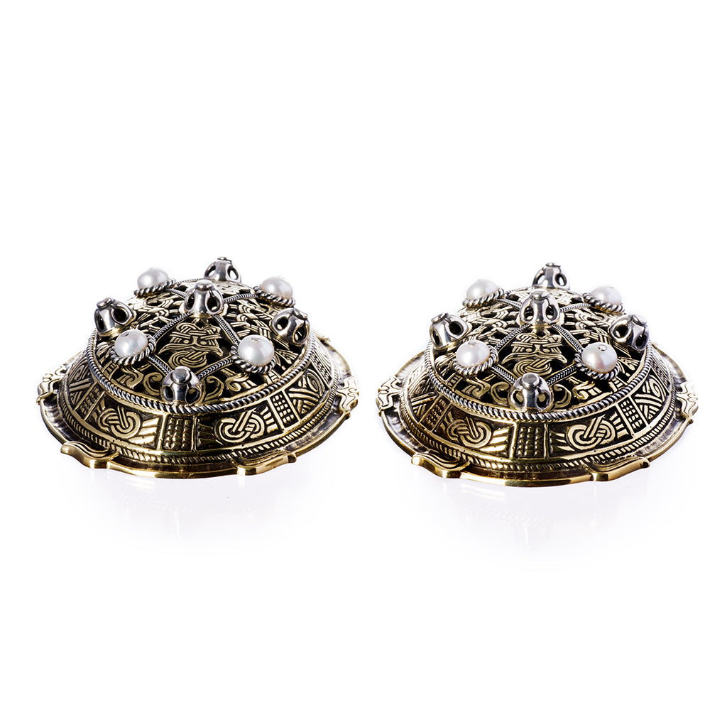 Magnificent Viking tortoise brooches worthy a queen. Handmade just like the original 10th Century brooches they are double shelled, rather than just a one piece cast. The luxurious brooches come with a bronze base and an open work top. Silver filigree wires in two different sizes and five silver rivets contrast the bronze base beautifully. The brooches are topped off with four sweet water pearls each.