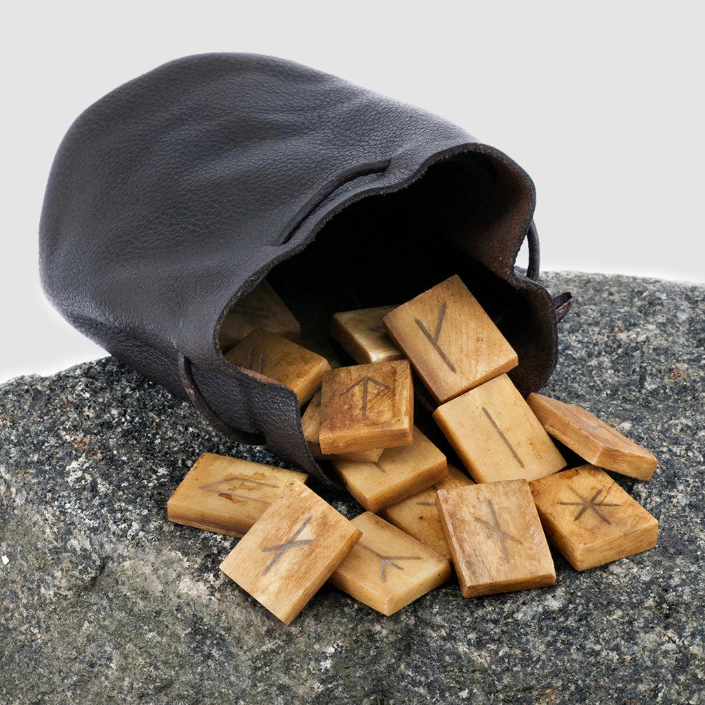 Set of 16 handmade bone tiles, each carrying a carved rune from the Younger Futhark runic system. Use them for games, divination or decoration. The set comes with a leather pouch.
