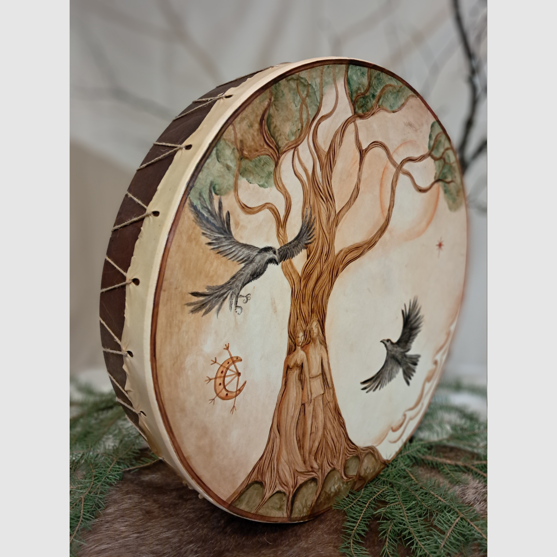 Yggdrasil with Huginn and Muninn, the ravens of Odin, are beautifully painted by hand onto the drum skin. Yggdrasil, the World Tree, is very important in the Viking Age worldview. The entire universe is built around it.
