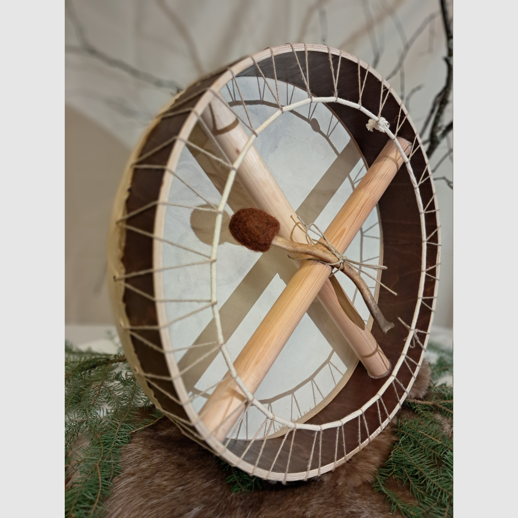 Traditional shaman drum that is carefully handmade in Finland, where old Nordic shamanic traditions have survived throughout the centuries. It has been crafted out of traditional materials without the use of any power tools. Only a handsaw, a knife and sandpaper has been used during the process. This crafting method takes time, but it is necessary if the drum is to have a spirit of its own.