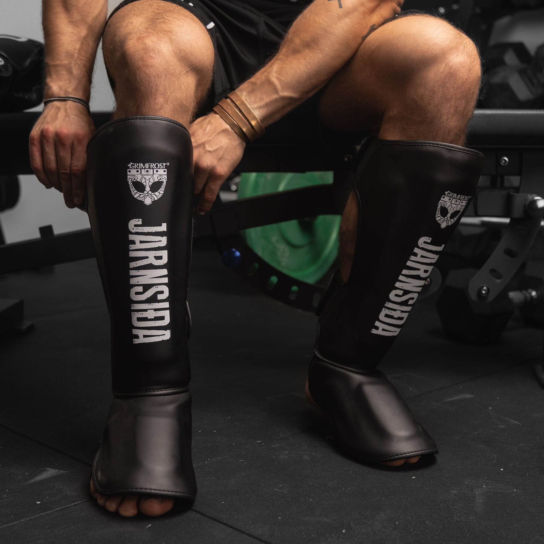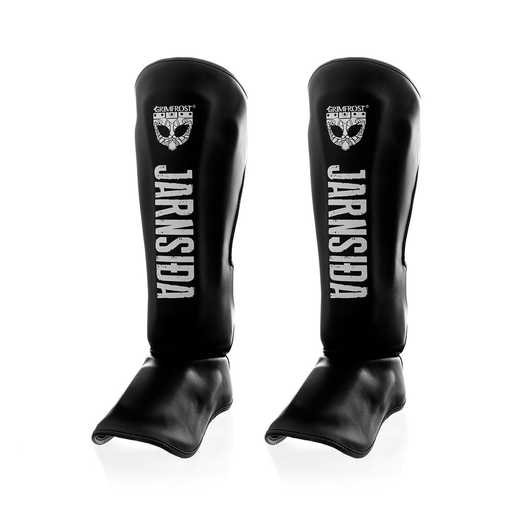Light-weight, pre-curved instep shin guards for the perfect fit. The EVA-foam padding ensures good protection, preventing swollen ankles and bruises. Grimfrost's helmet and a Jarnsida logo are depicted on them. Jarnsida means "Ironside" and was the nickname of a famous Viking who was said to be invulnerable in battle.