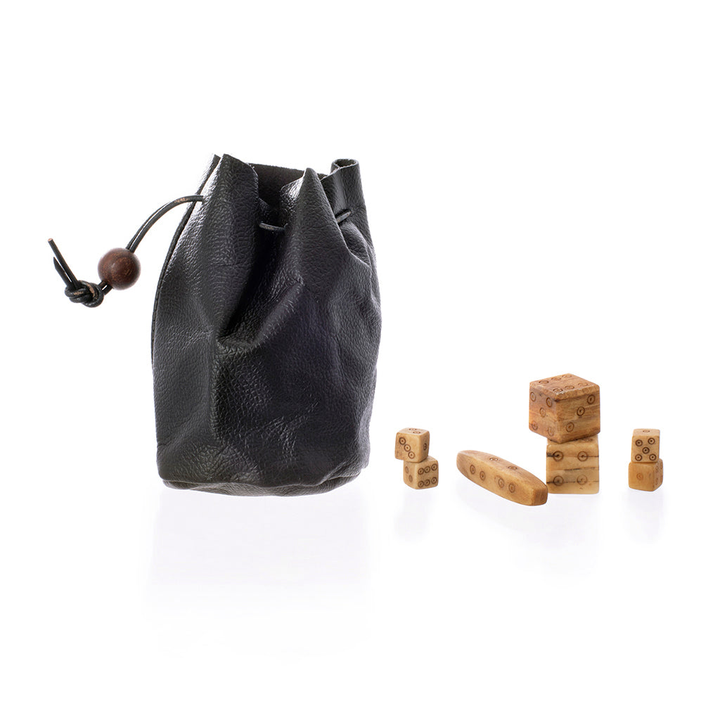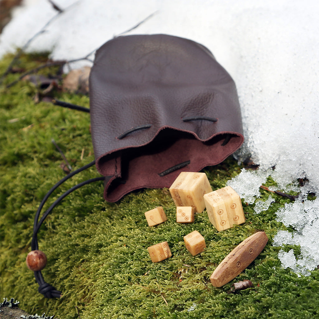 This is a set of handmade bone dice based on archaeological Viking Age finds from Sweden. The set comes with a handstitched leather pouch and rules for two dice games.