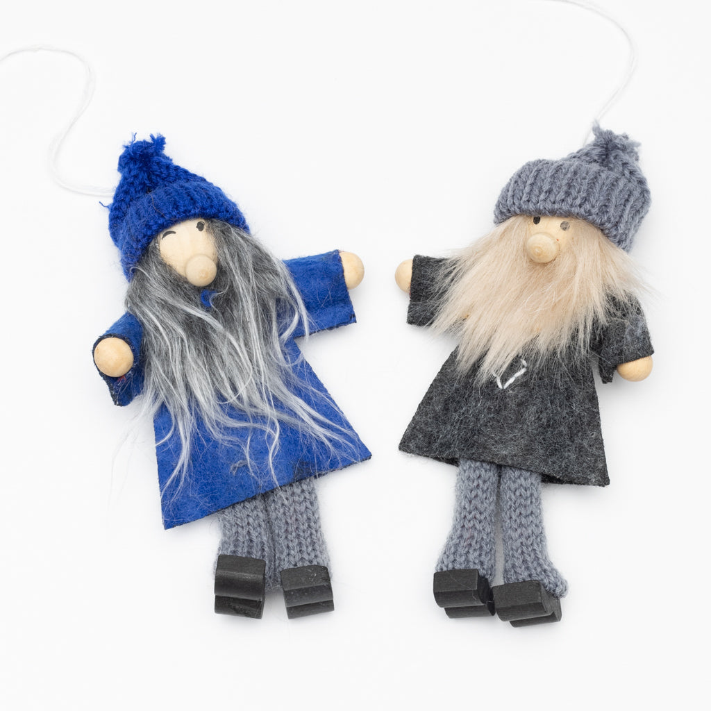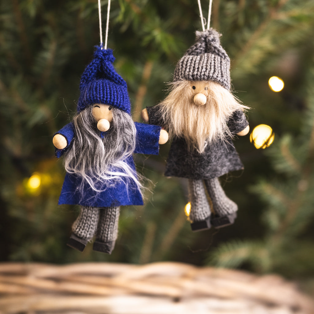 One-eyed Odin in blue and Thor in grey that can be hung from a tree. Both are wearing traditional tunics and knit caps. A stylized hammer is embroidered into Thor's tunic.