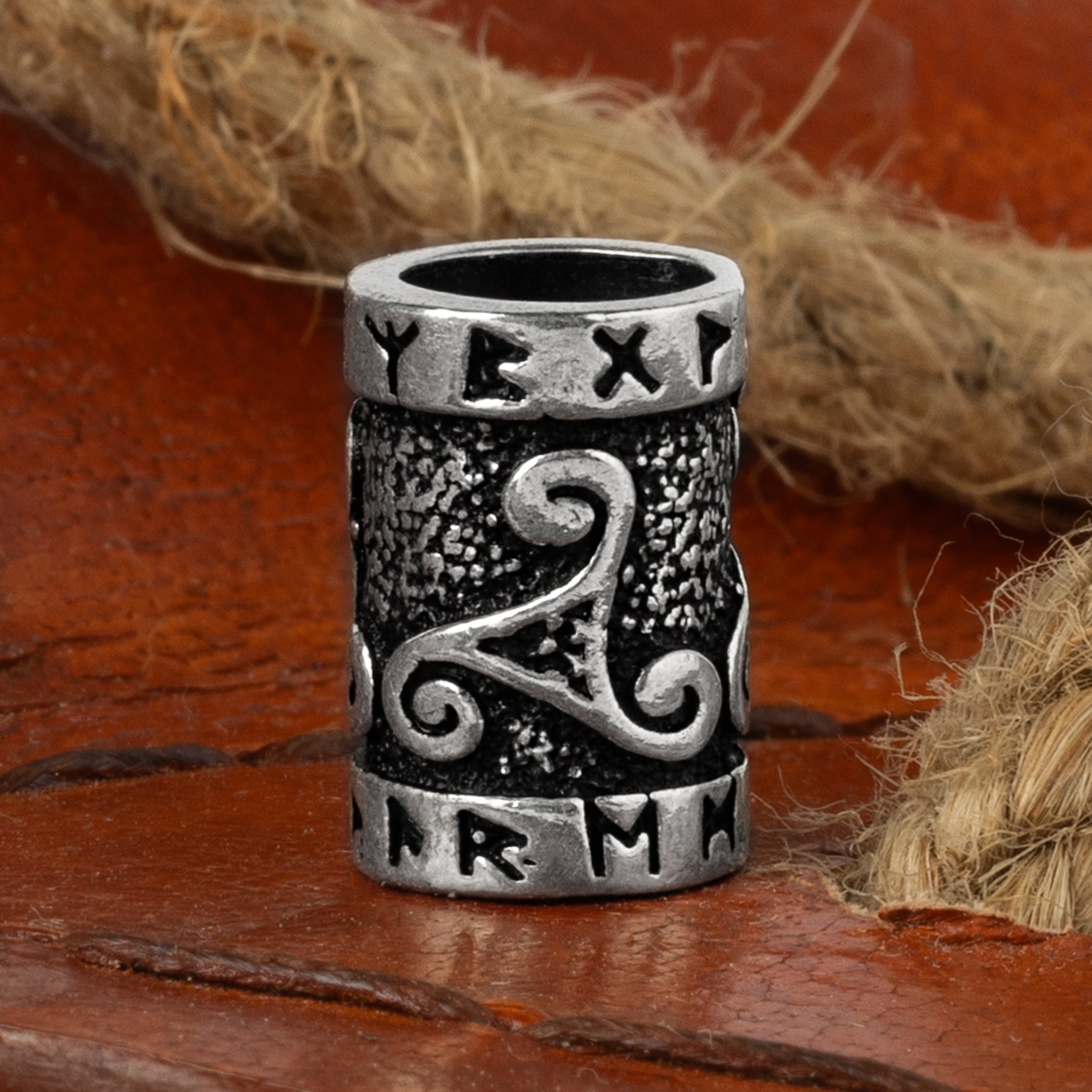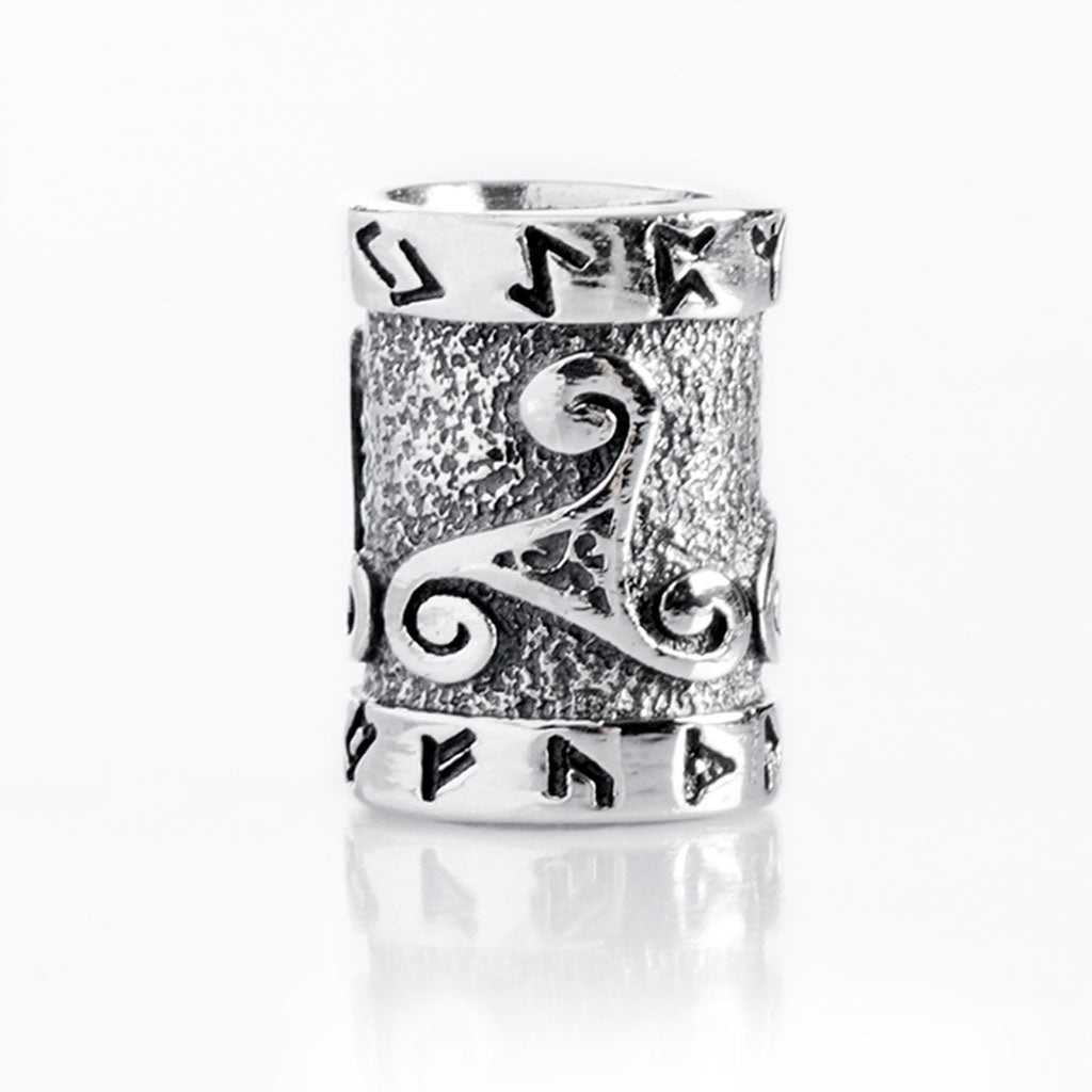 A large bead in Sterling Silver 925 with a Triskele design and the Elder Futhark runic alphabet.