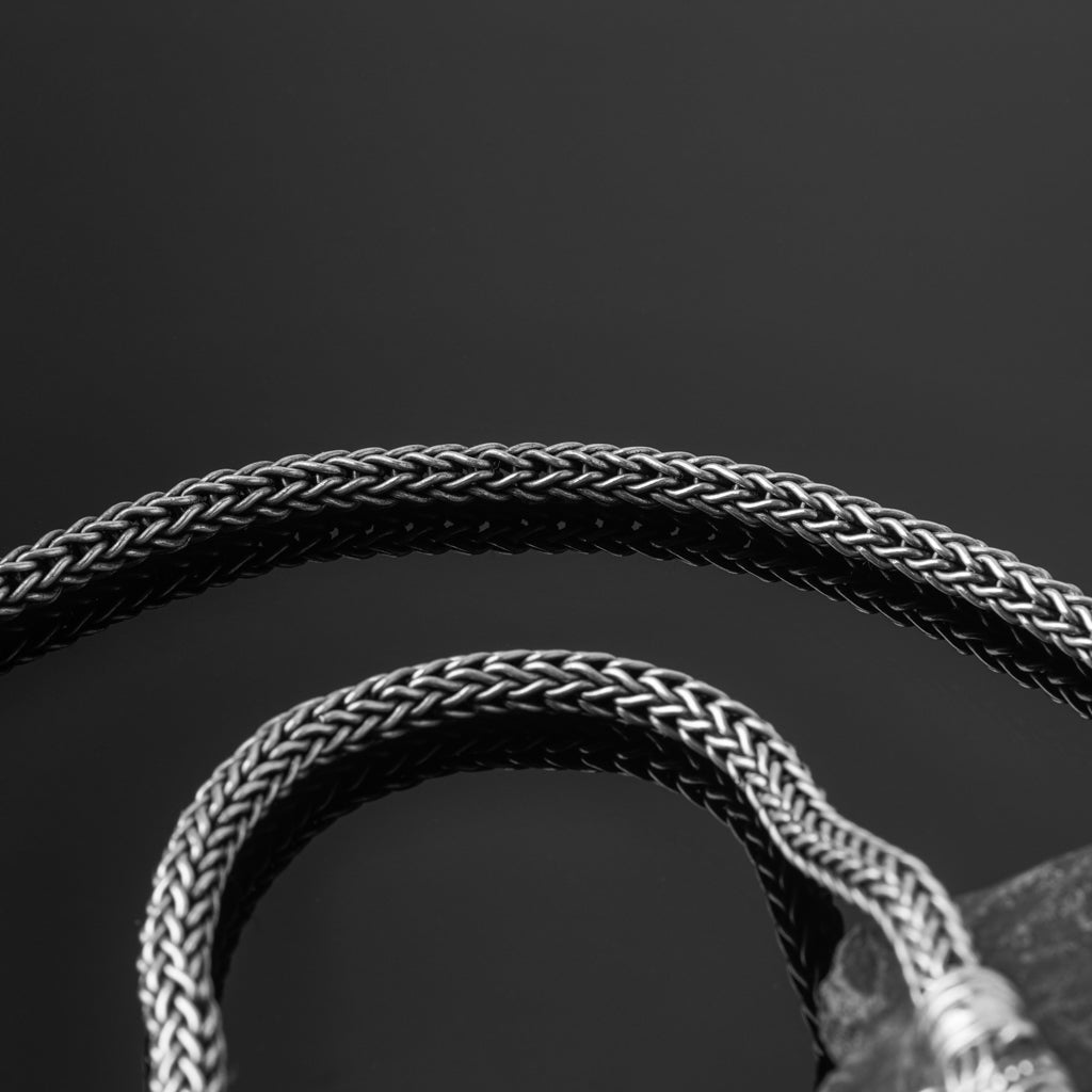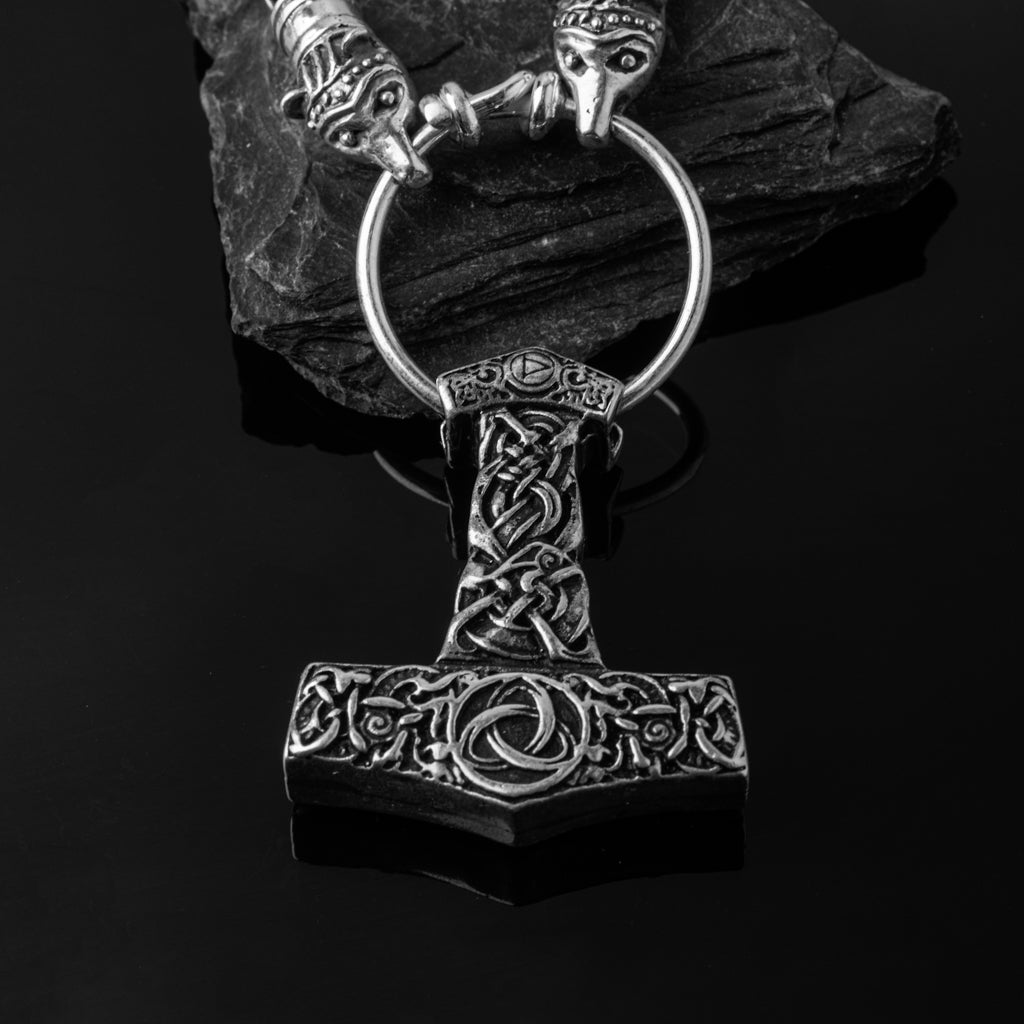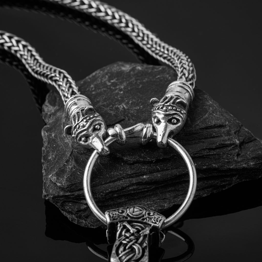 Vikings used necklaces with animals or beasts biting onto a ring where pendants were hung. This Sterling Silver variant is truly a majestic piece, ending bear heads based on the unique find in Eketorp, Sweden in 2017. The bears bite onto a ring with a Thor's Hammer covered by with lindworm designs, a Thurs rune and a triquetra symbol.