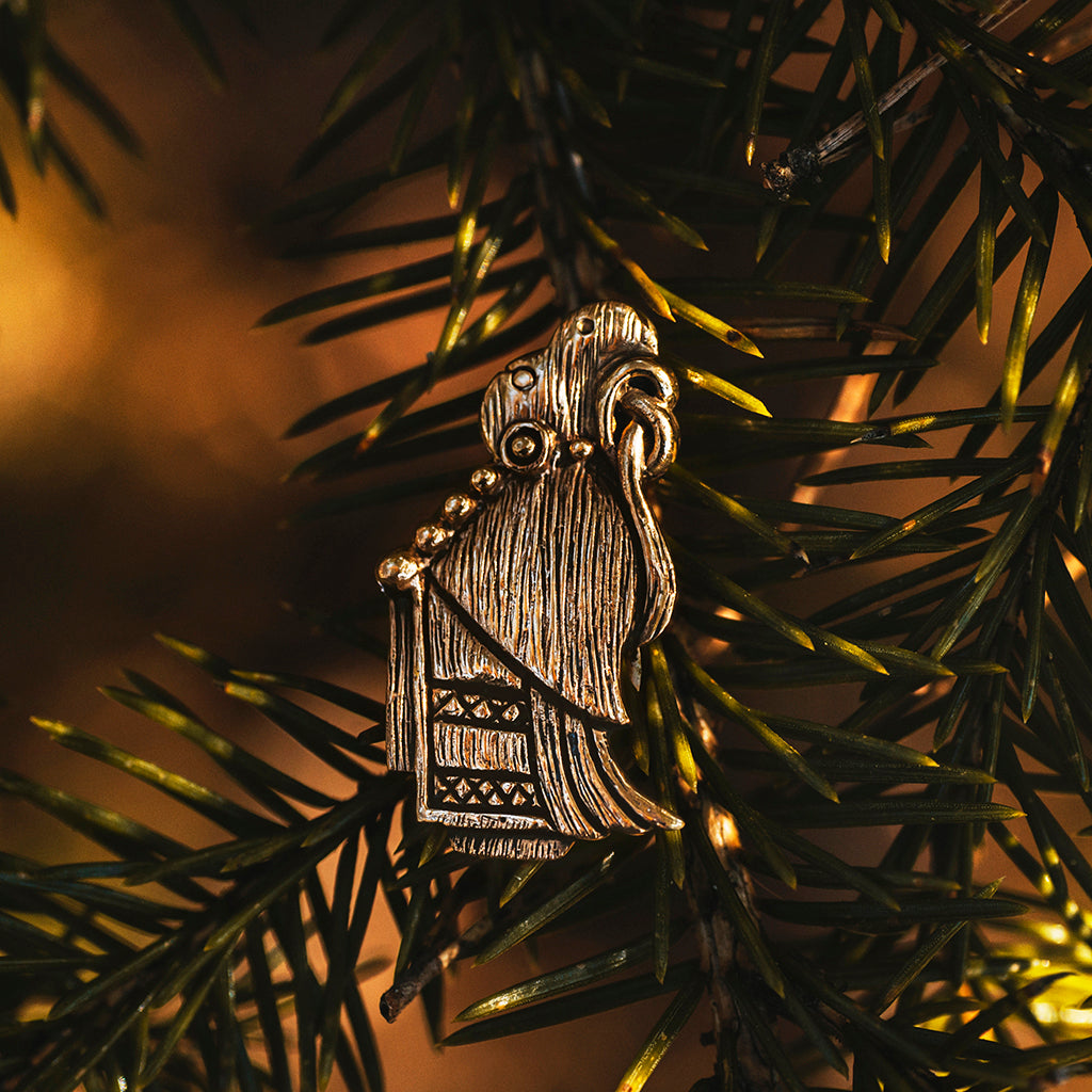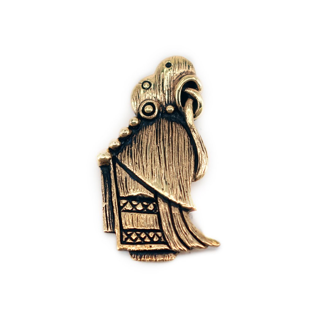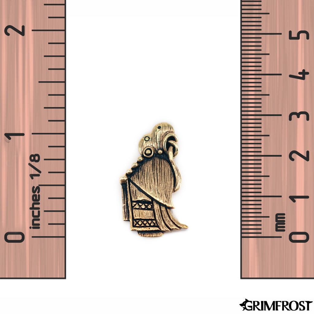Pendant made in solid bronze depicting what is believed to be a Valkyrie. It is based on the original Viking Age item found in Tuna, Uppland in Sweden. The back has a loop that allows it to be hung on a chain.