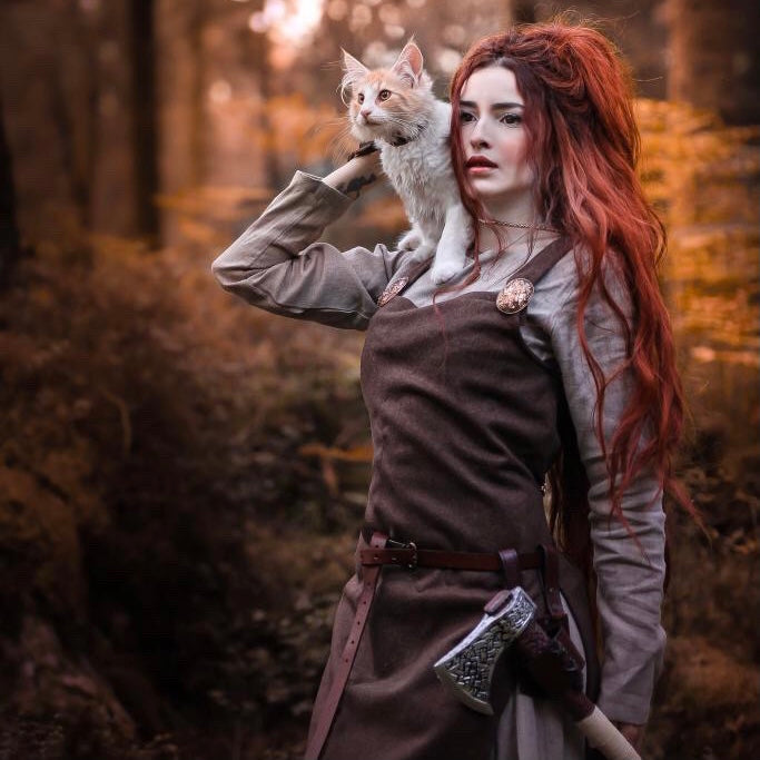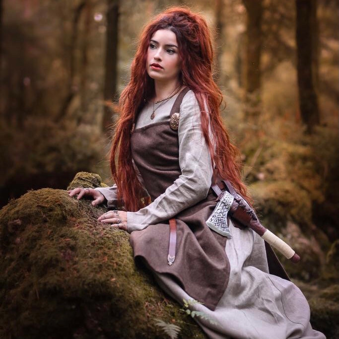 A really nice, high quality apron in wool with a matching linen dress. Known as a Smokkr, this type of dress was a common garment among the Viking women who combined it with a pair of turtle brooches with stringed beads. The brooches are used to fasten the shoulder straps in the front. They can also be stitched in place quite easily.