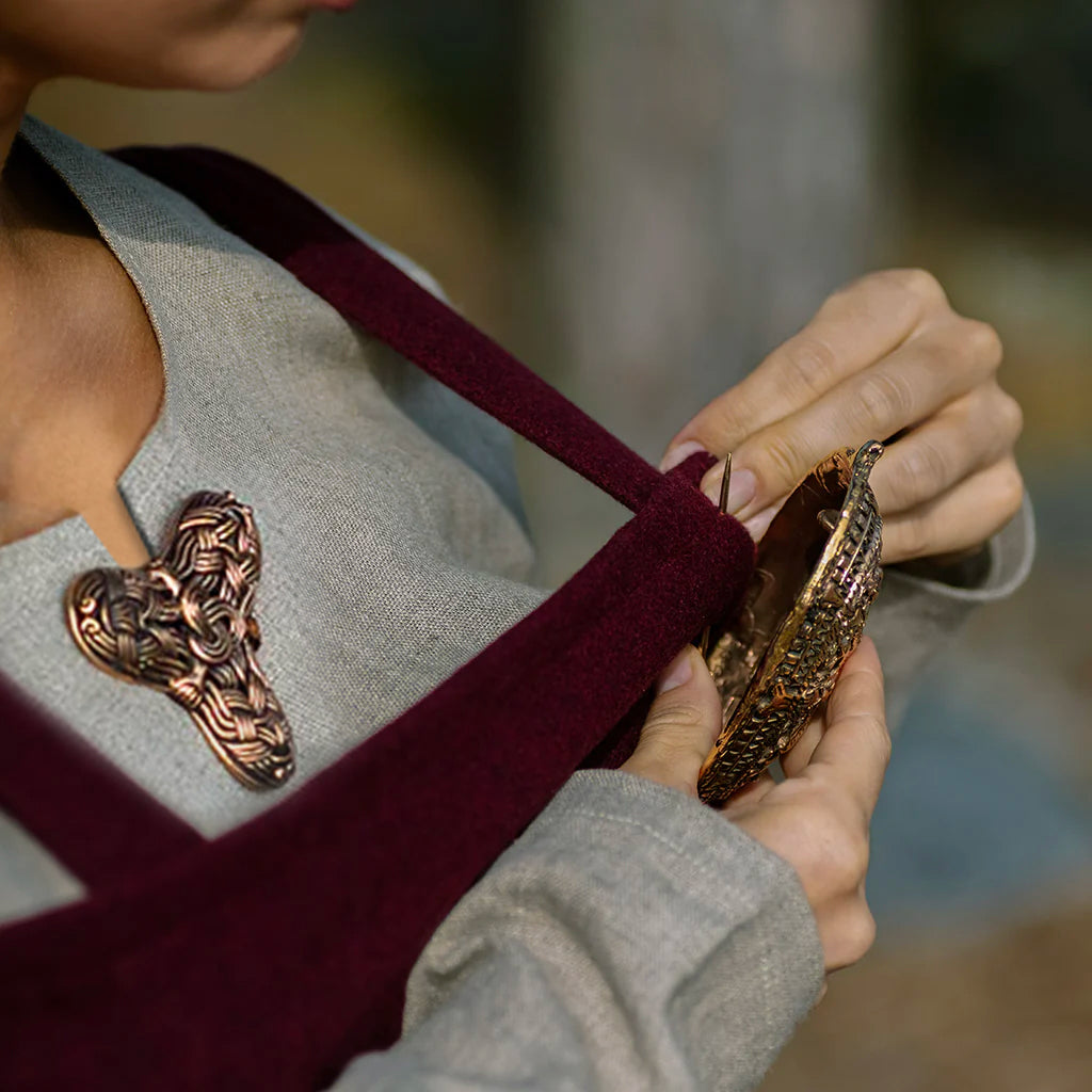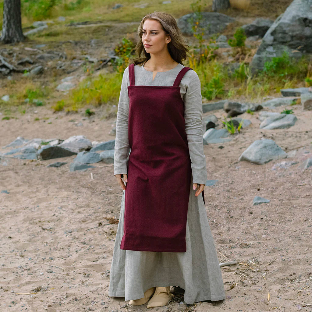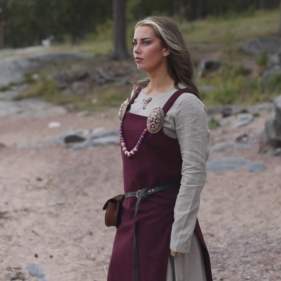 A really nice, high quality apron in wool with a matching linen dress. Known as a Smokkr, this type of dress was a common garment among the Viking women who combined it with a pair of turtle brooches with stringed beads. The brooches are used to fasten the shoulder straps in the front. They can also be stitched in place quite easily.