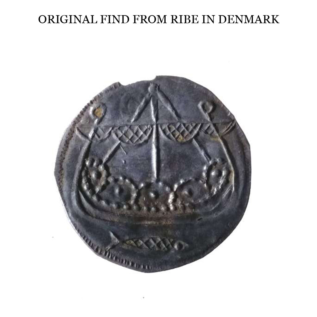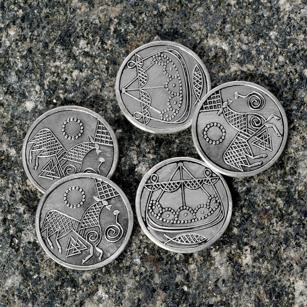 The coins are a reproduction of the rare 9th Century Viking Age coins found in Ribe, Denmark in 2018. The motifs are quite interesting: One side has a deer almost kissing a snake, with a Valknut symbol placed below the deer and what looks like a sun above it. The other side shows a Viking longship with a fish below it symbolising the sea. The deer is most likely Eikthyrnir - a stag that stands on the roof of Valhalla, the hall of Odin, where warriors dying in battle end up. The Valknut symbol would thus represent Valhalla.