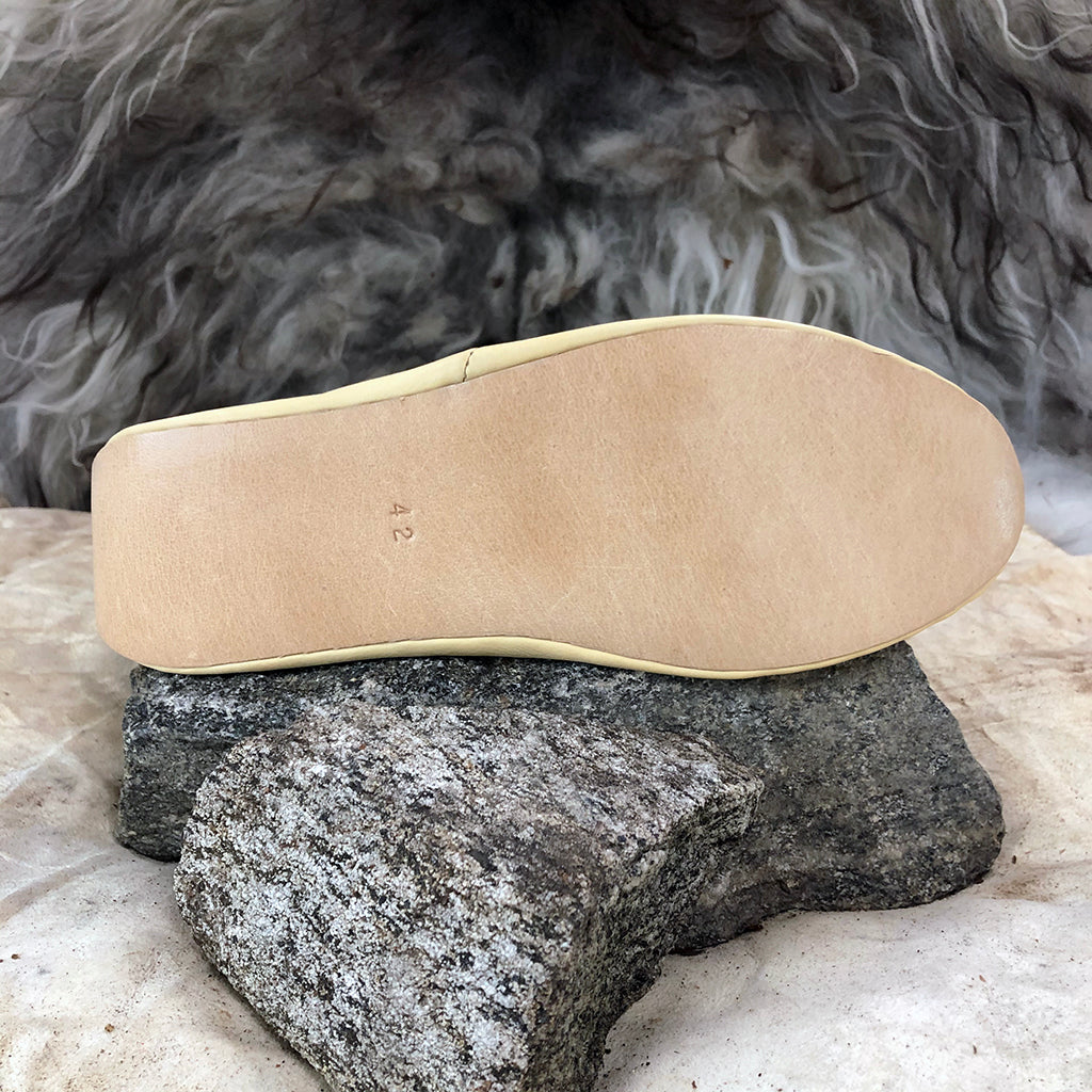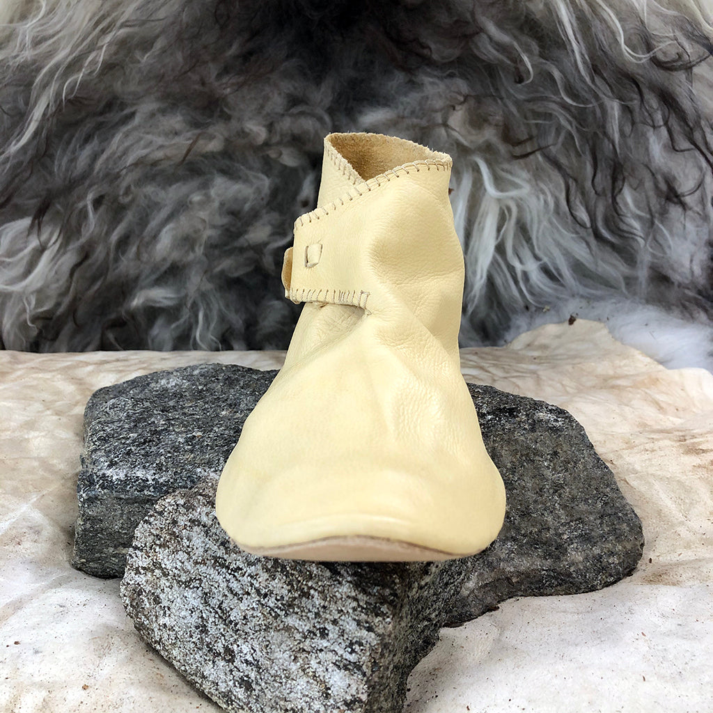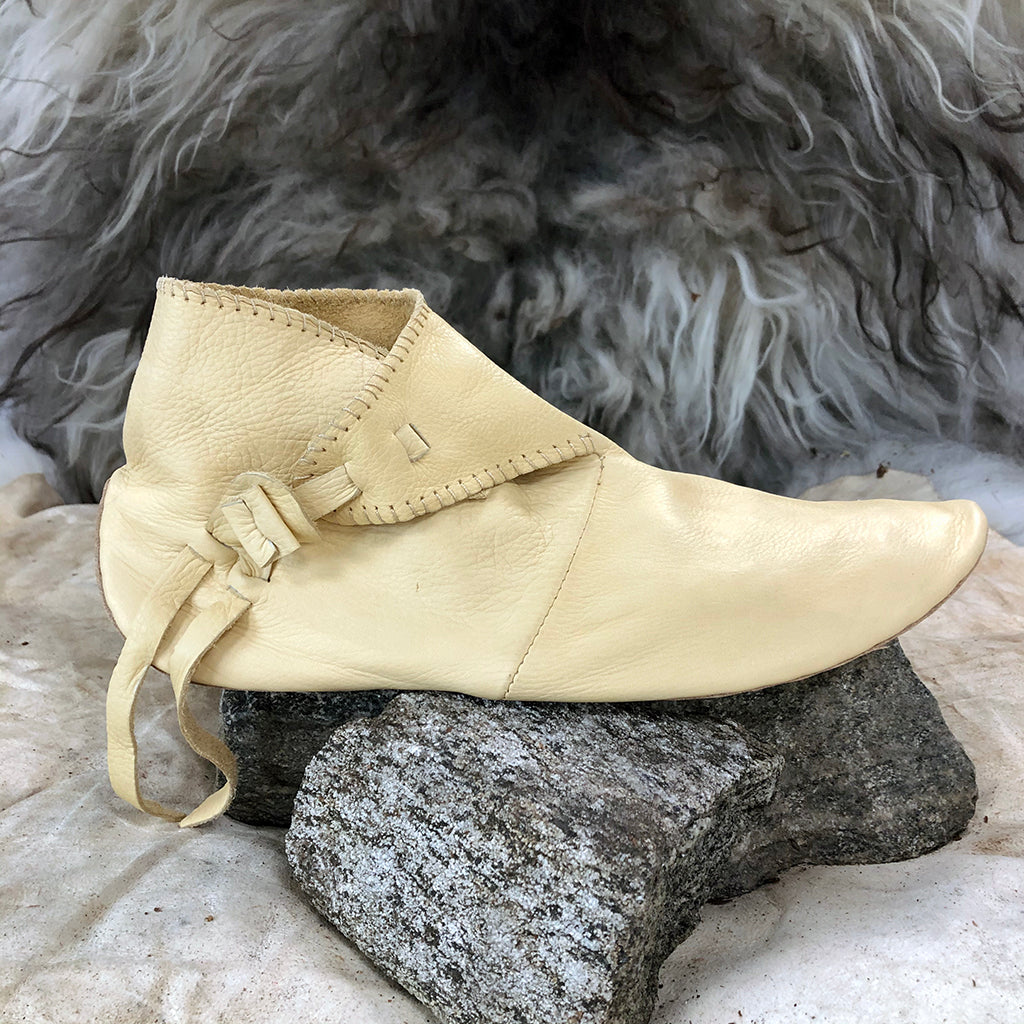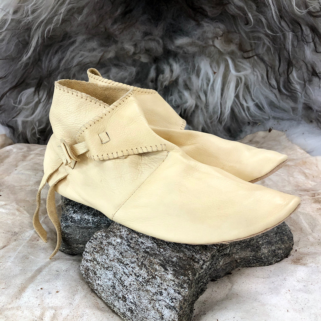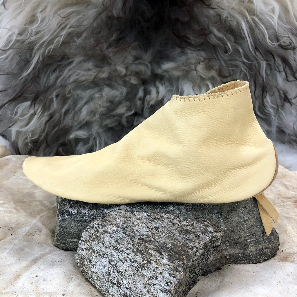 Handmade Viking turnshoes that were a common design during the Viking Age. They come with an adjustable toggle, just as the historical shoes. The upper leather is thin and soft, whilst the soles are thick and sturdy and covers the heel offering extra durability. Measurements of each size are found in the size guide.