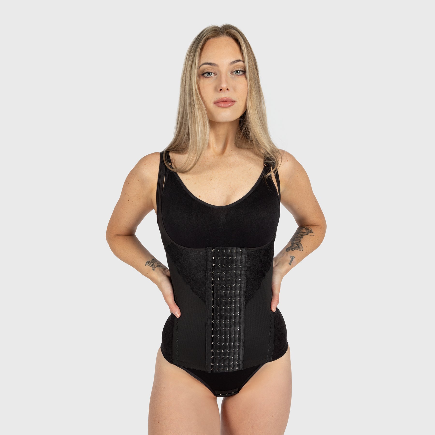 Wear this waist shaping corset for strong compression and targeted control along the waist and tummy and to accentuate your body’s natural curves. The busk is adjustable with six rows of hooks. The corset is made of mesh fabric, so it doesn't get too hot when wearing it under clothing.